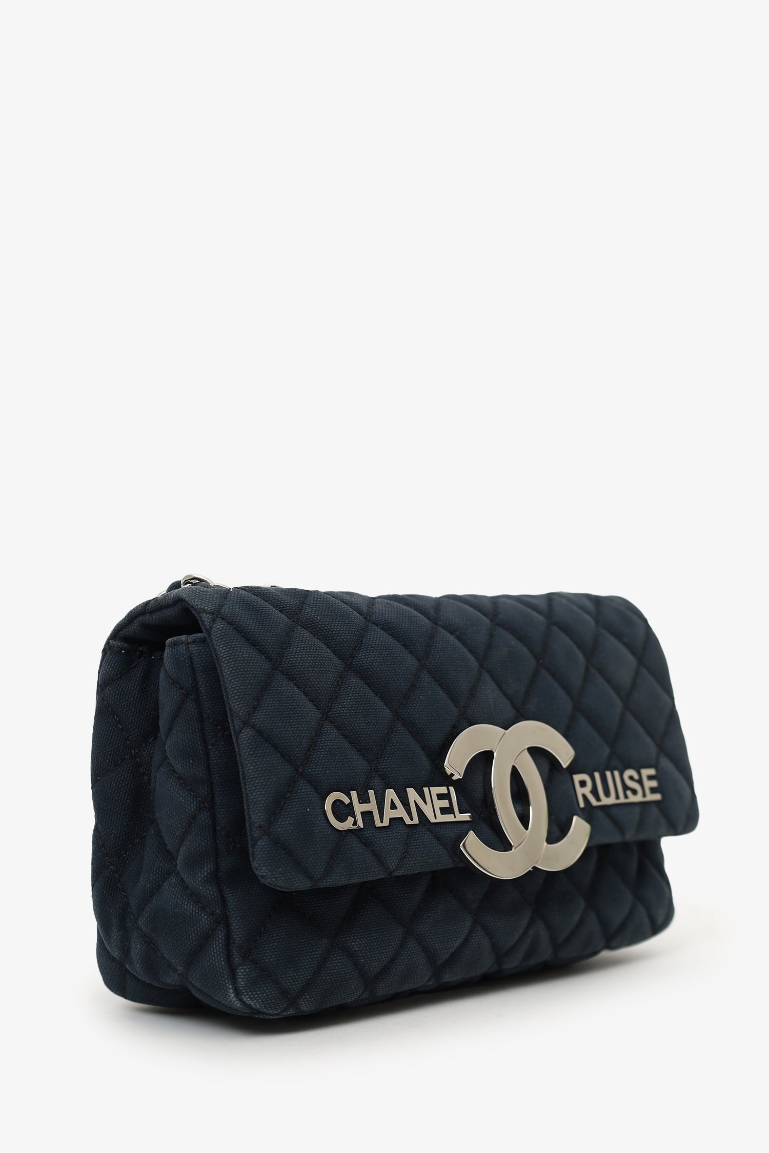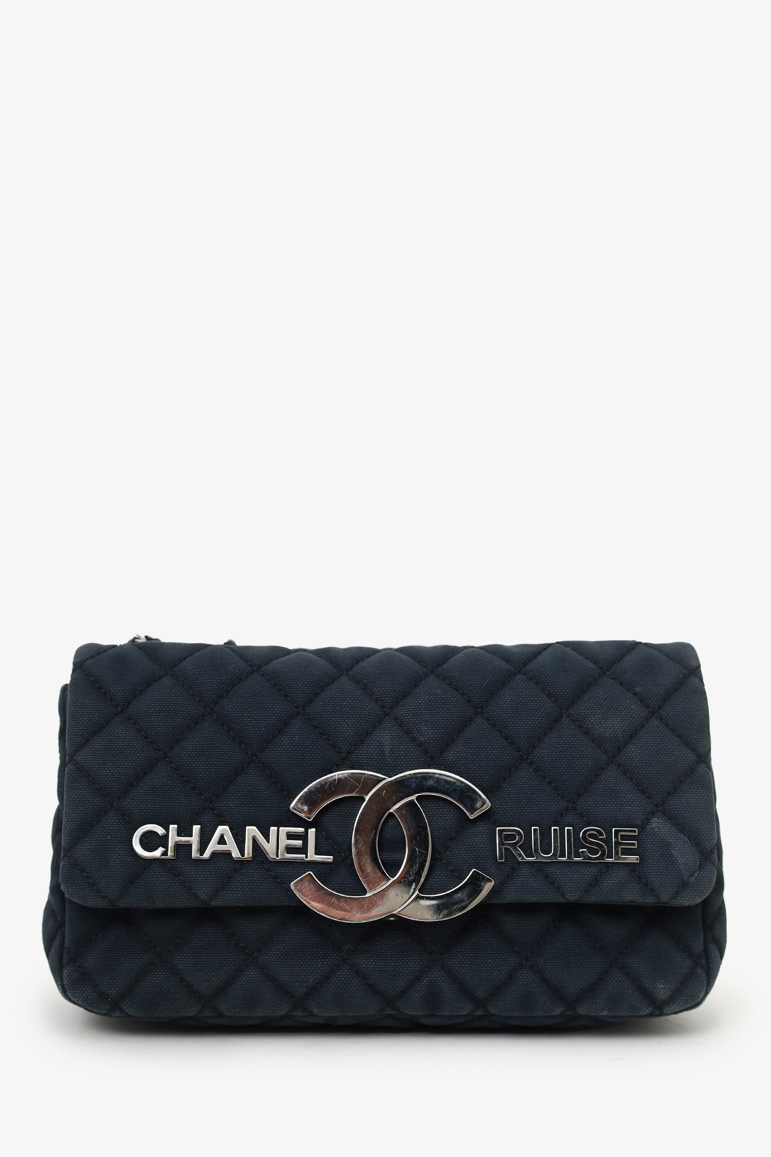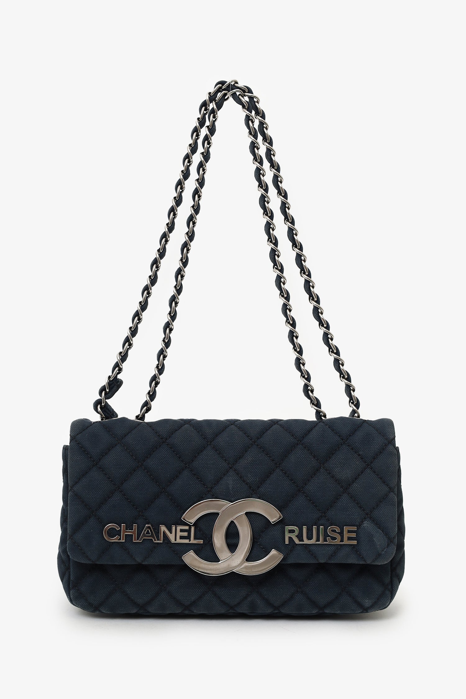 Refresh availabilityPre-Loved Chanel™ 2008/2009 Navy Canvas CC Cruise Shoulder Bag. Front fold-over flap with flip-lock closure. Chainlink straps that be pulled into one long strap. Lined interior. 2 interior pockets; 1 slip and 1 zip. Silver-tone hardware. Tonal stitching.