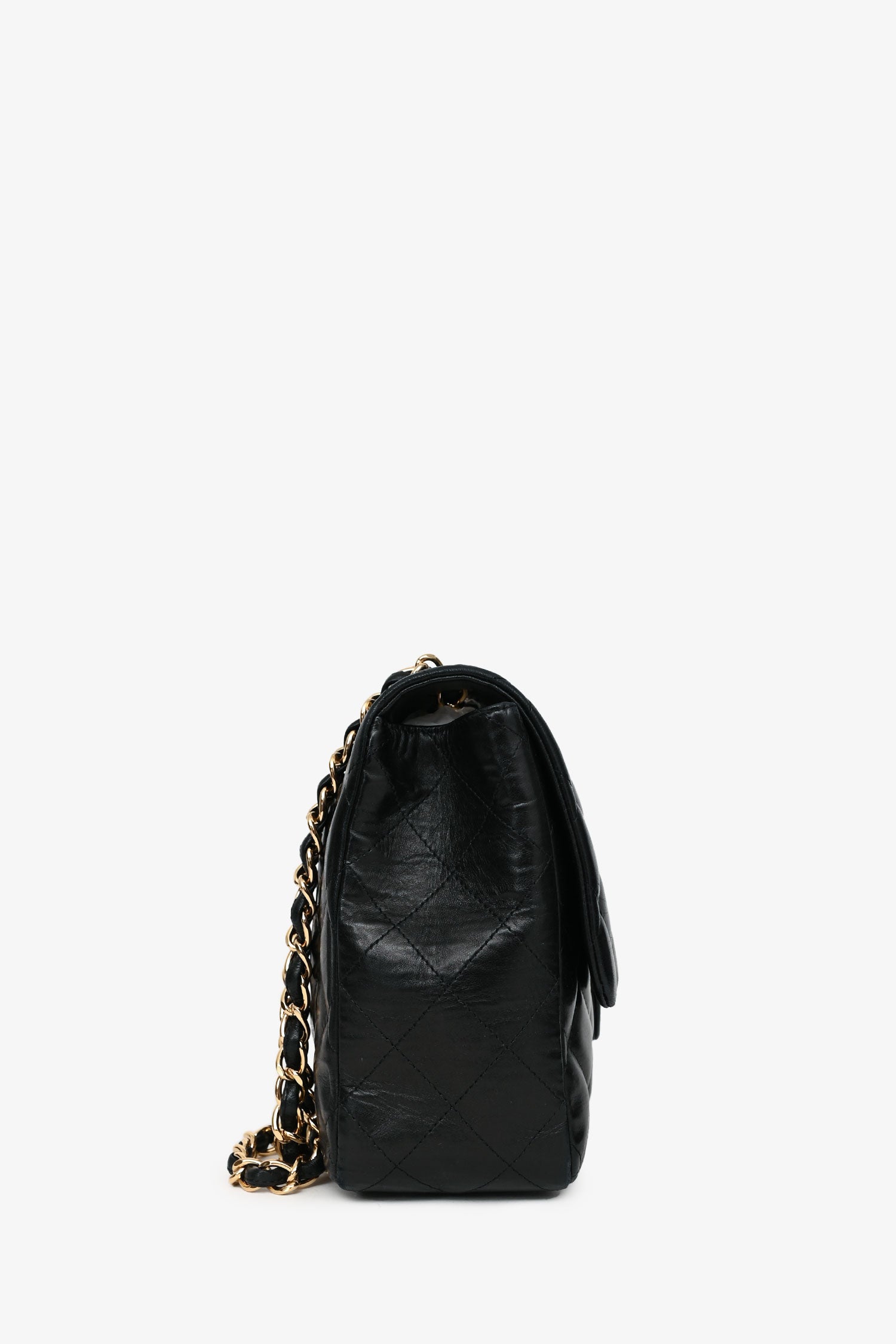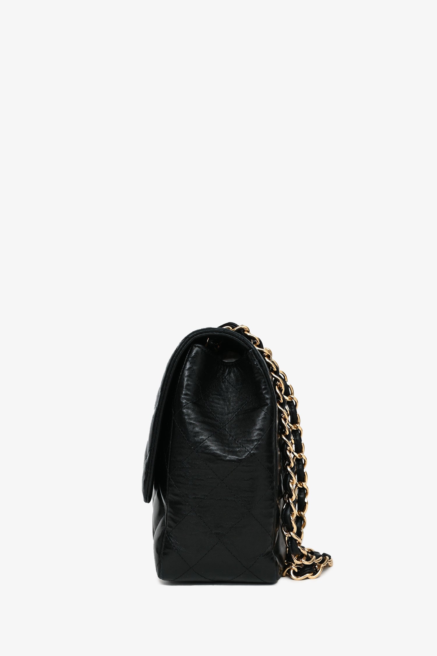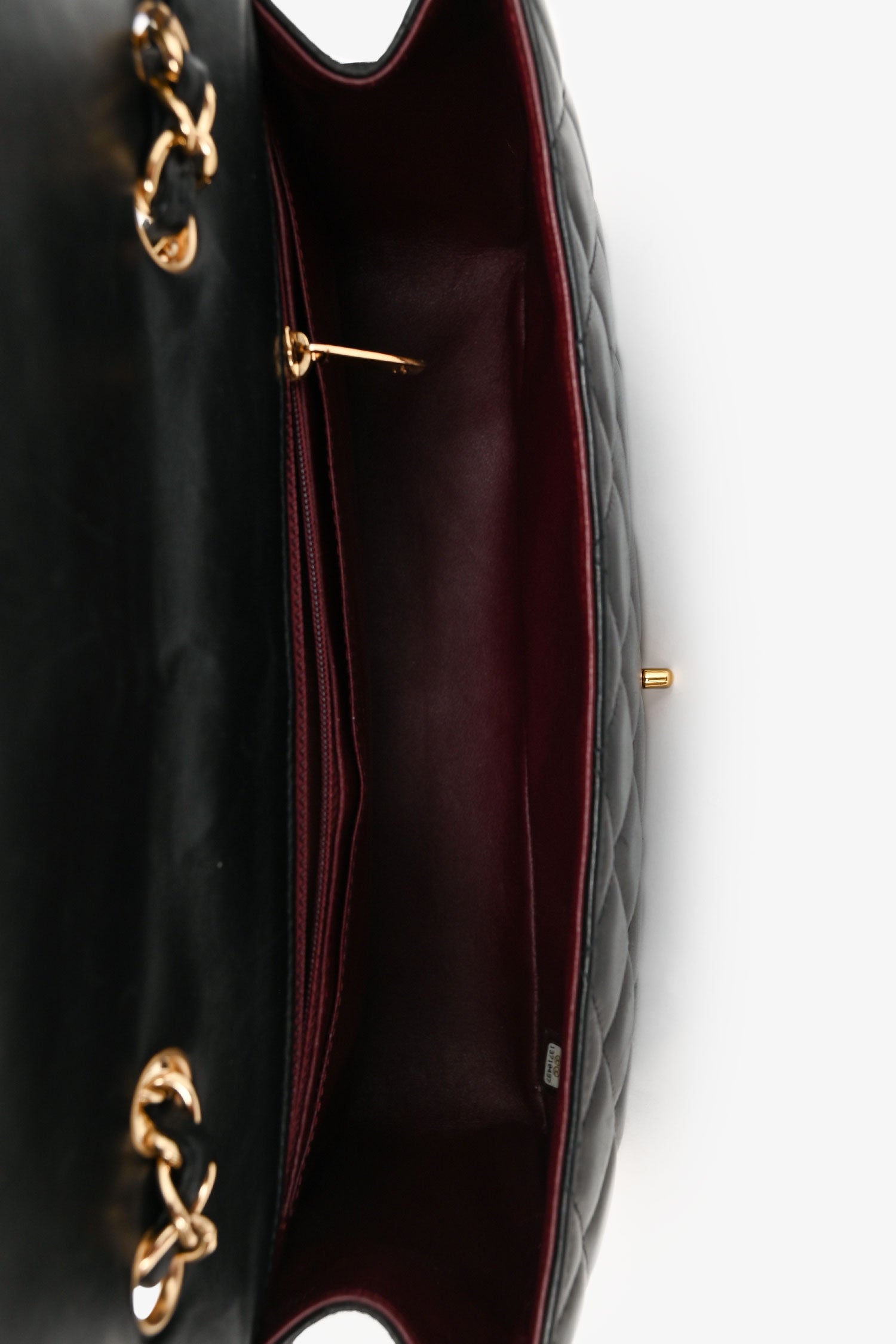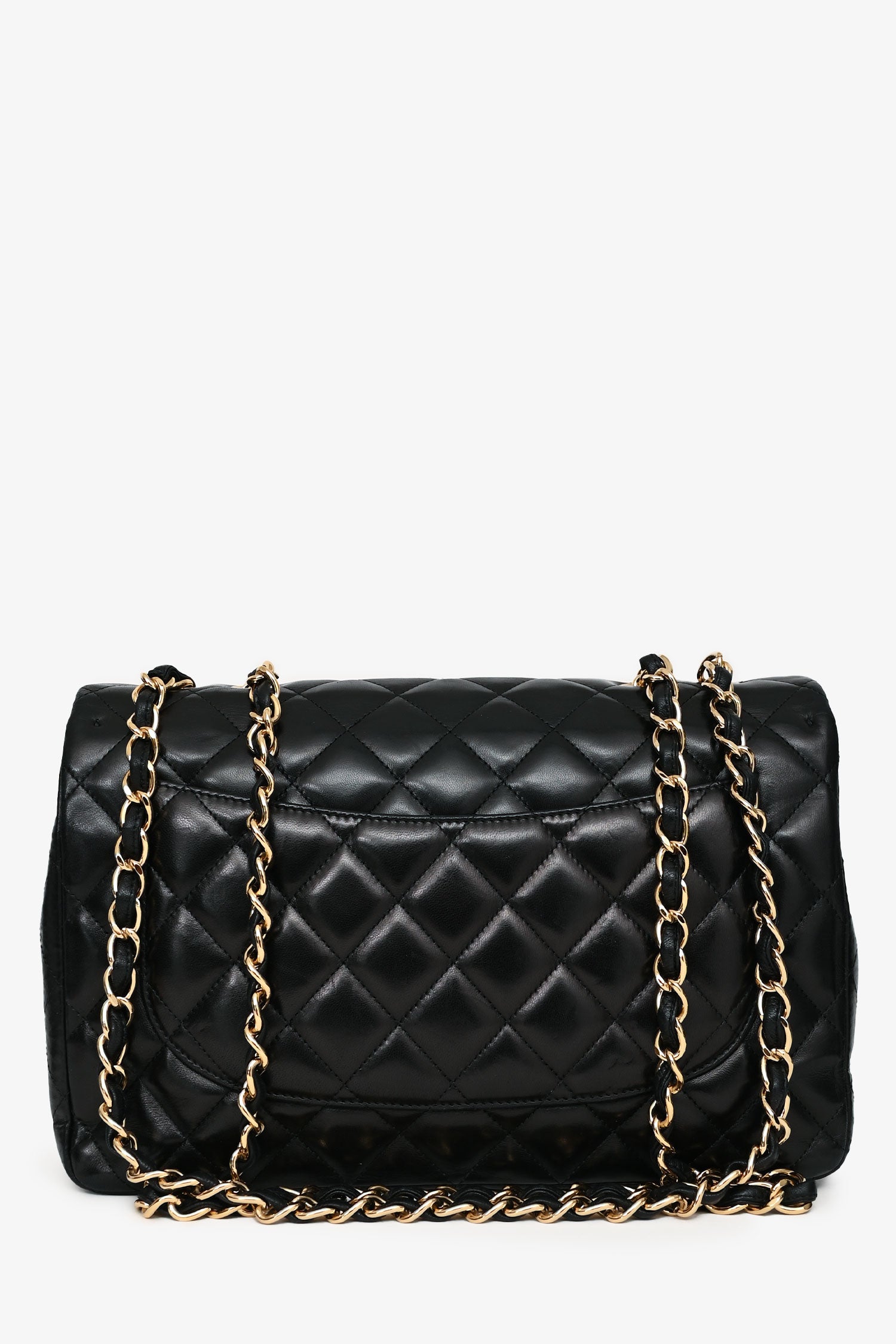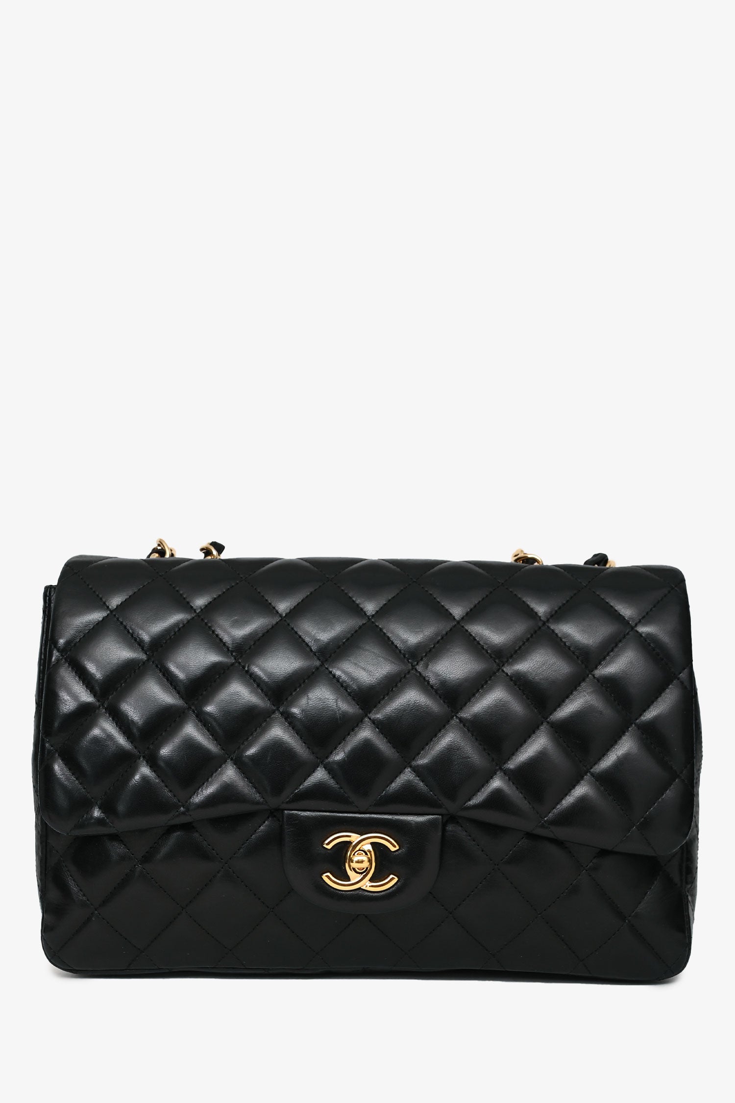 Refresh availabilityPre-Loved Chanel™ 2009-10 Black Quilted Lambskin Leather Single Flap Jumbo Bag. Gold hardware. Fold-over flap with a turn-lock closure. Chain-link and leather shoulder strap. Lined interior with a zipped and slip compartment. Tonal stitching.