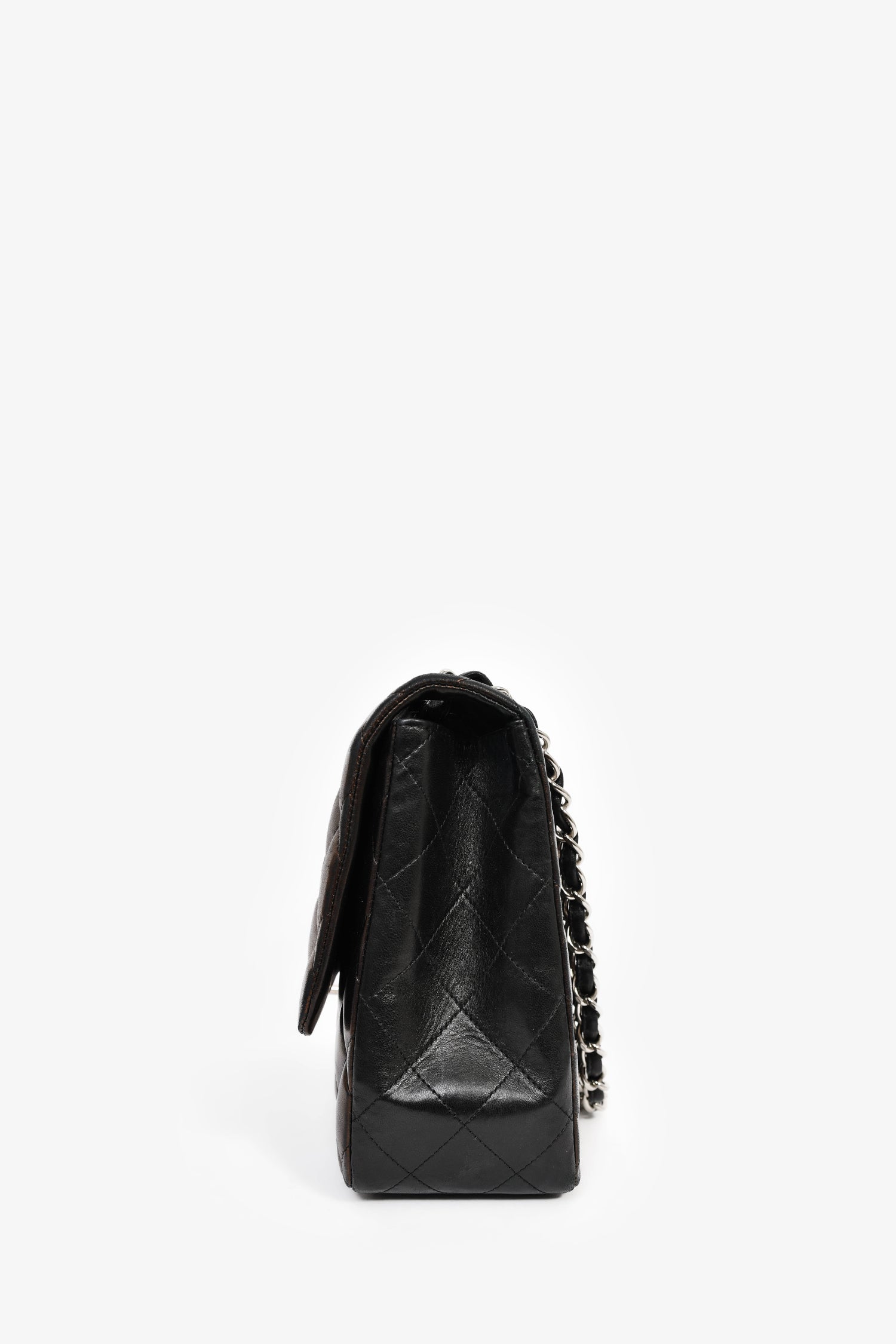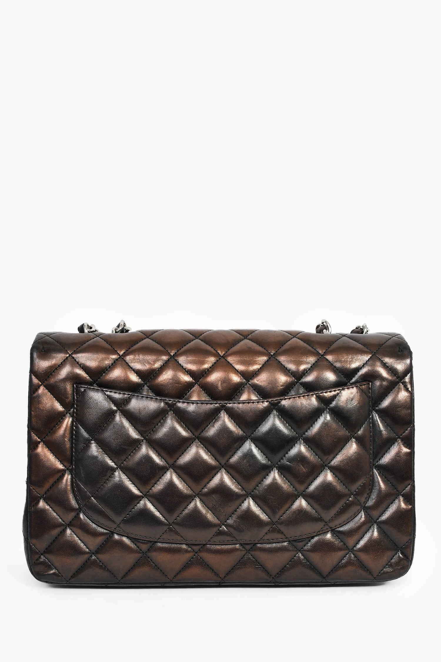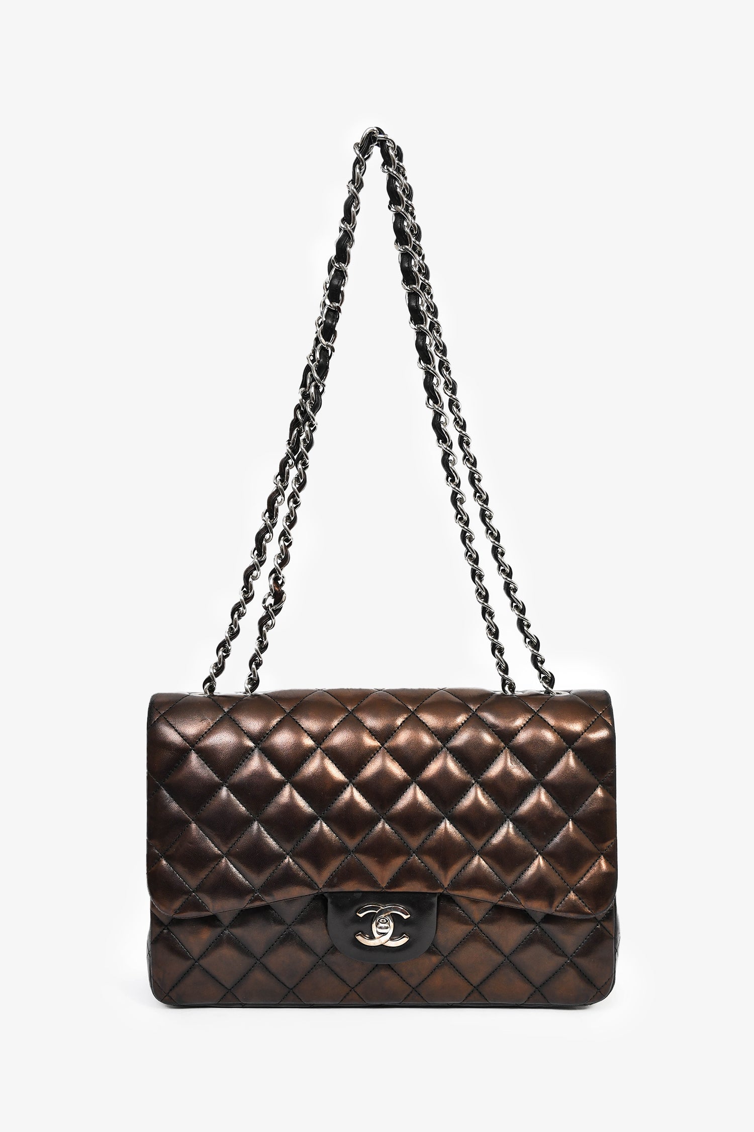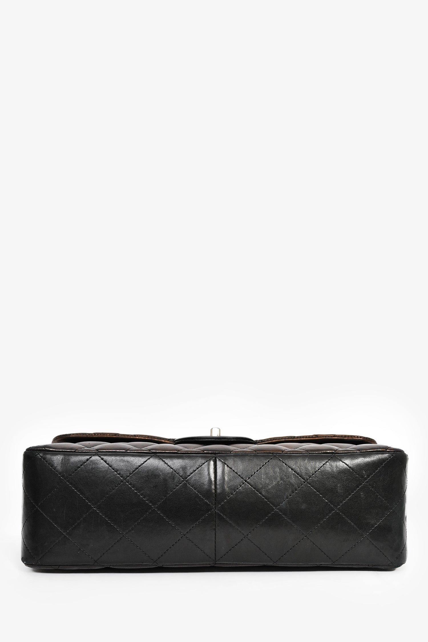 Refresh availabilityPre-Loved Chanel™ 2009/2010 Brown/Black Lambskin Leather Metallic Single Flap Jumbo Bag. Fold-over flap with a turn-lock closure. Chain-link and leather shoulder strap. 1 exterior slip compartment. 3 compartments: 1 main, 1 slip, and 1 zipped. Silver-tone hardware. Tonal stitching.