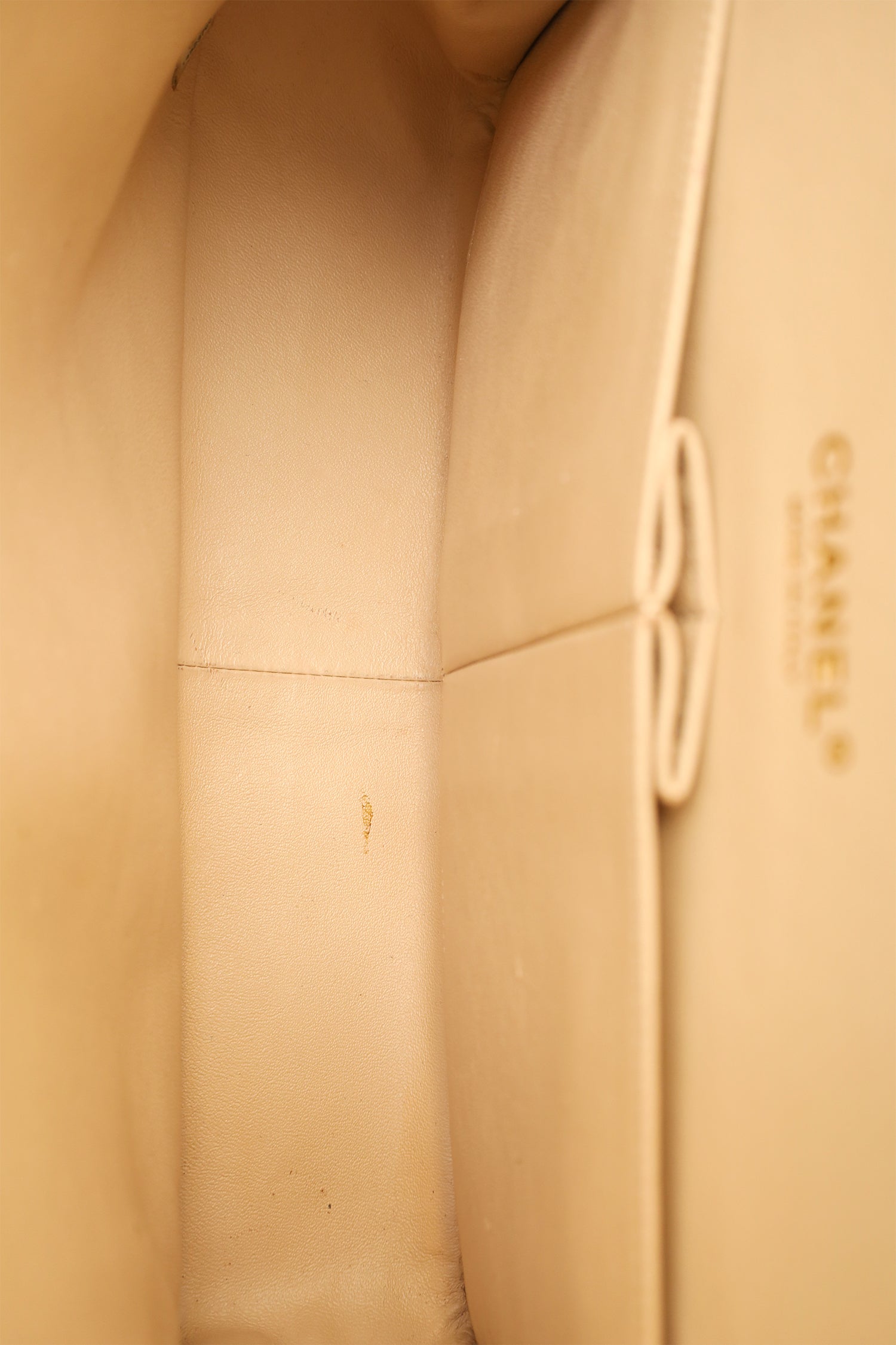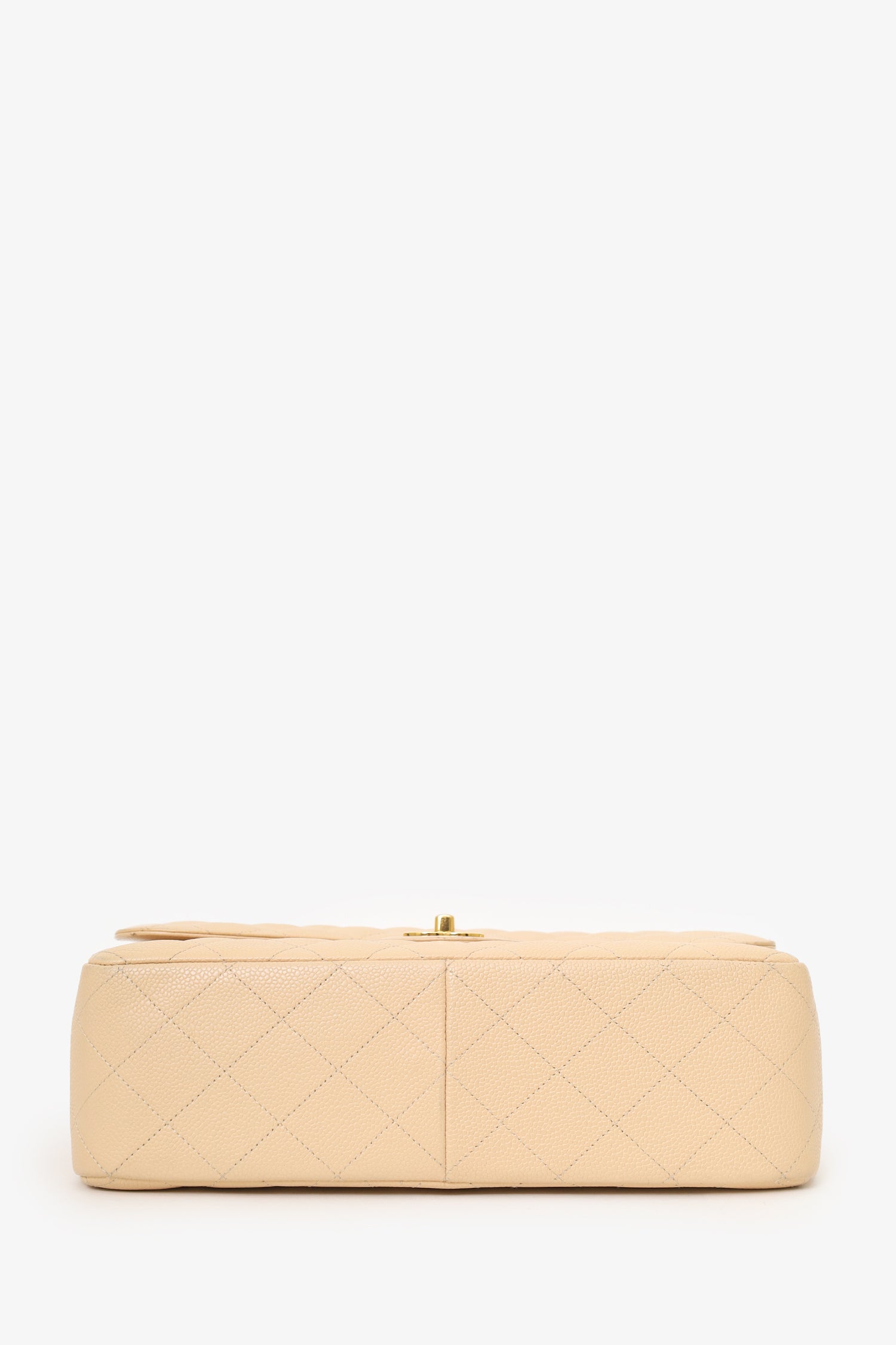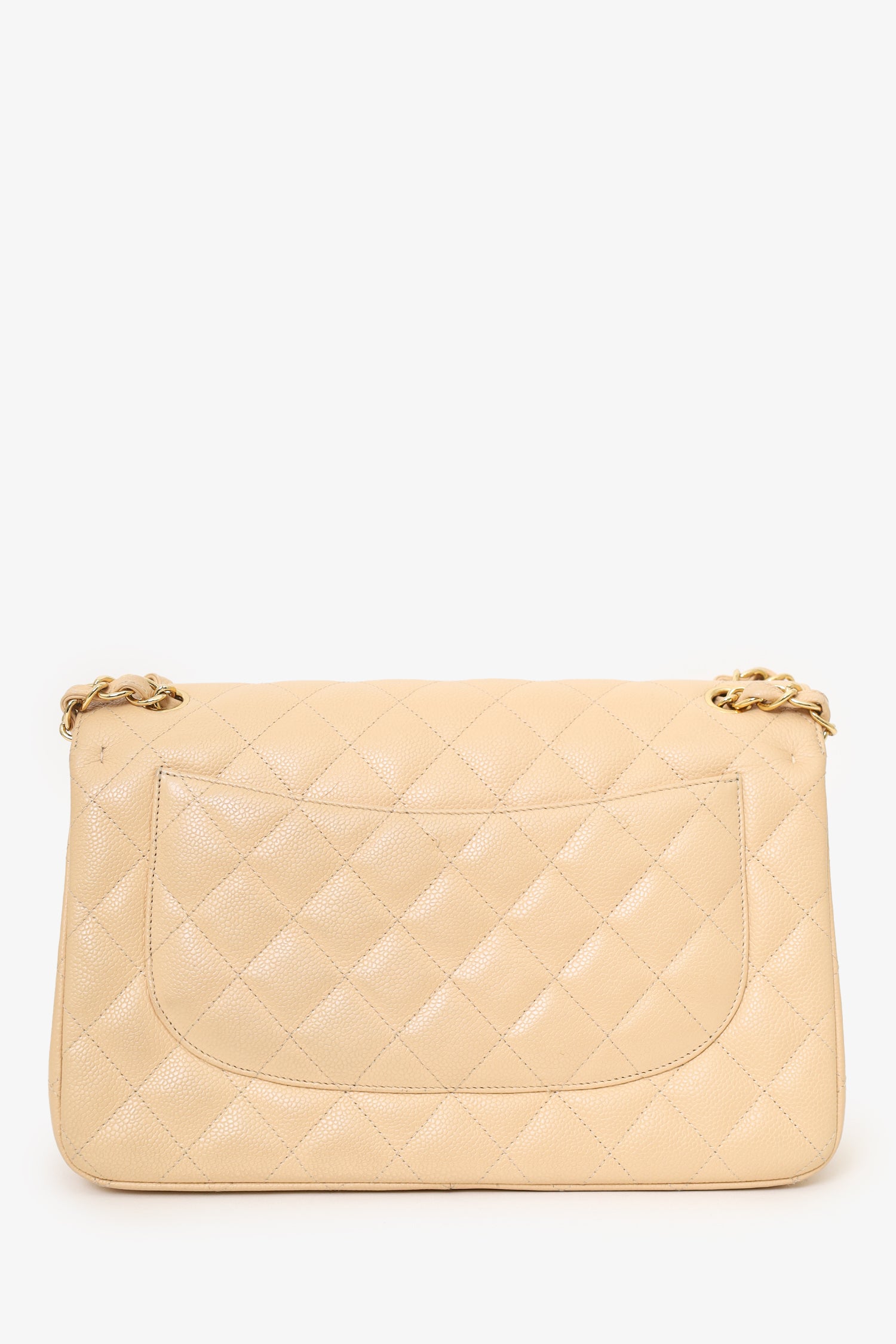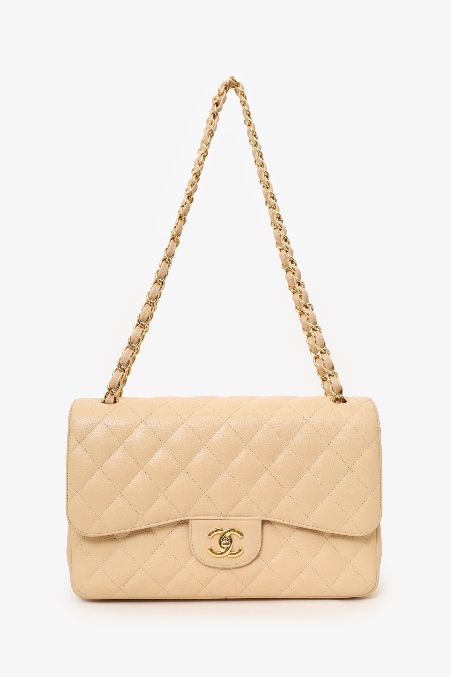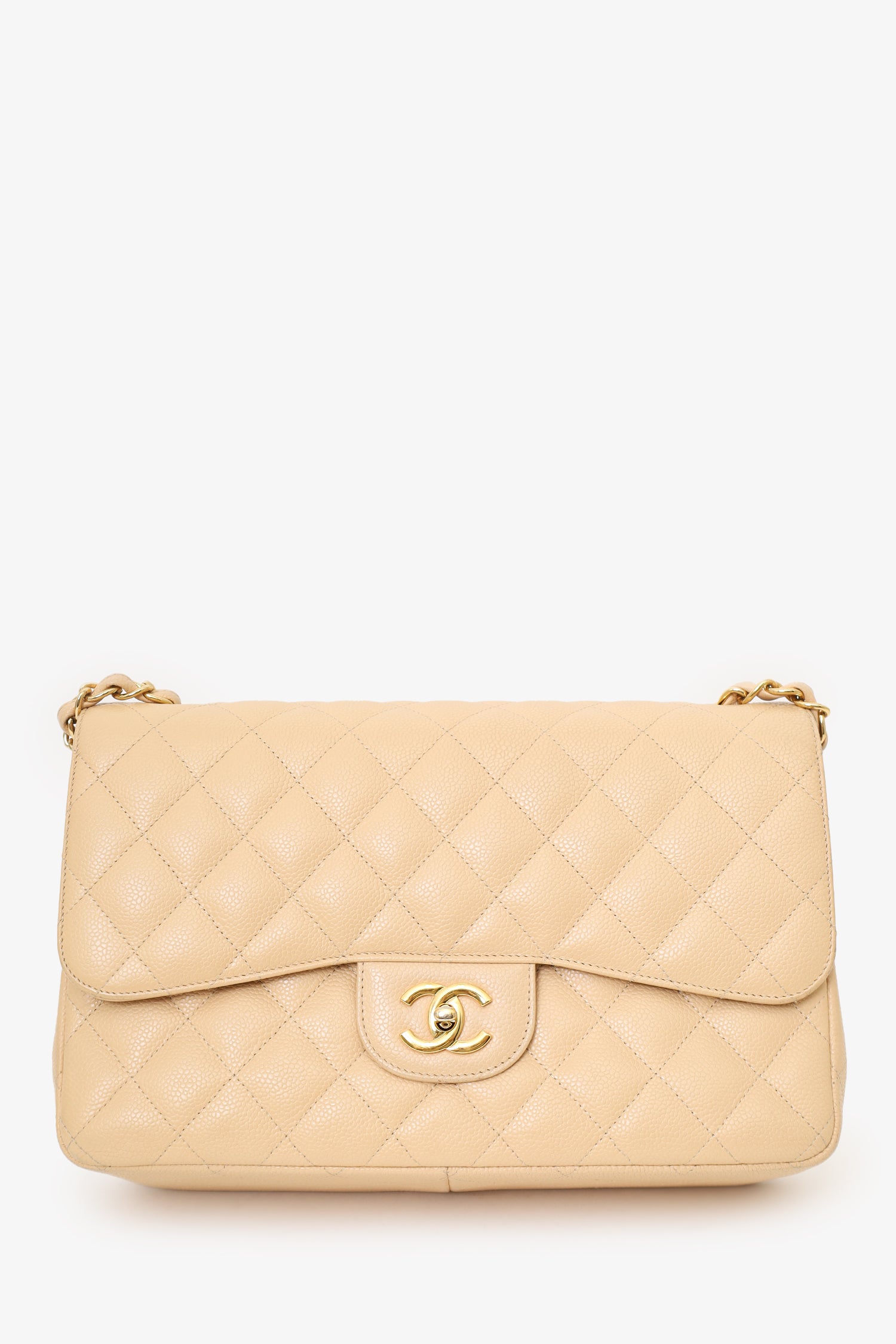 Refresh availabilityPre-Loved Chanel™ 2010-11 Beige Caviar Leather Jumbo Classic Double Flap Bag. Front fold-over flaps; Outer flap with turn-lock closure, inner flap with snap button closure. Twin chainlink shoulder straps that can be pulled in and extended to one long strap. Single rear exterior slip pocket. Leather-lined interior. 2 interior compartments; front compartment with 1 large open pocket. 2 interior slip pockets with single lipstick compartment. Back compartment has 1 zip pocket on underside of top fold-over flap. Gold-tone hardware. Tonal stitching.
