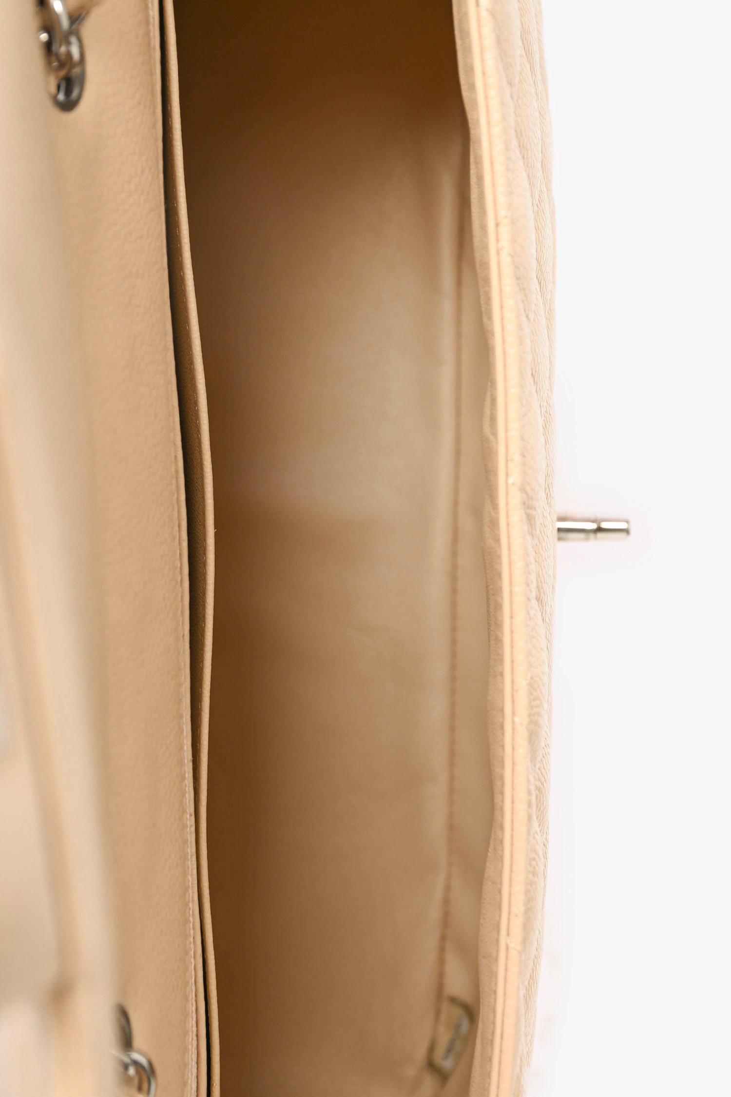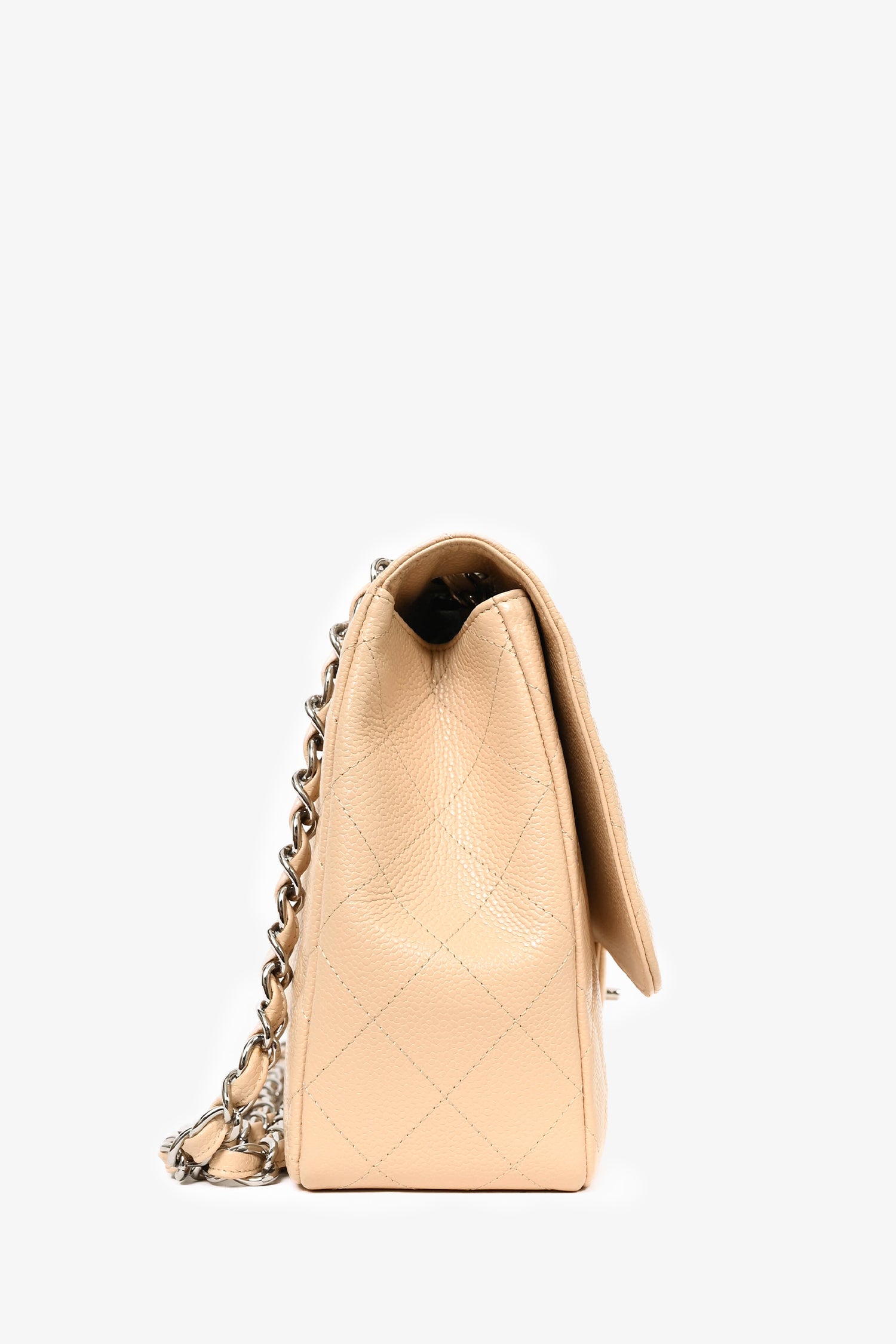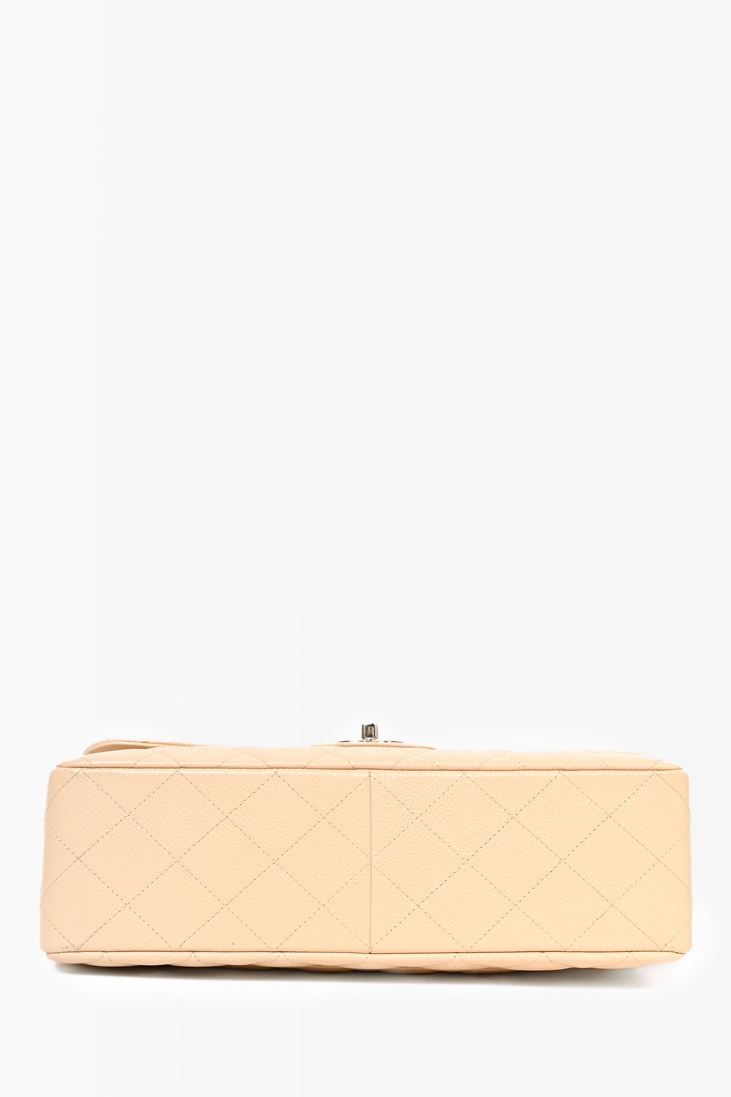 Refresh availabilityPre-loved Chanel™ 2010/11 Beige Caviar Leather Jumbo Classic Flap Bag. Top flap with turn lock closure. Slip chain. 2 interior pockets; 1 slip and 1 with zip closure. Beige interior leather lining. Silver-tone hardware. Tonal stitching.