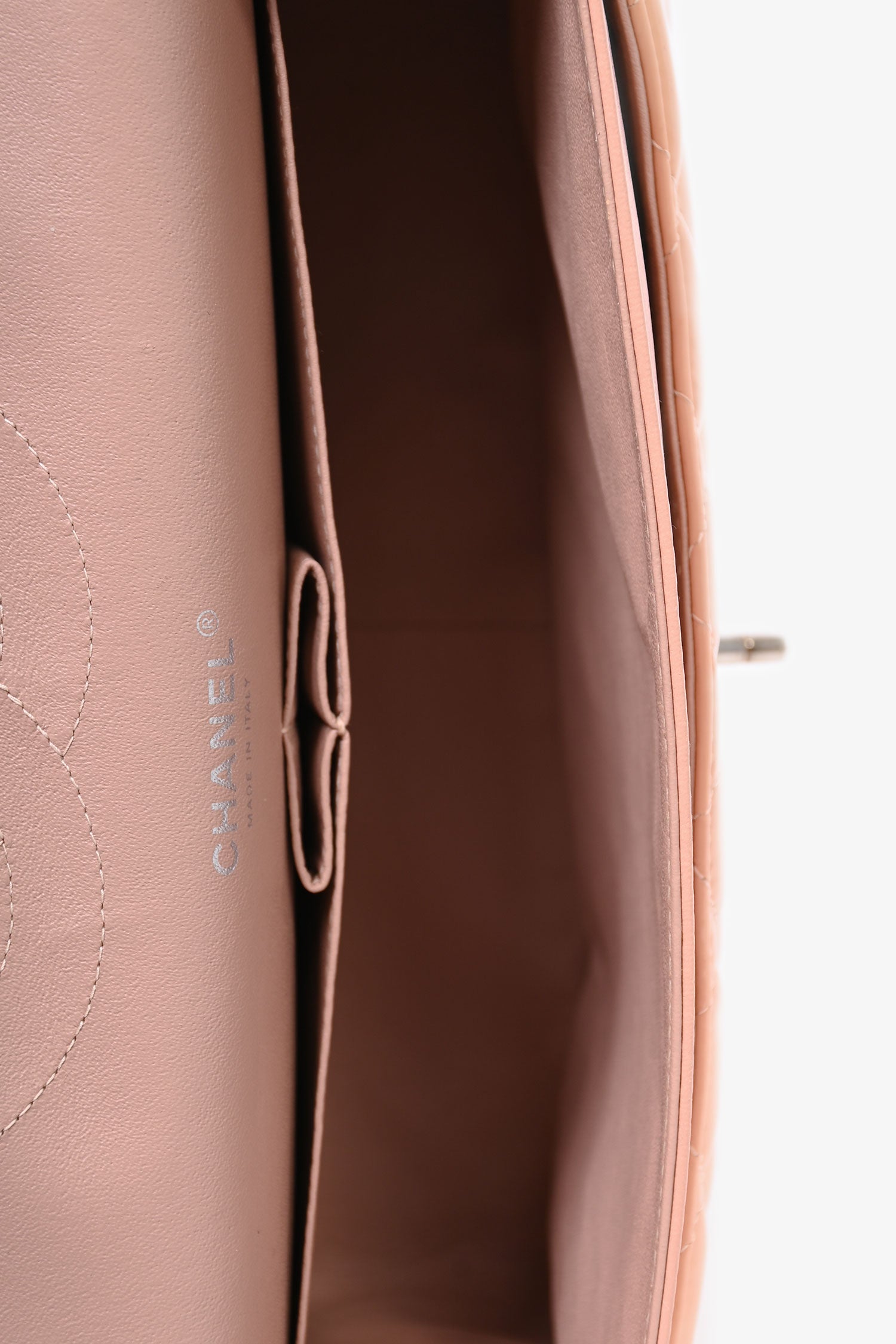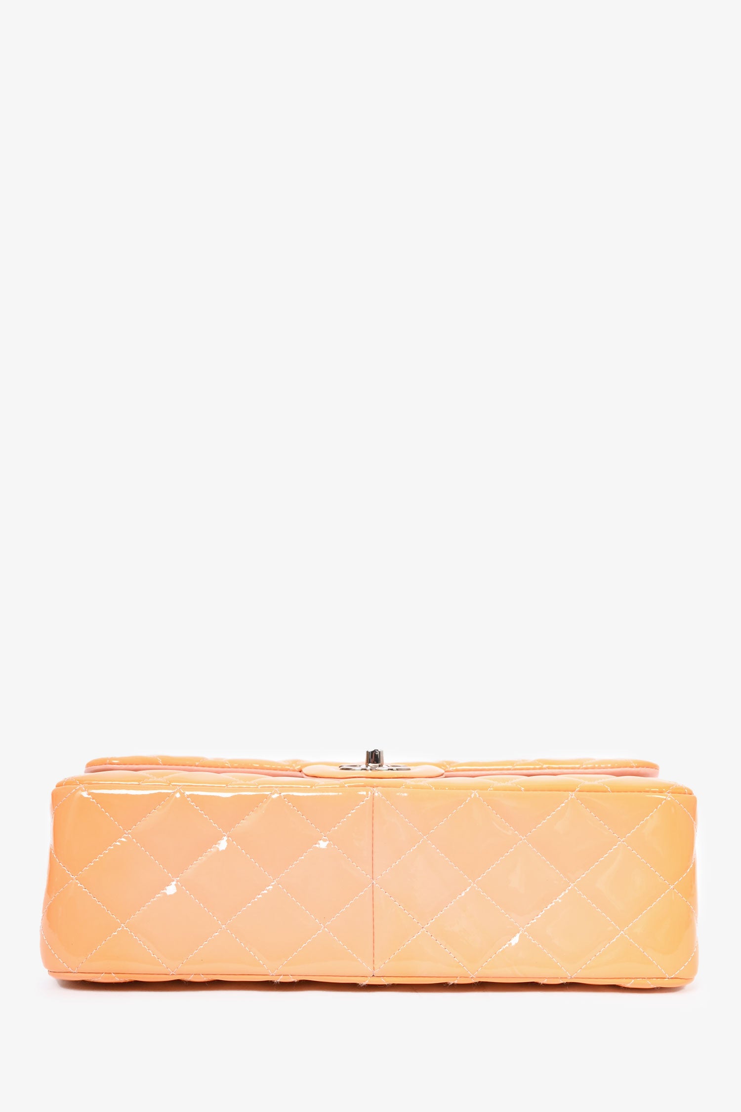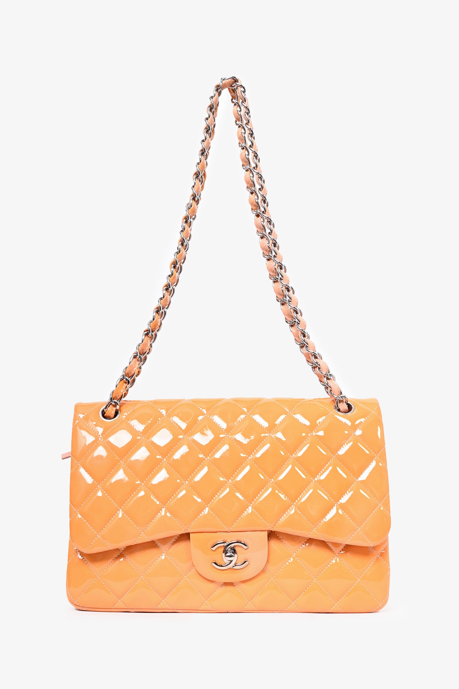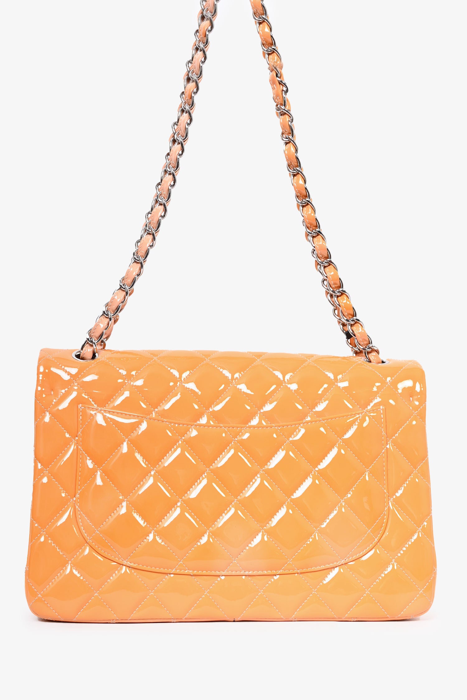 Pre-Loved Chanel™ 2011 Orange Patent Leather Jumbo Double Flap SHW. Fold-over with turn-clock closure. Interior flap pocket with zipper. Interior bag with flap and snap button closure. Exterior back slip pocket. Three interior compartments. An open interior compartment with 4 slip pockets. Silver-tone hardware. Tonal stitching.