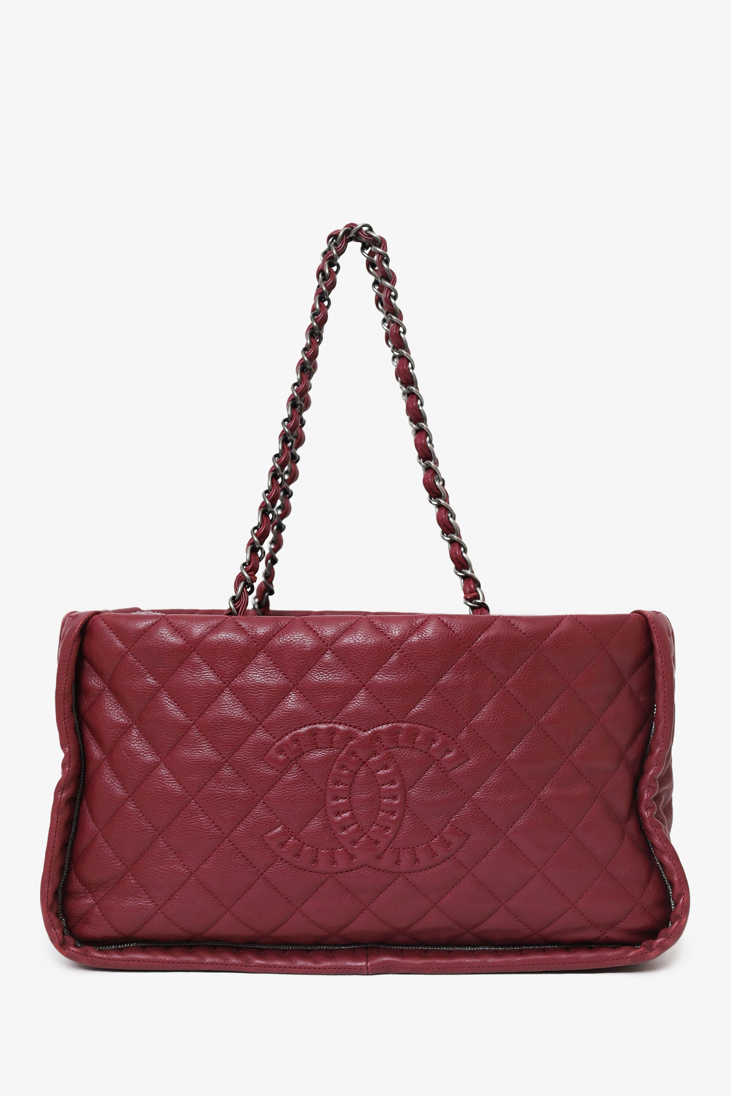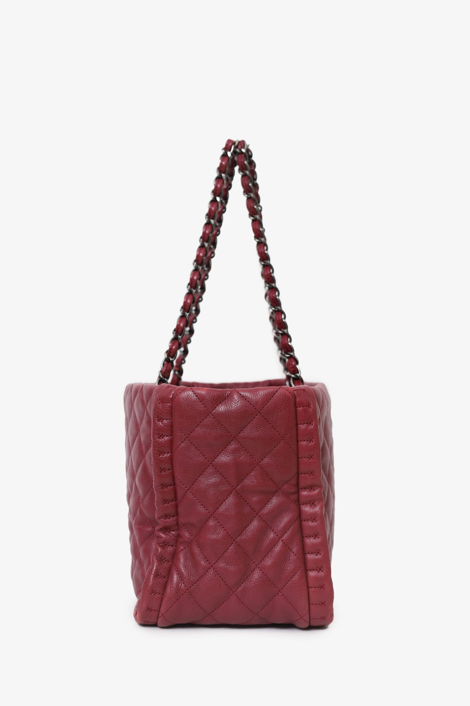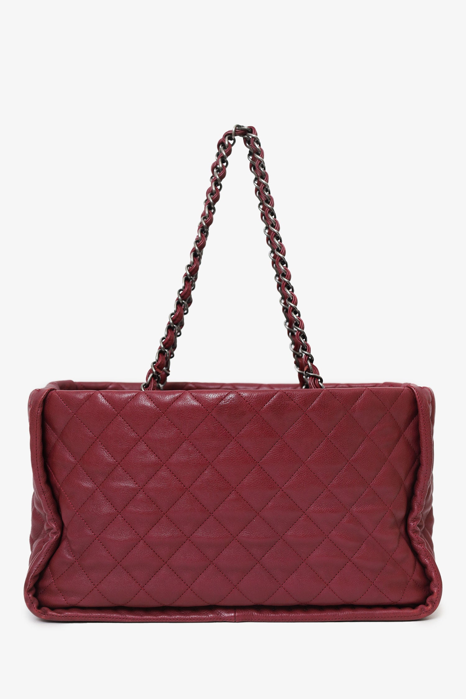 Pre-Loved Chanel™ 2011-12 Burgundy Quilted Leather CC Chain Tote. Top open. Twin chainlink and leather shoulder straps. Protective studs at base. Leather lined interior. 3 main interior compartments; front compartment contains 1 open and 2 slip pockets, middle compartment contains 1 zip pocket, and rear compartment contains 1 open and 1 zip pocket. Gunmetal-tone hardware. Tonal stitching.