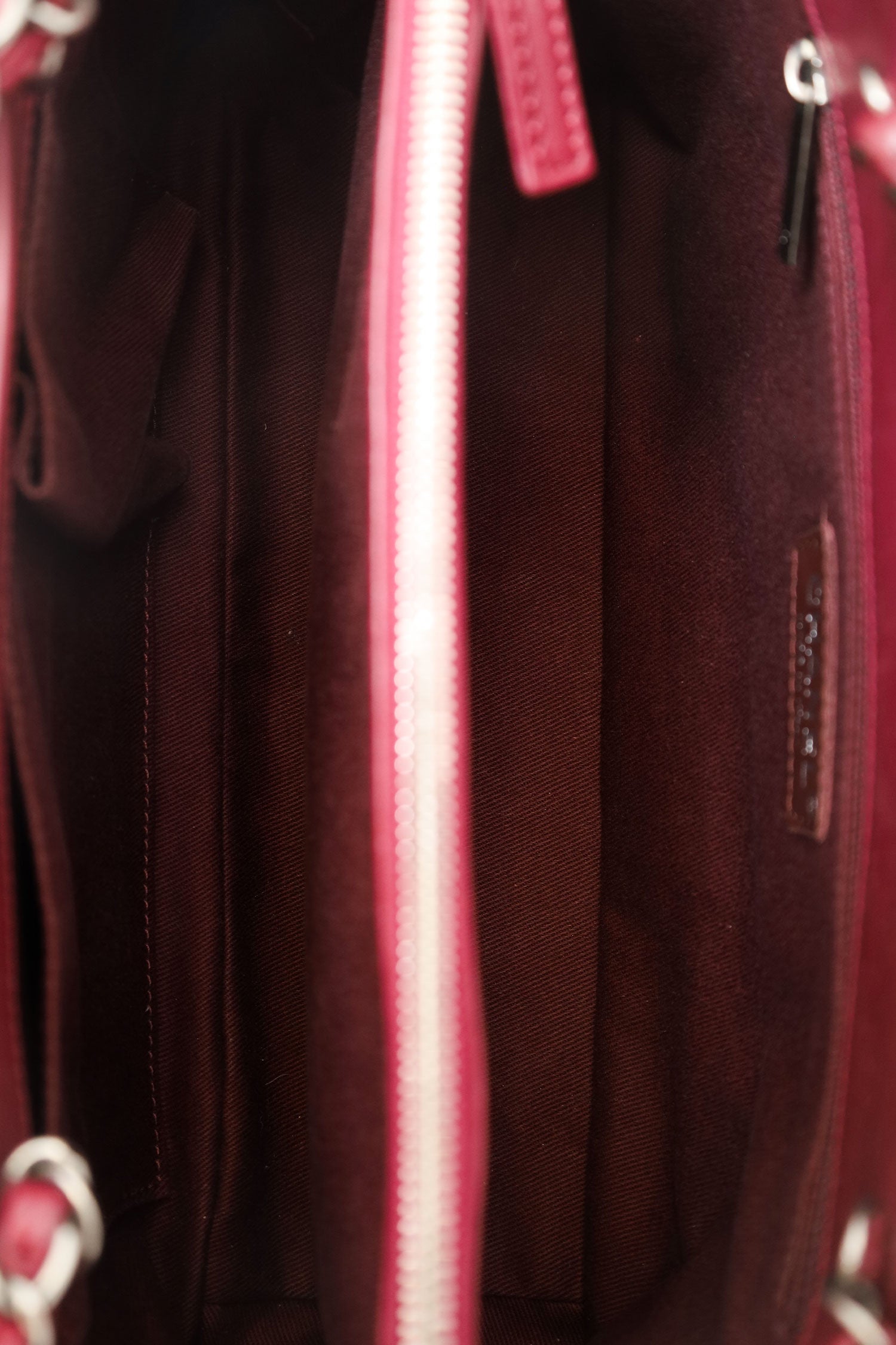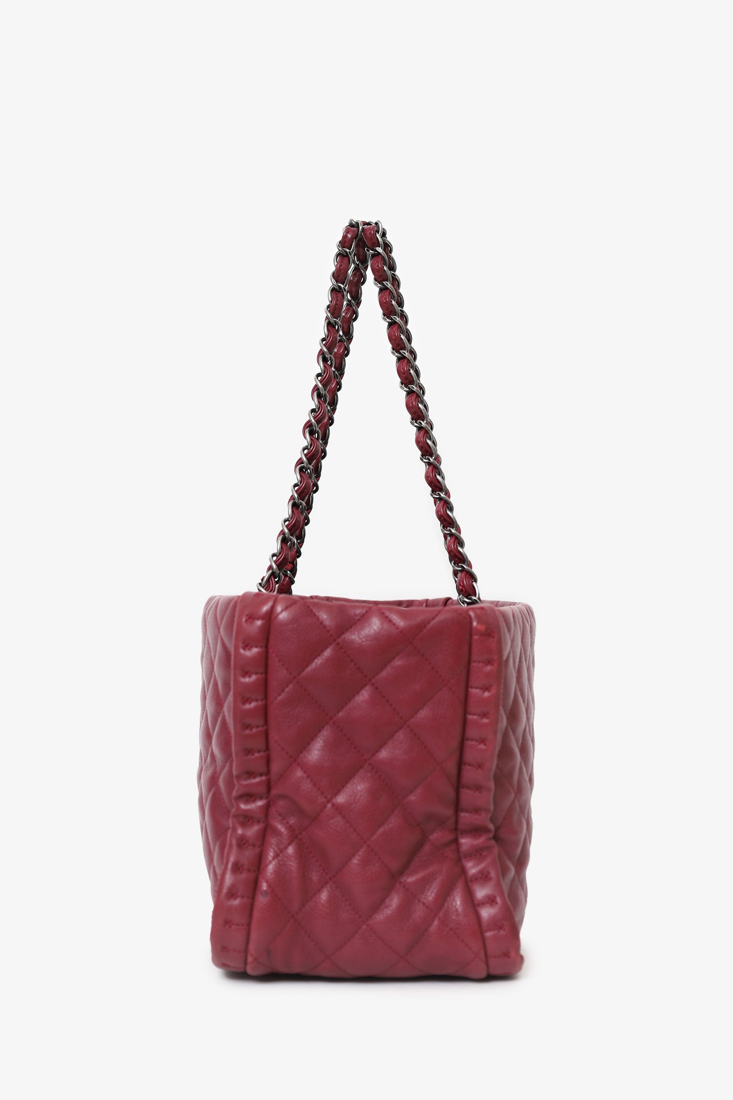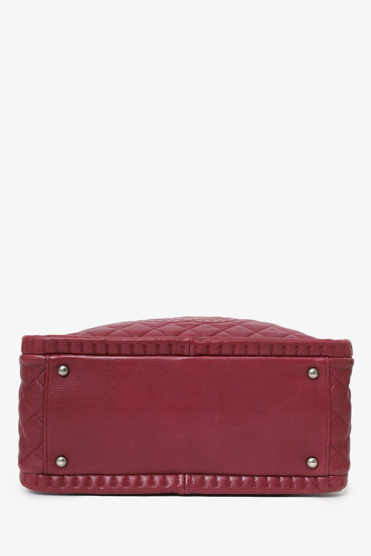 Pre-Loved Chanel™ 2011-12 Burgundy Quilted Leather CC Chain Tote. Top open. Twin chainlink and leather shoulder straps. Protective studs at base. Leather lined interior. 3 main interior compartments; front compartment contains 1 open and 2 slip pockets, middle compartment contains 1 zip pocket, and rear compartment contains 1 open and 1 zip pocket. Gunmetal-tone hardware. Tonal stitching.
