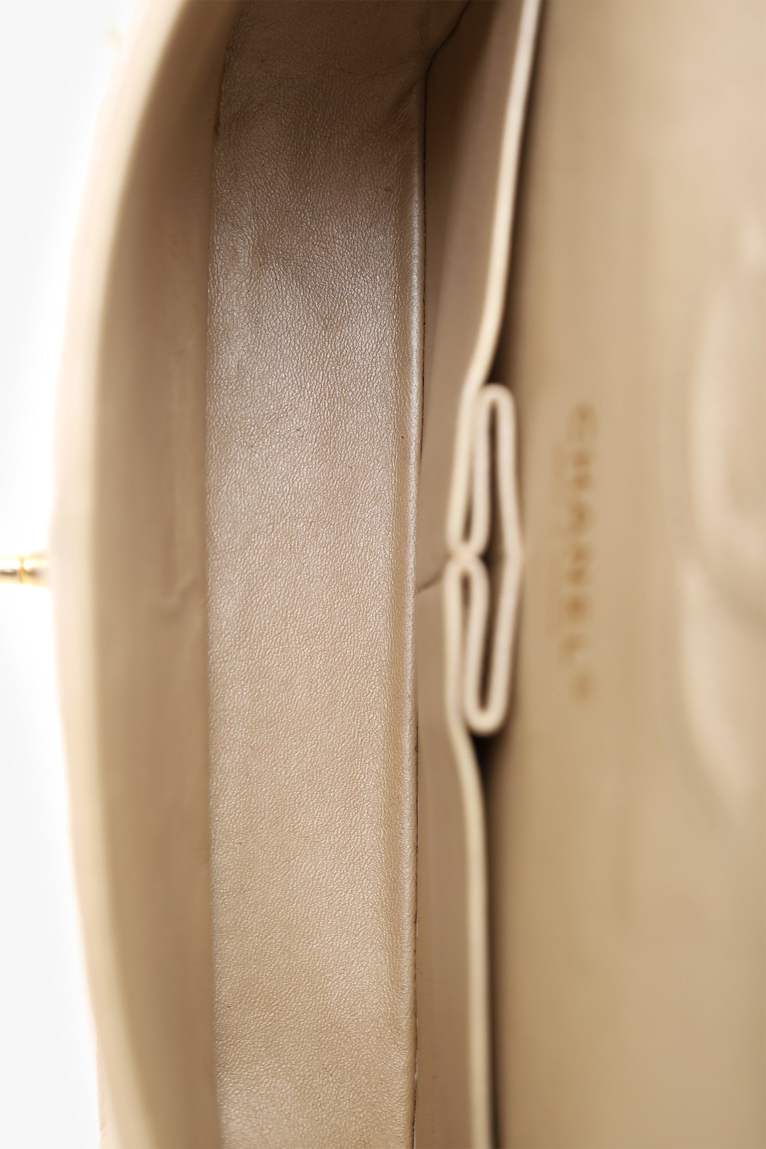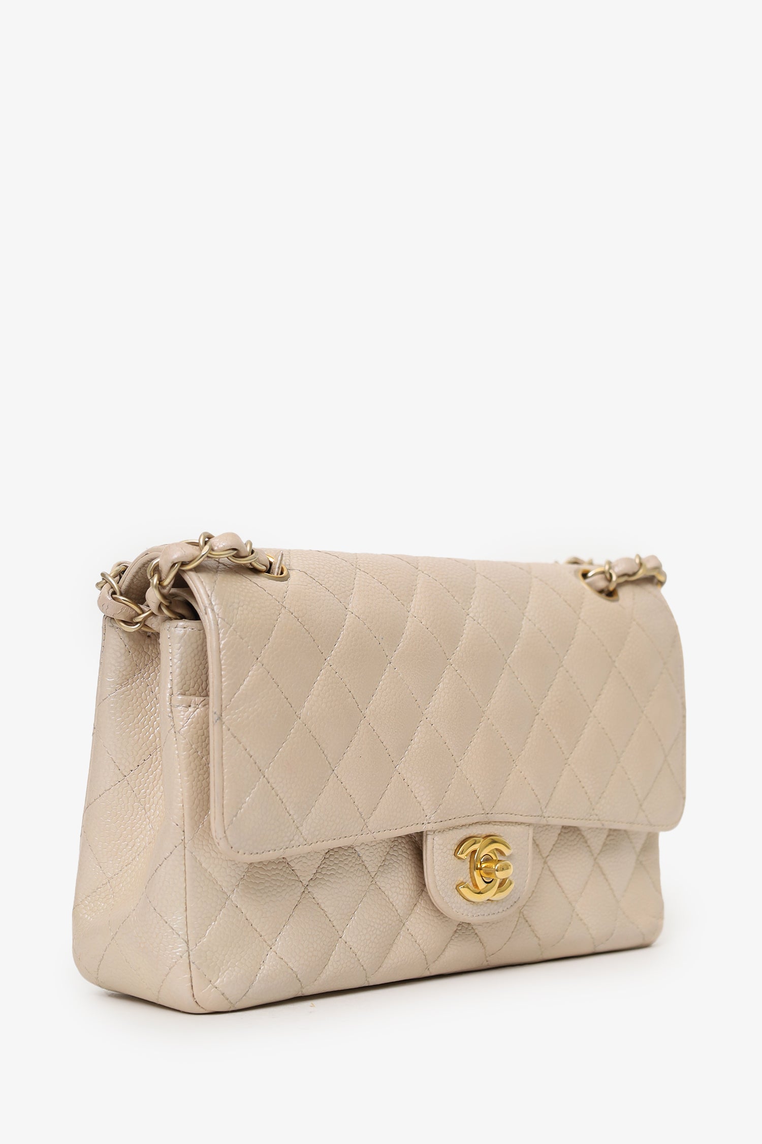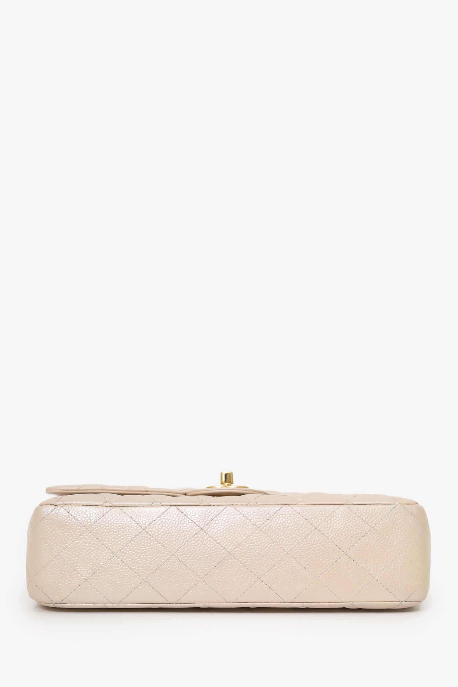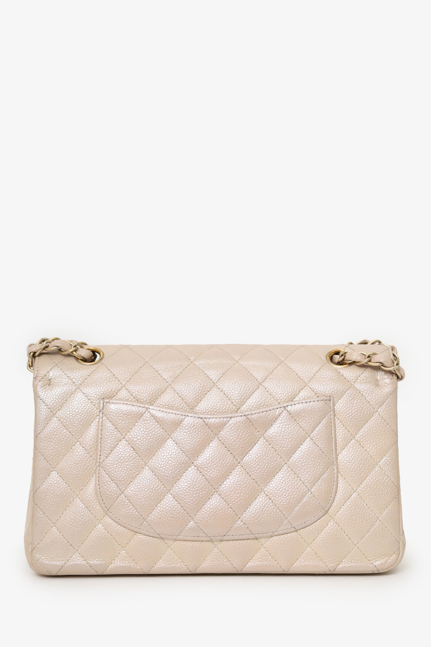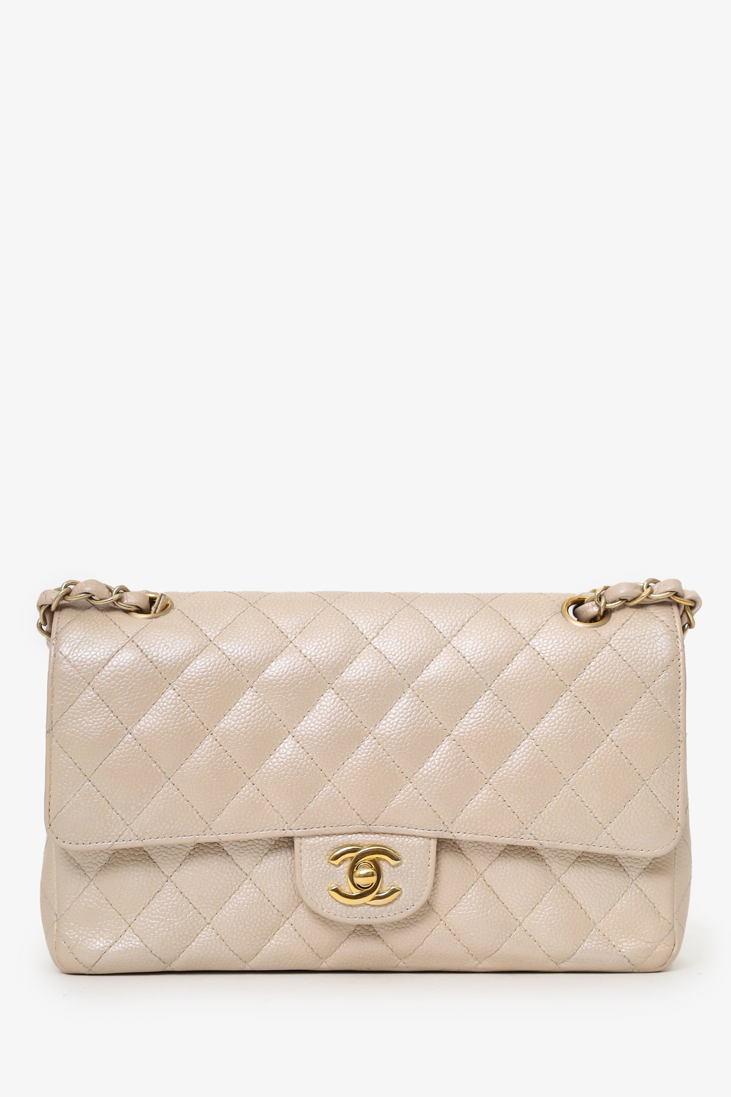 Refresh availabilityPre-Loved Chanel™ 2012 Pearly Beige Caviar Leather Medium Classic Double Flap Bag. Front fold-over flaps; Outer flap with turn-lock closure, inner flap with snap button closure. Twin chainlink shoulder straps that can be pulled in and extended to one long strap. Back exterior slip pocket. Leather-lined interior. 2 interior compartments; front compartment with 1 large open pocket. 2 interior slip pockets with single lipstick compartment. Back compartment has 1 zip pocket on underside of top fold-over flap. Gold-tone hardware. Tonal stitching.