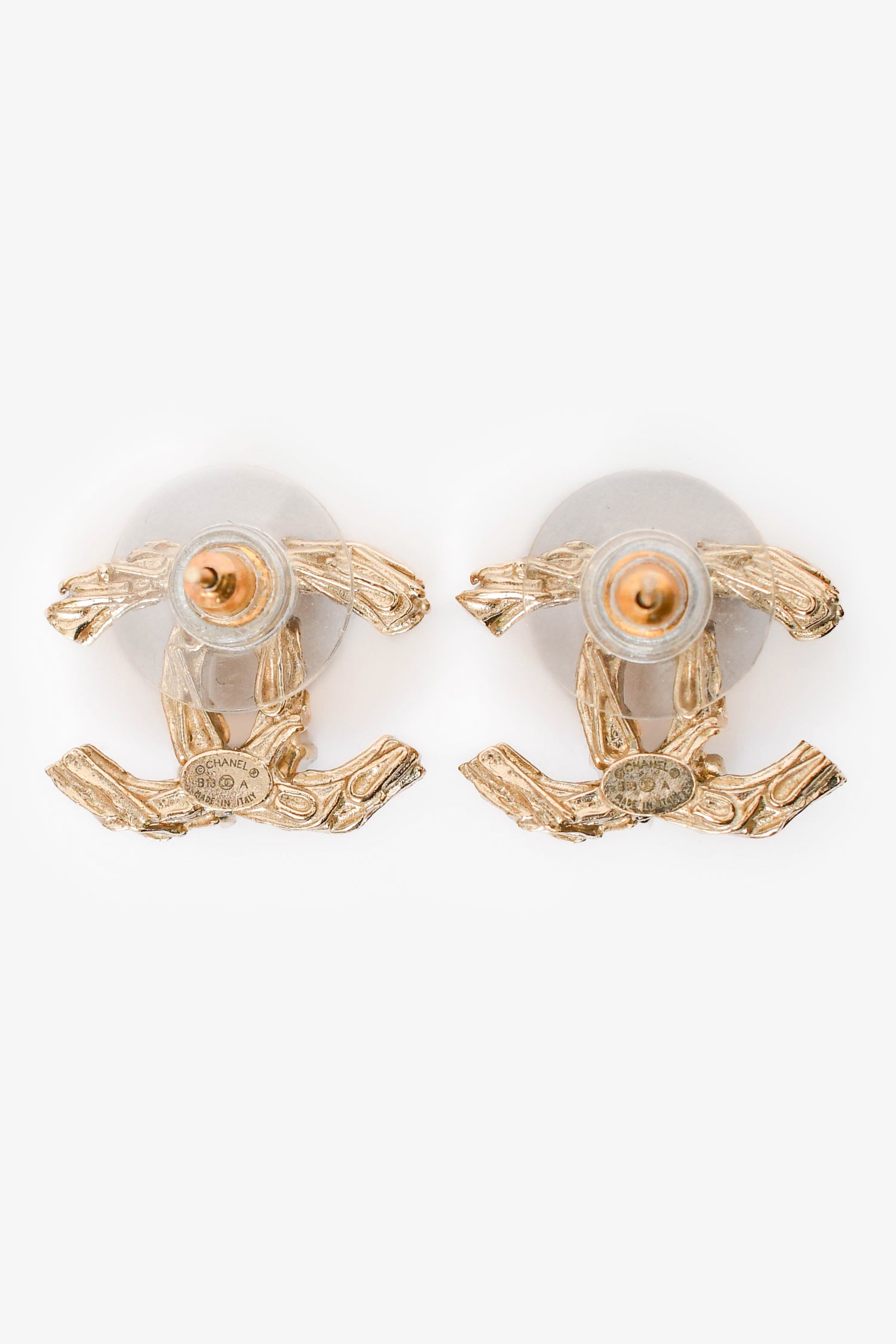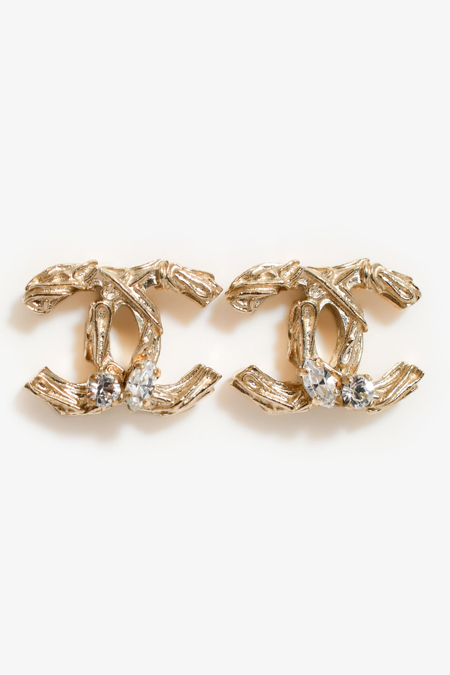 Refresh availabilityPre-Loved Chanel™ 2013 Gold Toned Crystal Detail CC Stud Earrings. Push-pin backing.