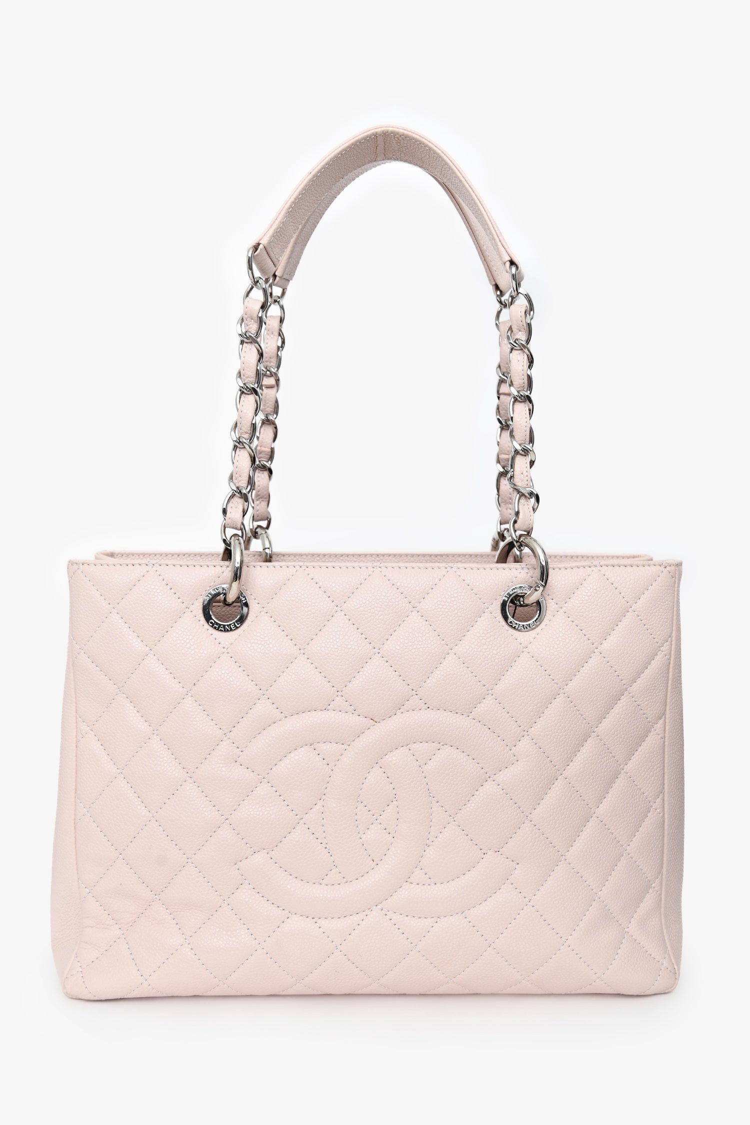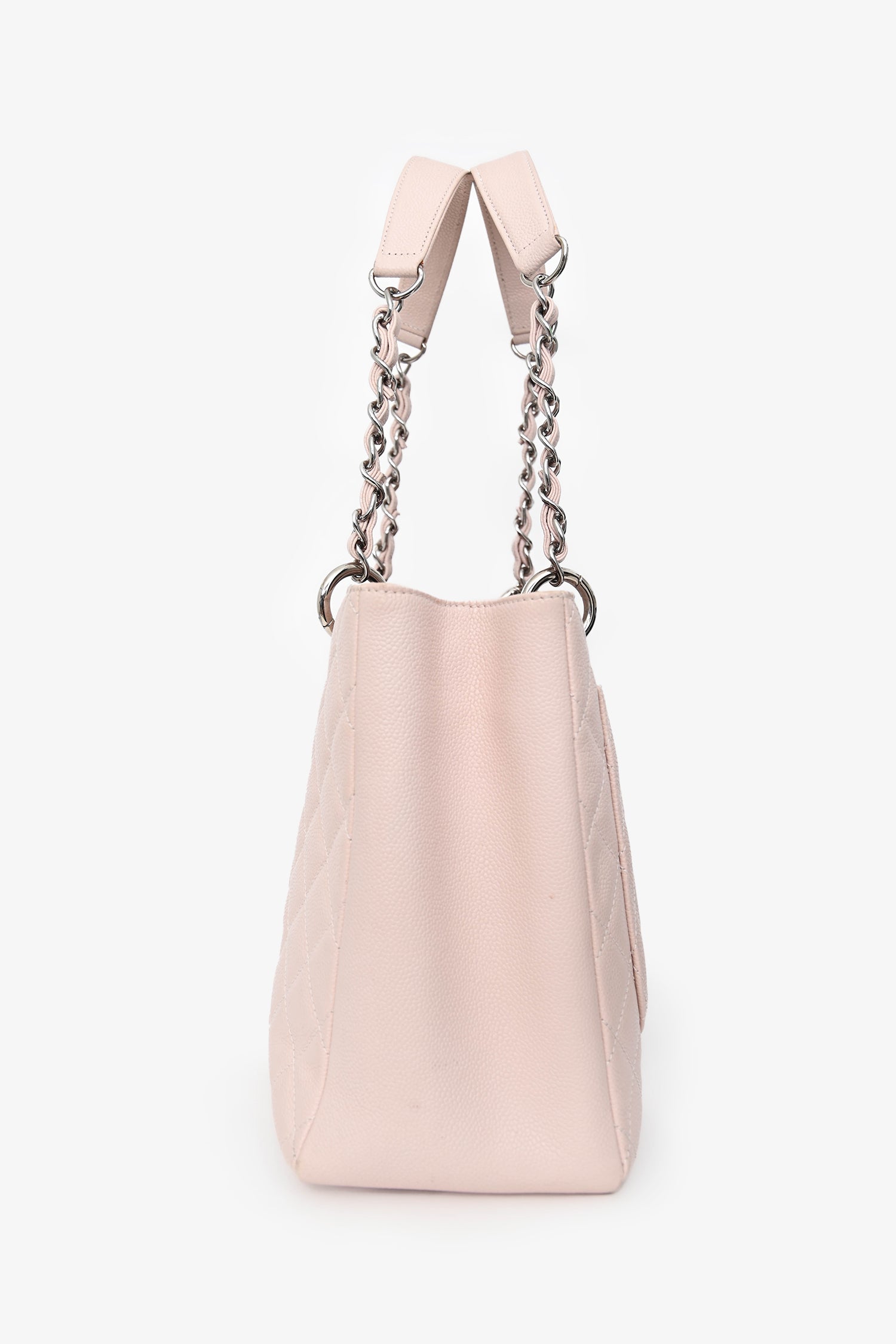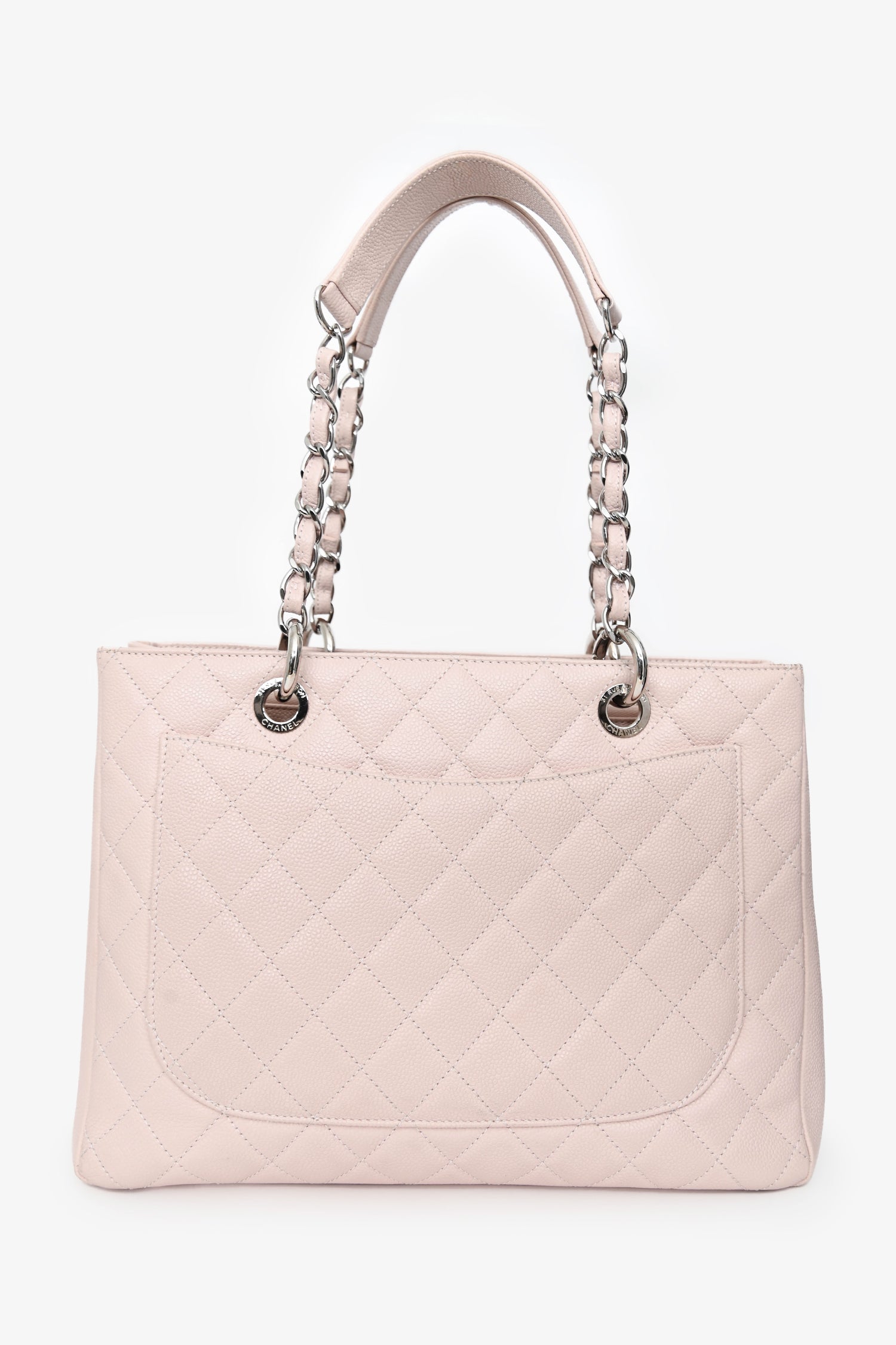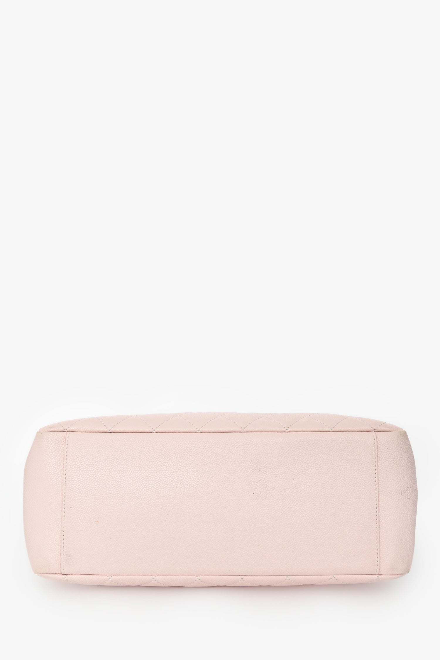 Refresh availabilityPre-Loved Chanel™ 2013/2014 Pink Caviar Leather CC Grand Shopping Tote. Open top. Twin chain handles. Rear exterior wall slip pocket. Open compartment with 3 interior pockets; 1 middle zip slot. 1 wall zip pocket, and 1 slip pocket. Textile-lined interior. Silver-tone hardware. Tonal stitching.