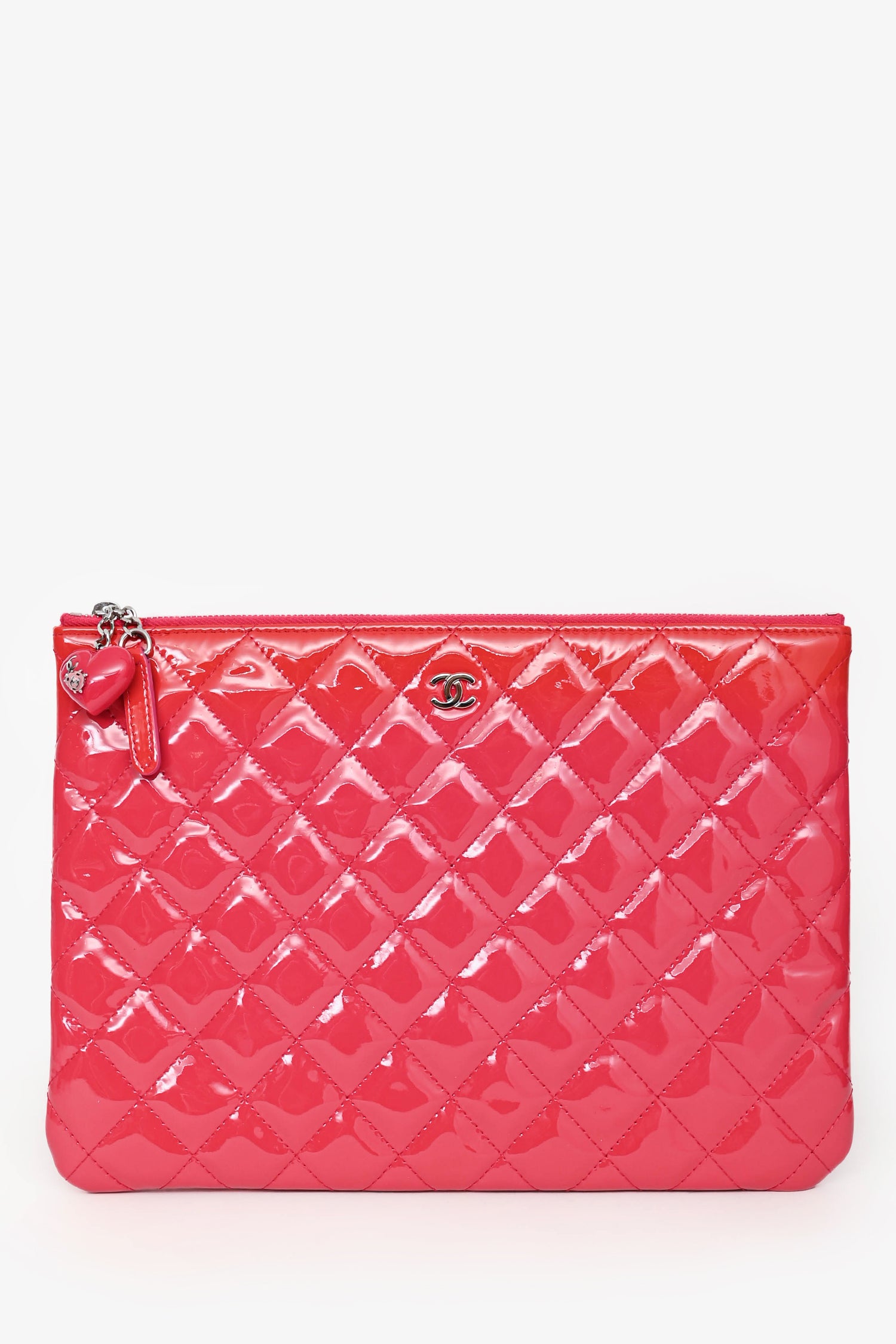 Refresh availabilityPre-Loved Chanel™ 2014 Pink Patent Leather Zip Valentines Day O Case. Zipped top. Lacquered patent. Quilted interior. Attached heart shaped charm. Tonal stitching.
