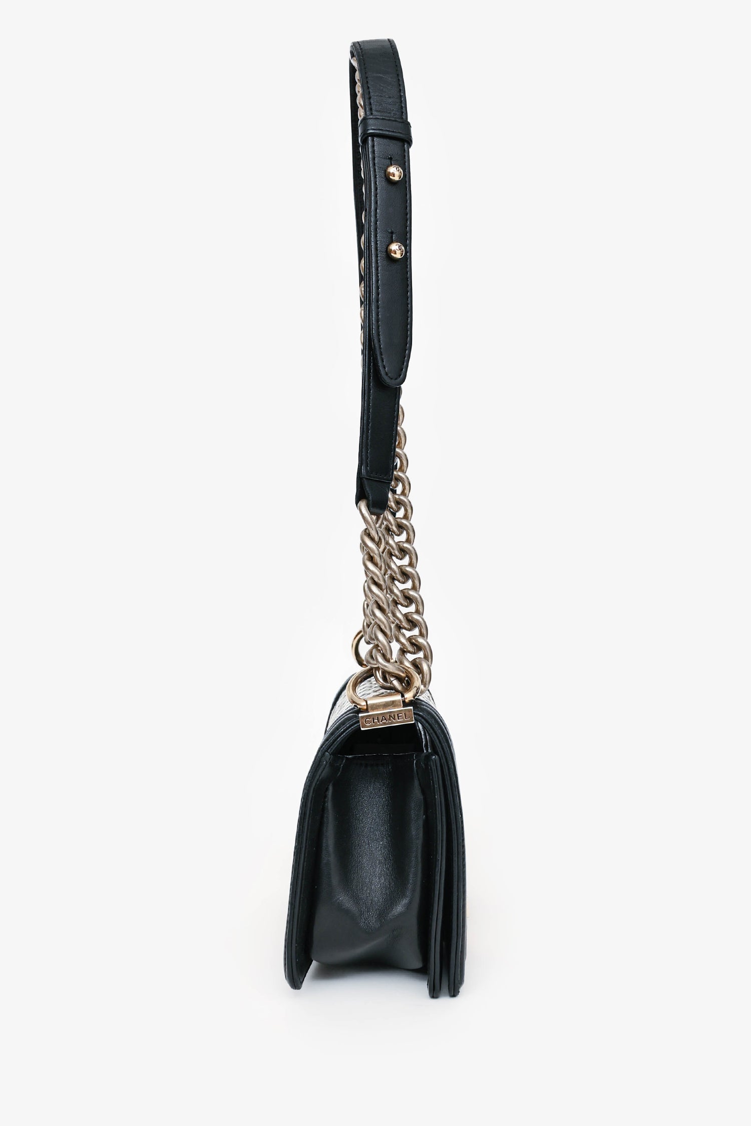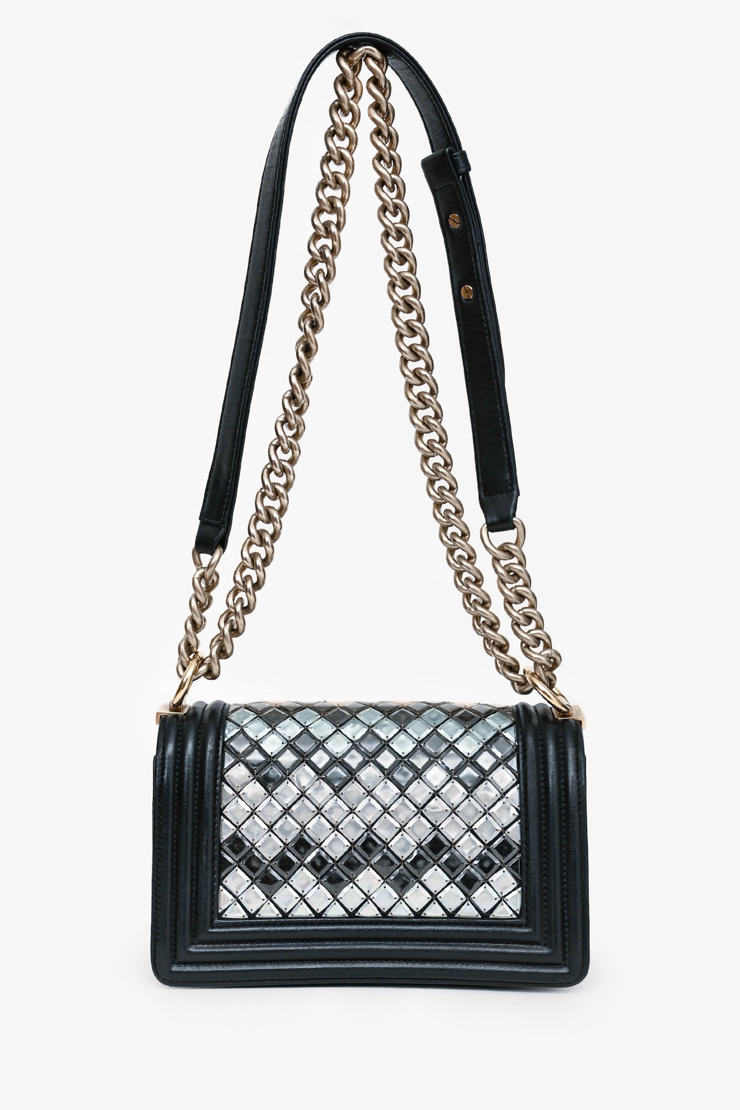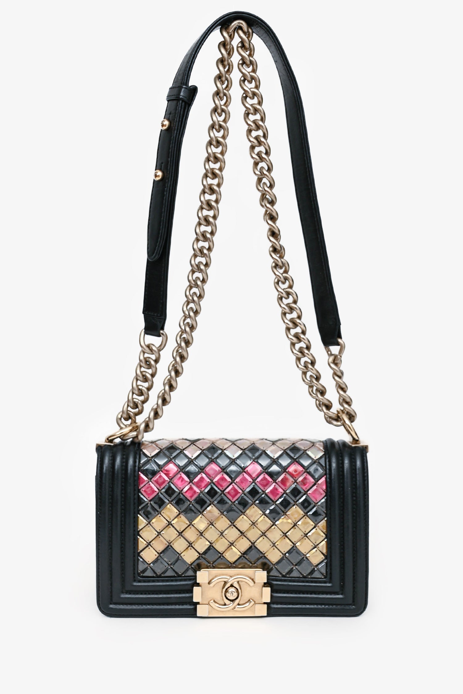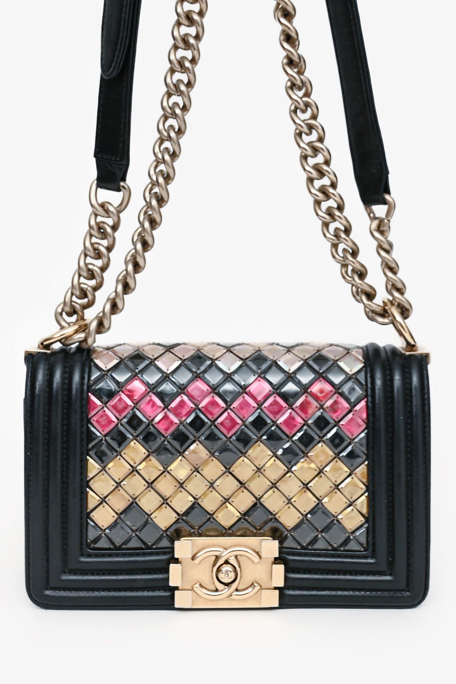 Refresh availabilityPre-Loved Chanel™ 2015-16 Black Leather Small Brasserie Mosaic Boy Bag. Fold-over flap with a push-open closure. Mosaic-like detailing. Gold-tone hardware. 1 interior compartment and 1 slip pocket. Tonal stitching.