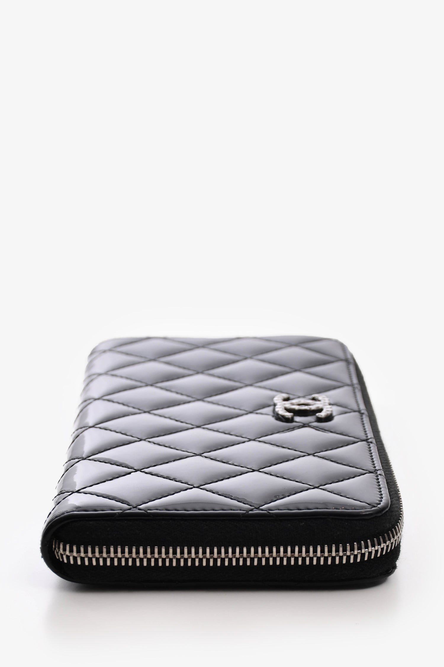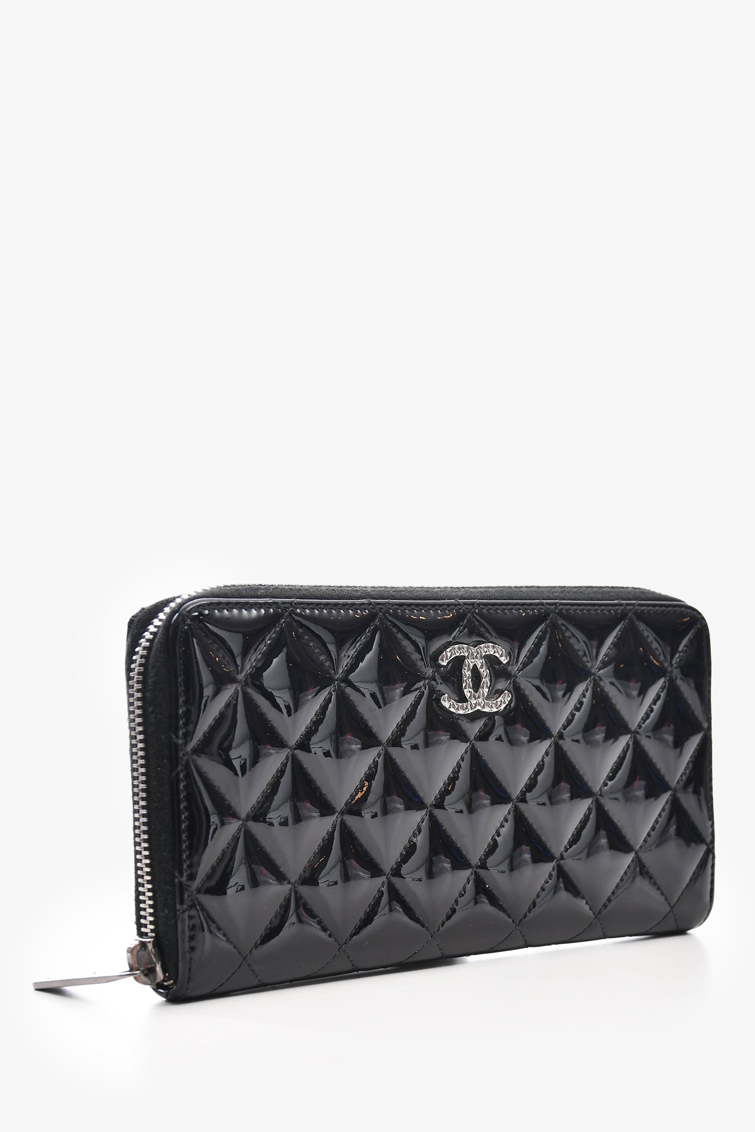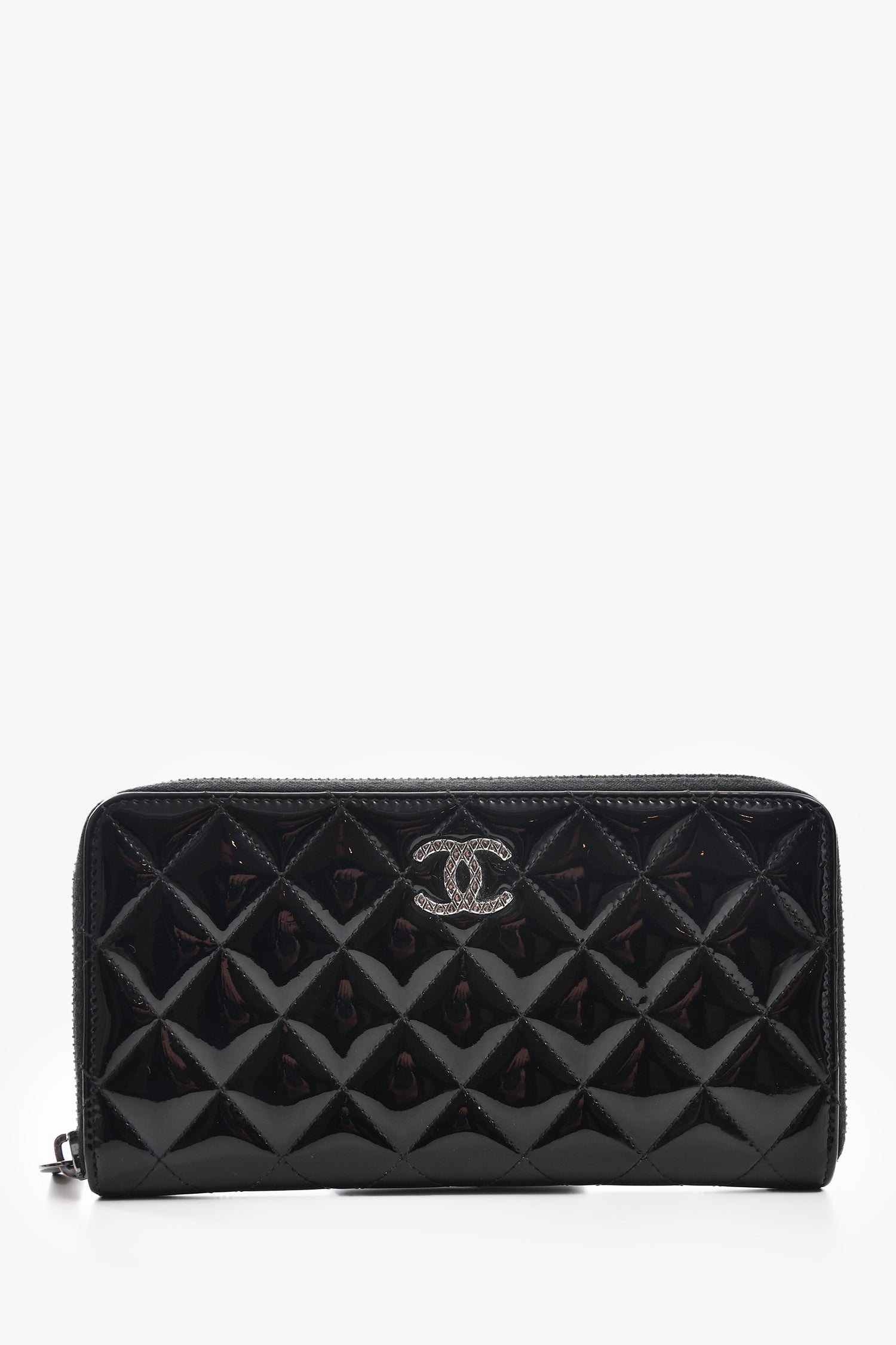 Pre-Loved Chanel™ 2015/16 Black Patent Leather Quilted CC Long Zip Wallet. Top zip closure. 8 card slots. 2 billfold compartments. 1 interior zip compartment. Silver-tone hardware. Tonal stitching.