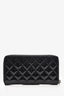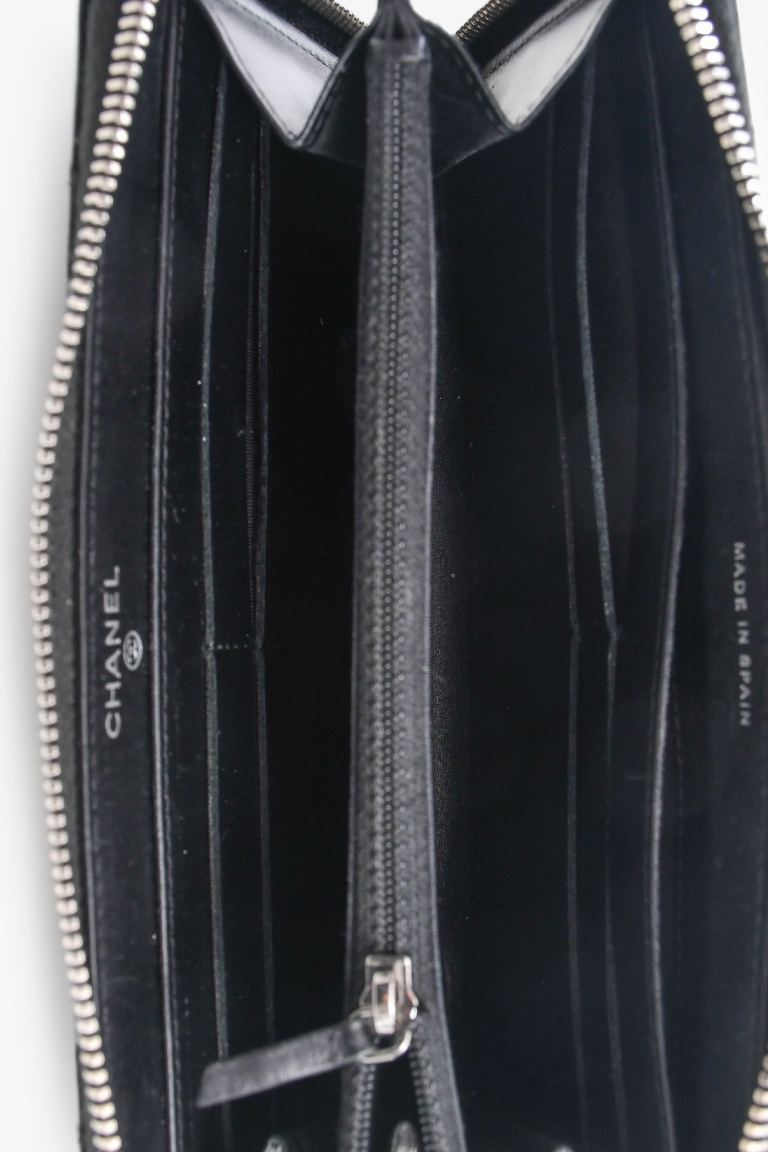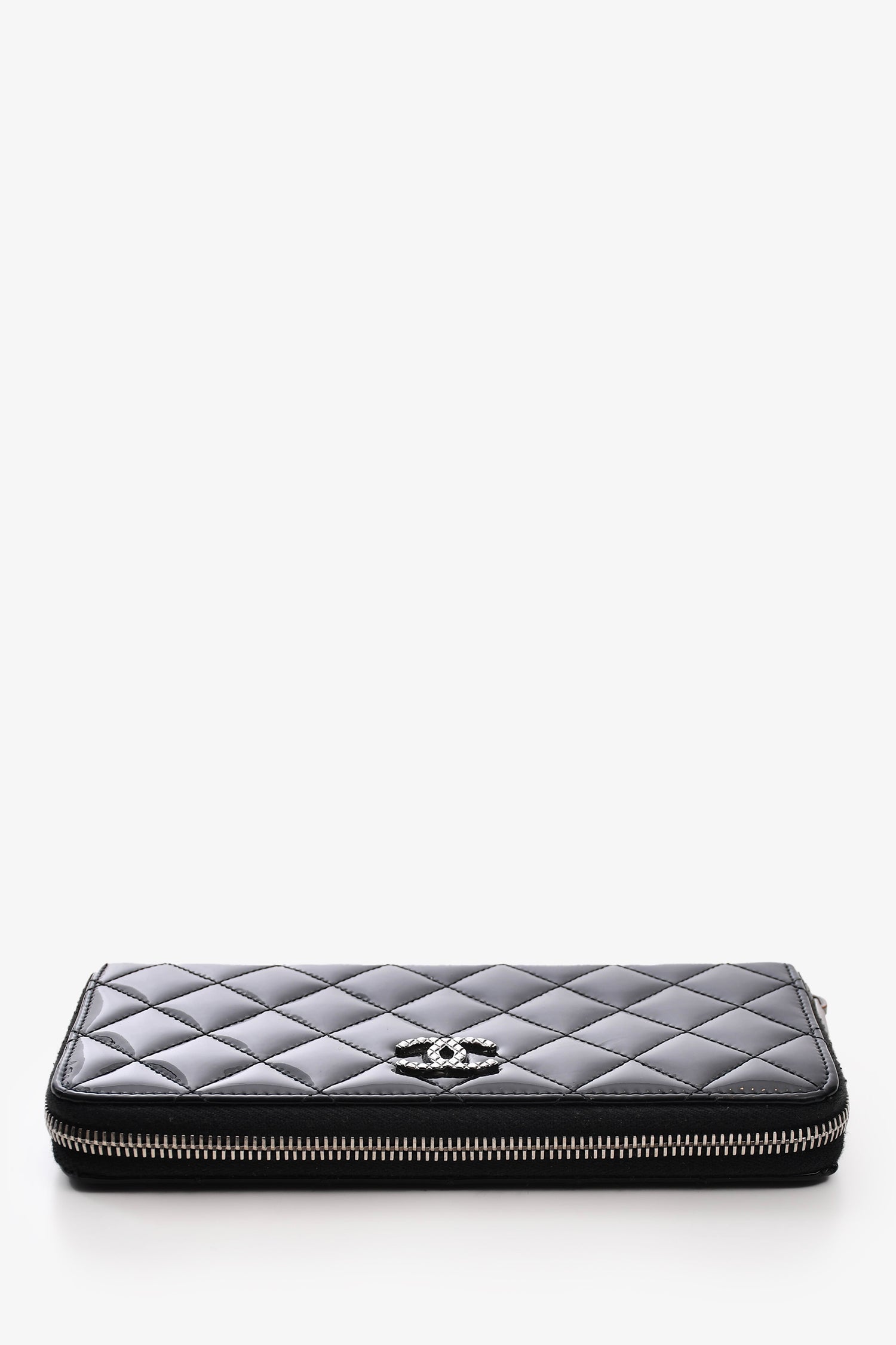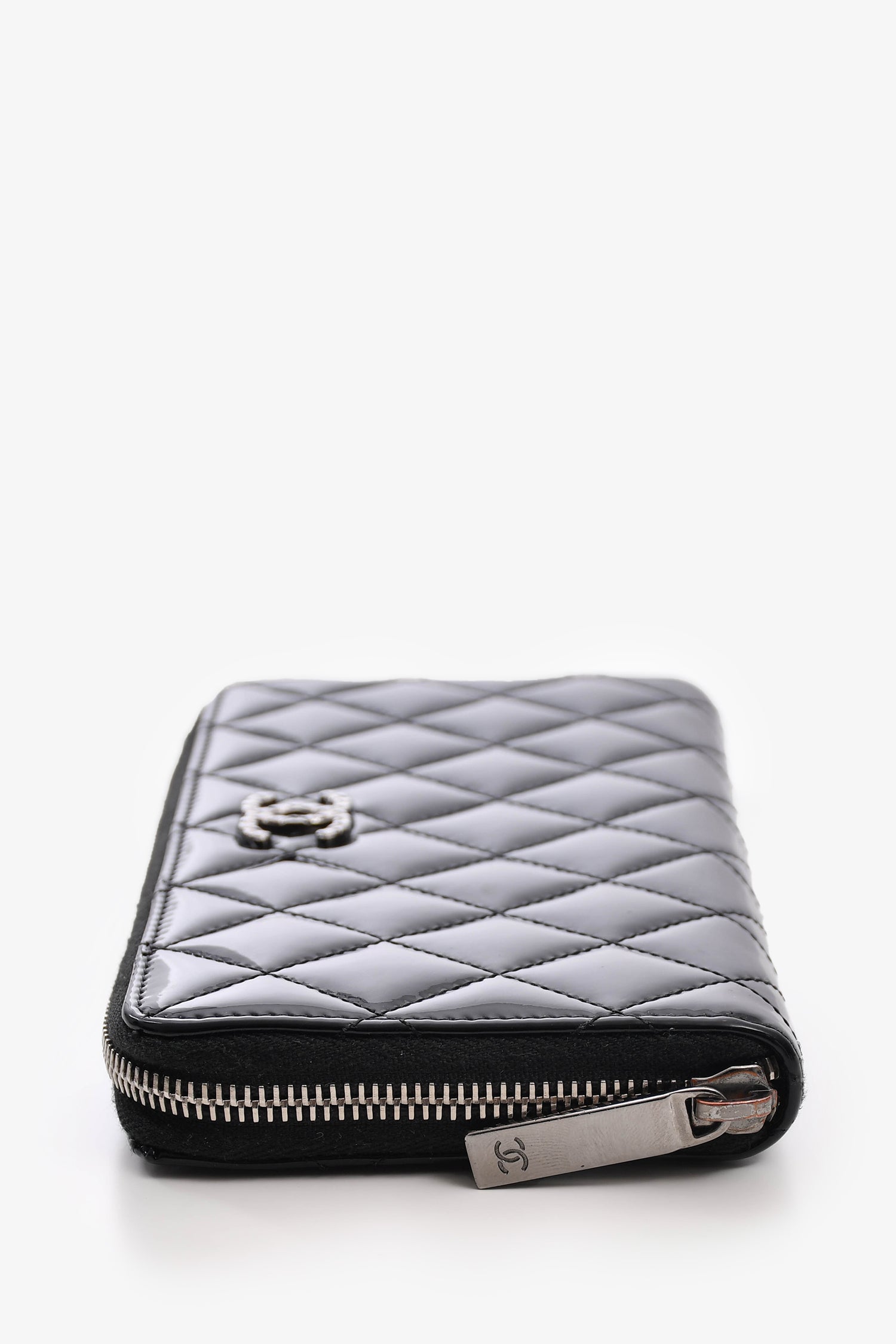 Pre-Loved Chanel™ 2015/16 Black Patent Leather Quilted CC Long Zip Wallet. Top zip closure. 8 card slots. 2 billfold compartments. 1 interior zip compartment. Silver-tone hardware. Tonal stitching.
