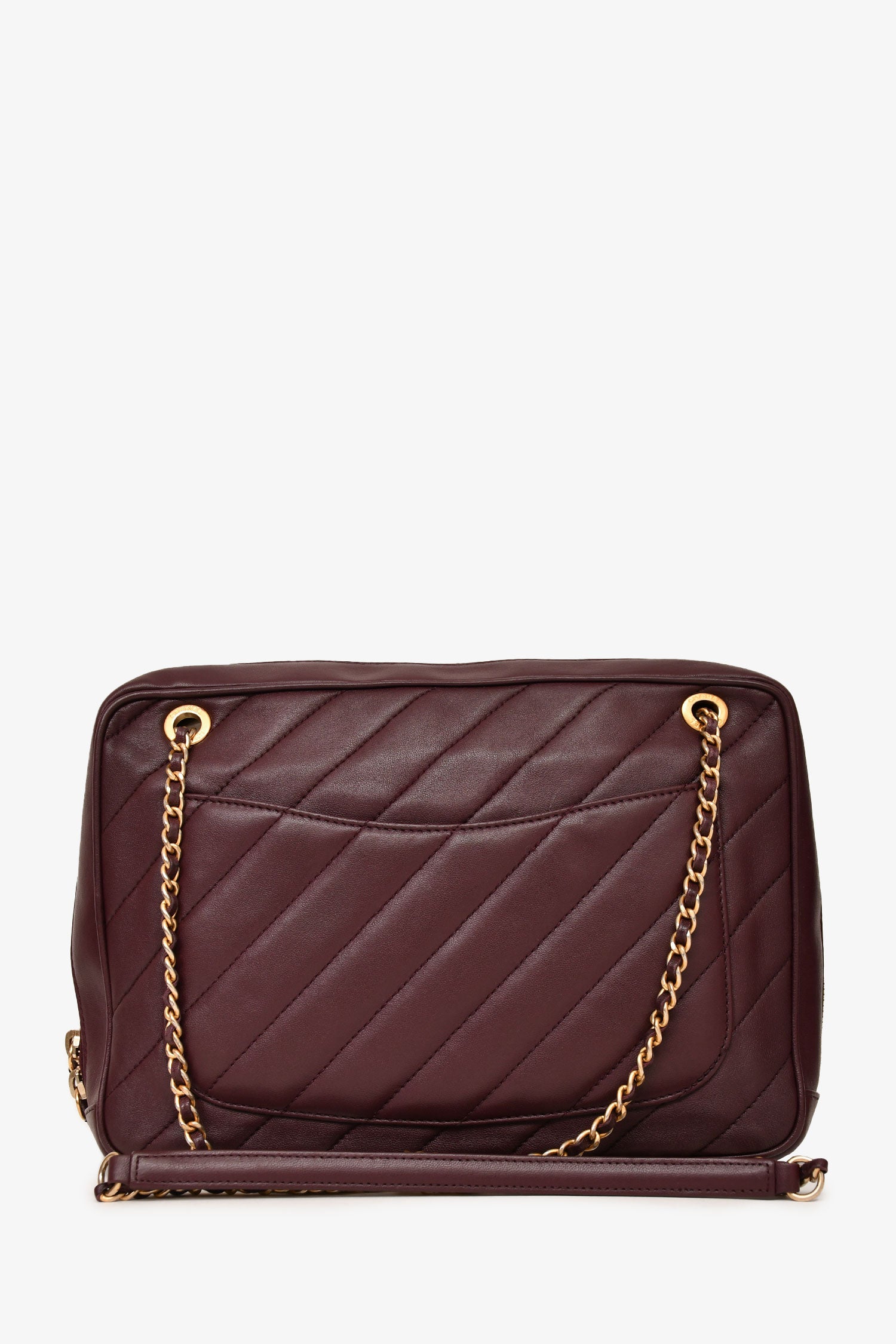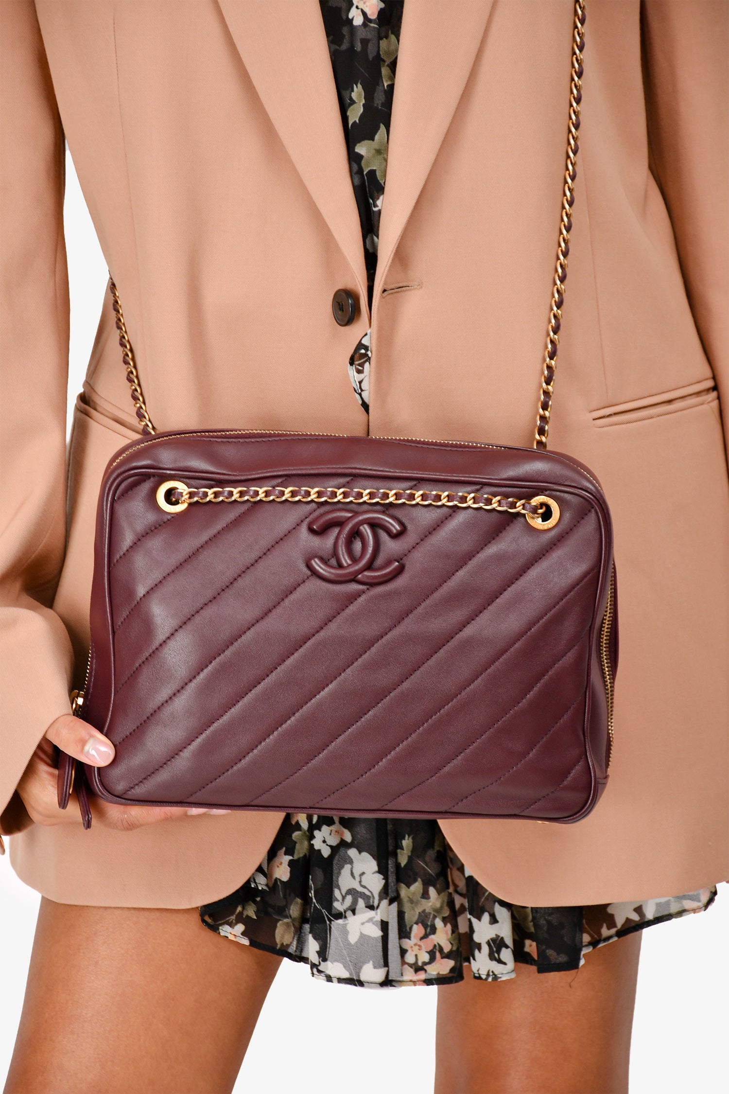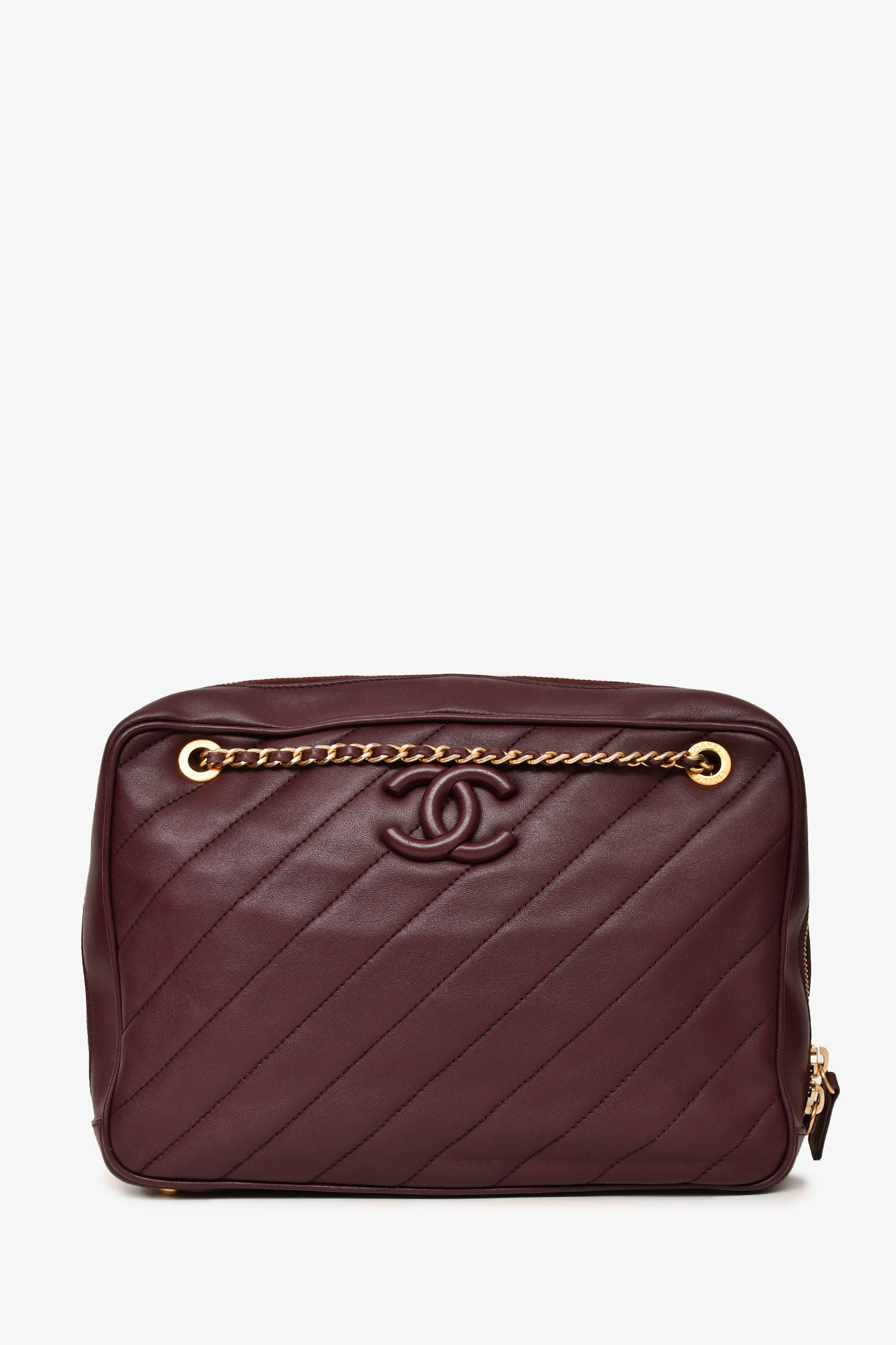 Refresh availabilityPre-Loved Chanel™ 2015-16 Eggplant Purple Diagonal Leather Camera Case Double Chain Shoulder Bag. Signature CC logo at the front. Dual chain-link shoulder straps interwoven with leather. Double zip-around closure. Interior lined with fabric. Features two wall zip pockets on the interior. Flap over pocket with snap button closure and three slip pockets. One exterior slip pocket in the back. Tonal stitching.