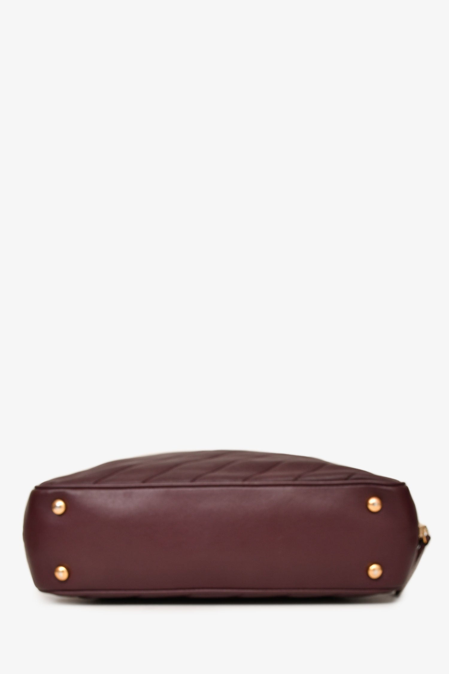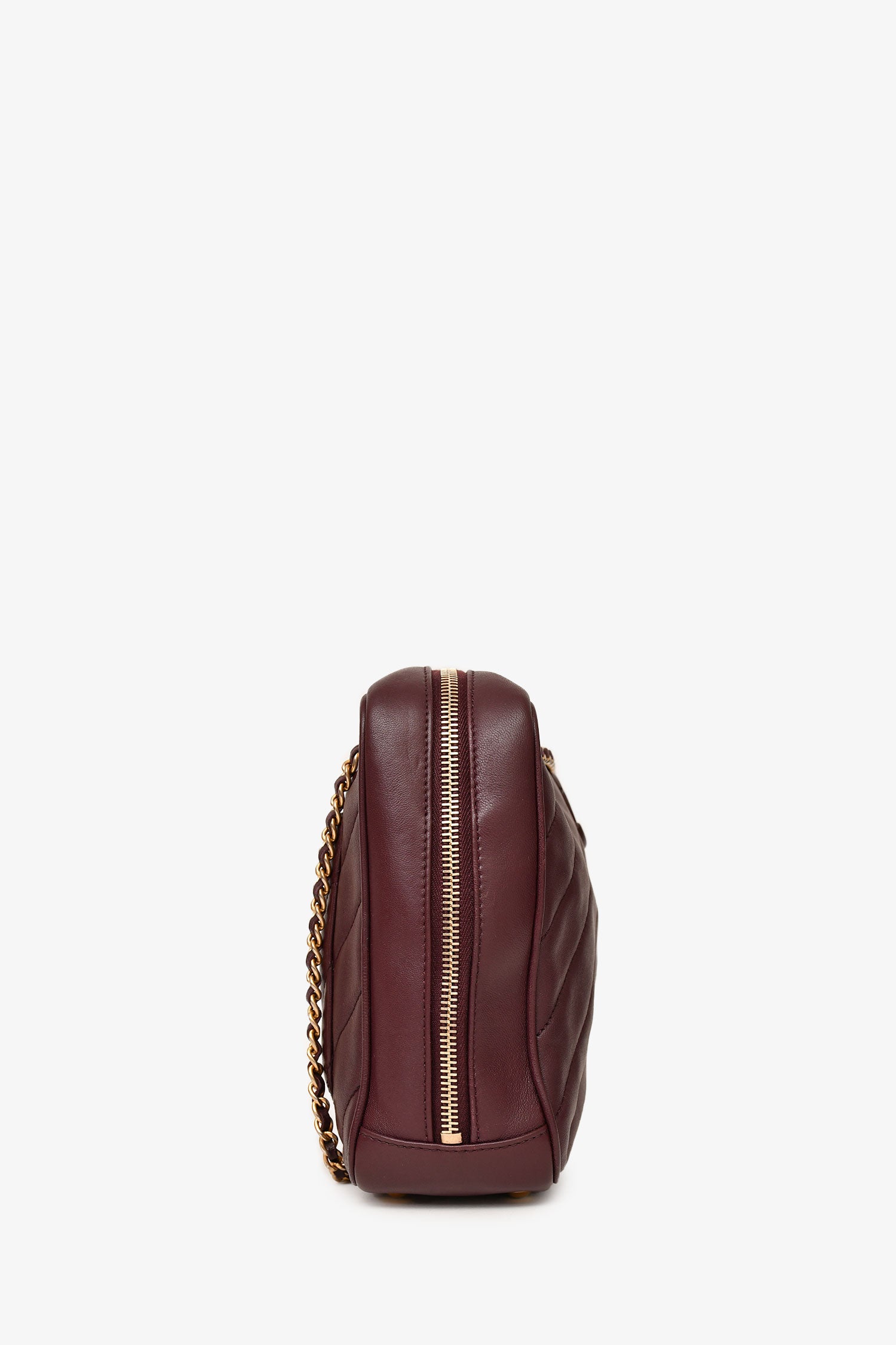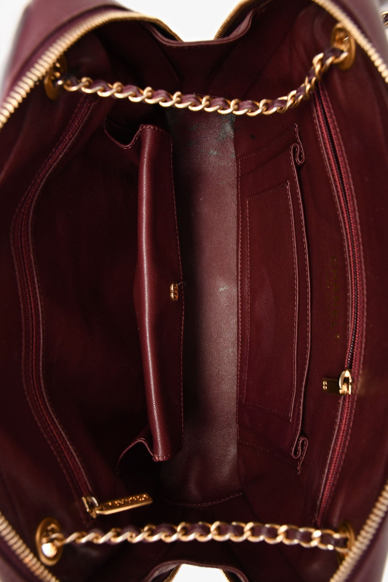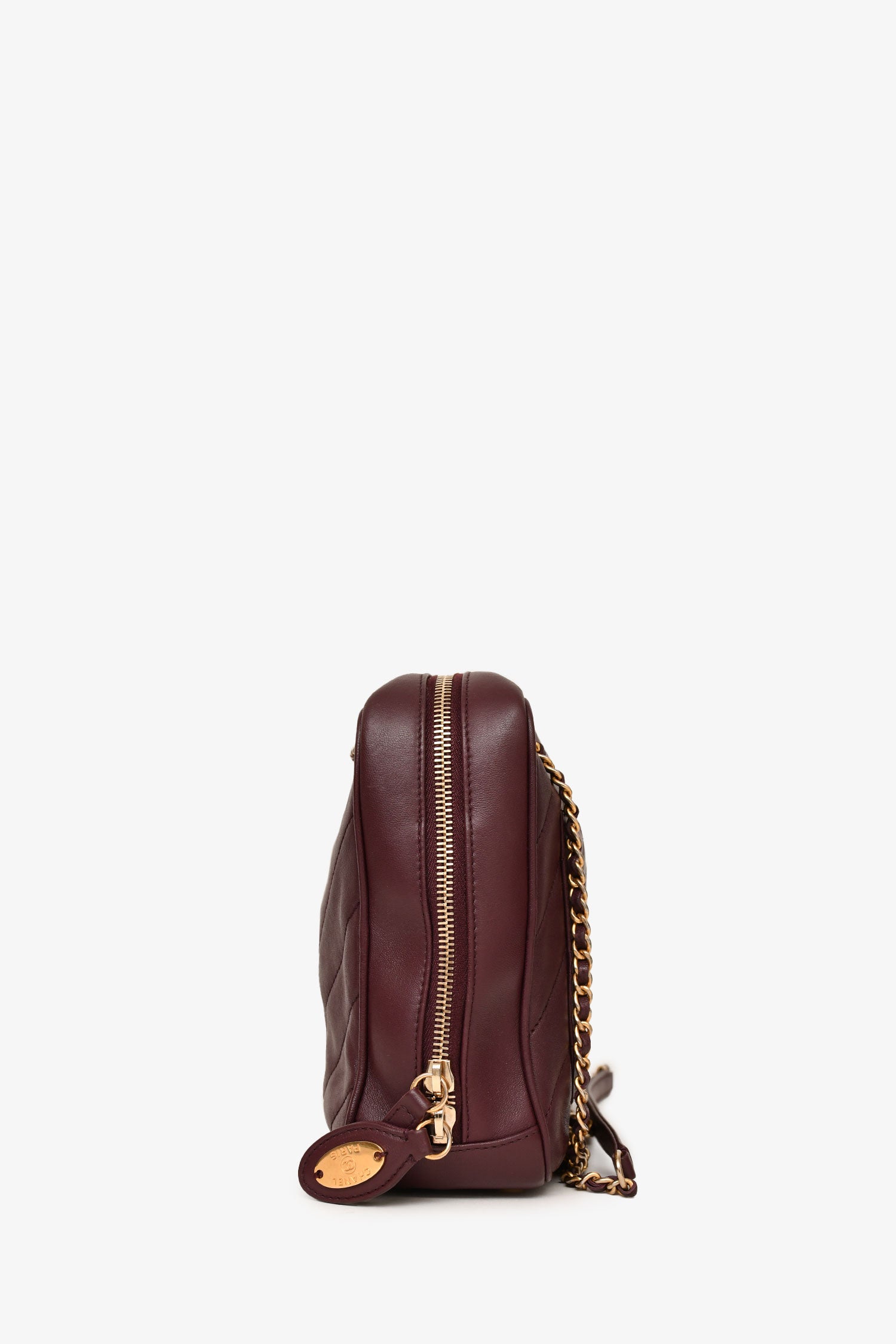 Refresh availabilityPre-Loved Chanel™ 2015-16 Eggplant Purple Diagonal Leather Camera Case Double Chain Shoulder Bag. Signature CC logo at the front. Dual chain-link shoulder straps interwoven with leather. Double zip-around closure. Interior lined with fabric. Features two wall zip pockets on the interior. Flap over pocket with snap button closure and three slip pockets. One exterior slip pocket in the back. Tonal stitching.