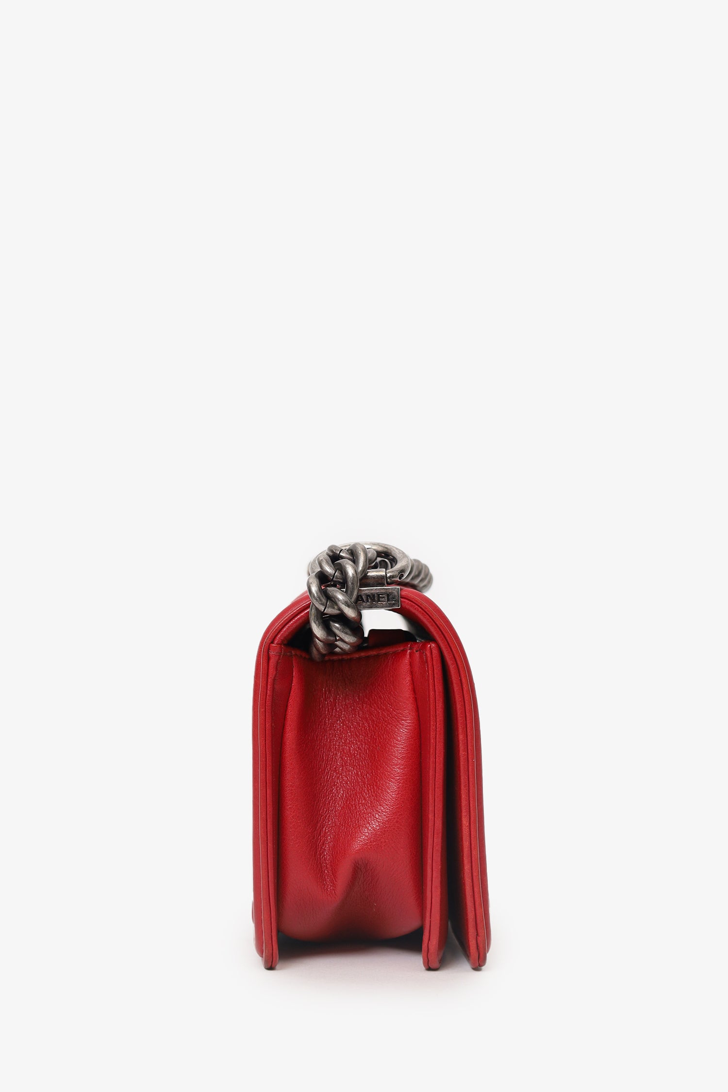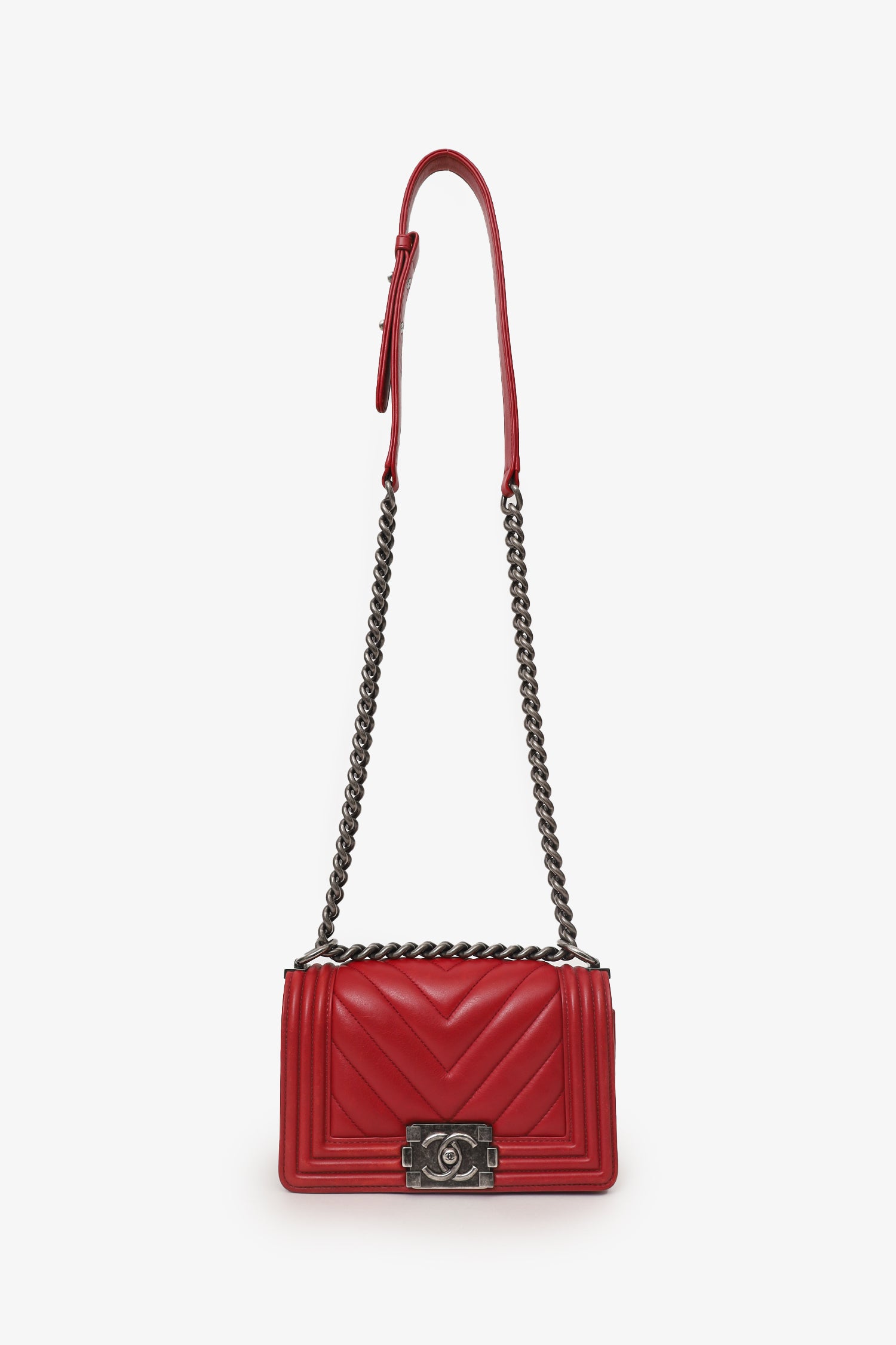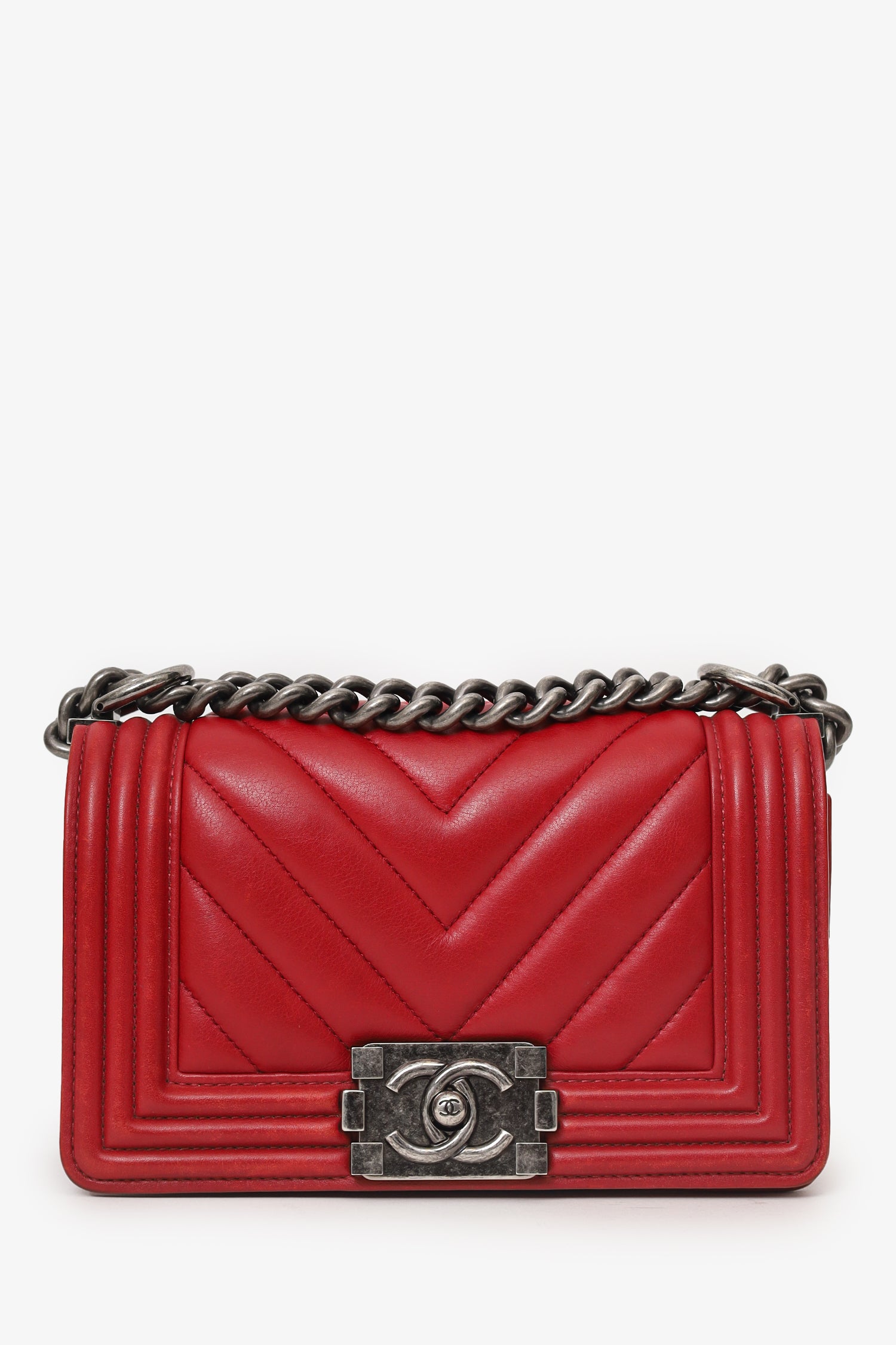 Pre-Loved Chanel™ 2016 Red Lambskin Chevron Small Boy Bag. Front fold-over flap with push-lock closure. Chainlink shoulder strap. Lined interior with single rear slip pocket. Gunmetal-ton5 hardware. Tonal stitching.