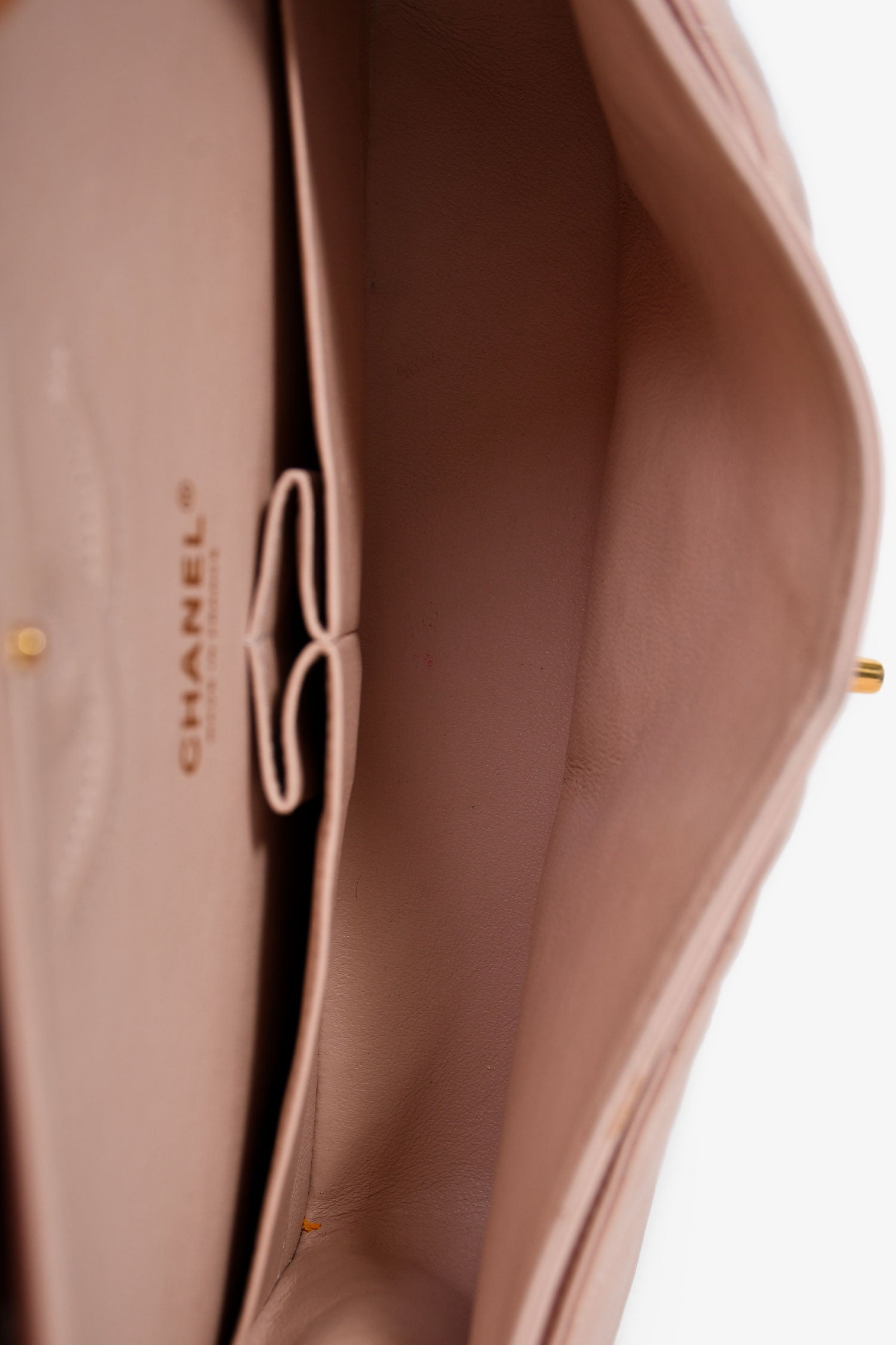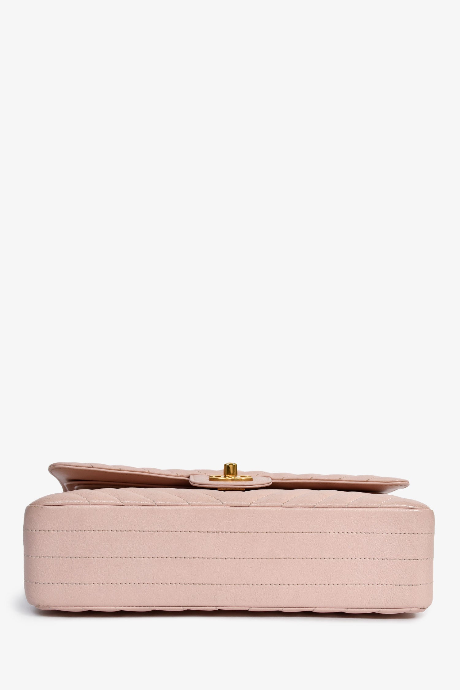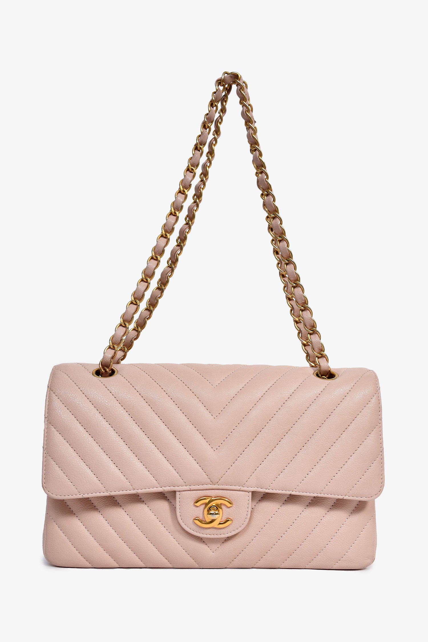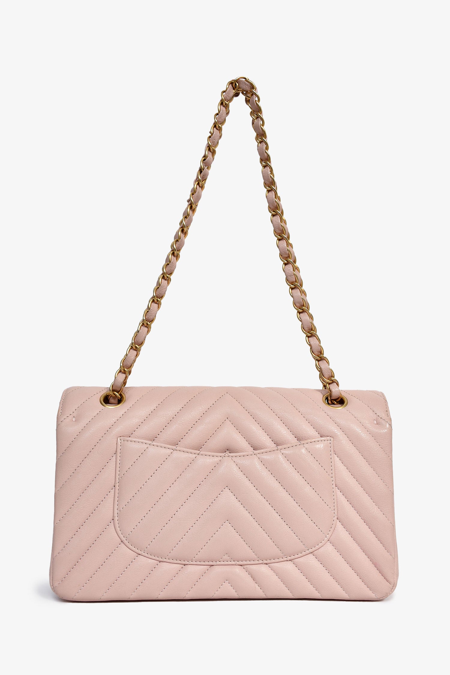 Refresh availabilityPre-Loved Chanel™ 2016-17 Pink Calfskin Chevron Medium Double Flap Shoulder Bag. Front fold-over flaps; Outer flap with turn-lock closure, inner flap with snap button closure. Twin chainlink shoulder straps that can be pulled in and extended to one long strap. Back exterior slip pocket. Leather-lined interior. 2 interior compartments; front compartment with 1 large open pocket. 2 interior slip pockets with single lipstick compartment. Back compartment has 1 zip pocket on underside of top fold-over flap. Gold-tone hardware. Tonal stitching.