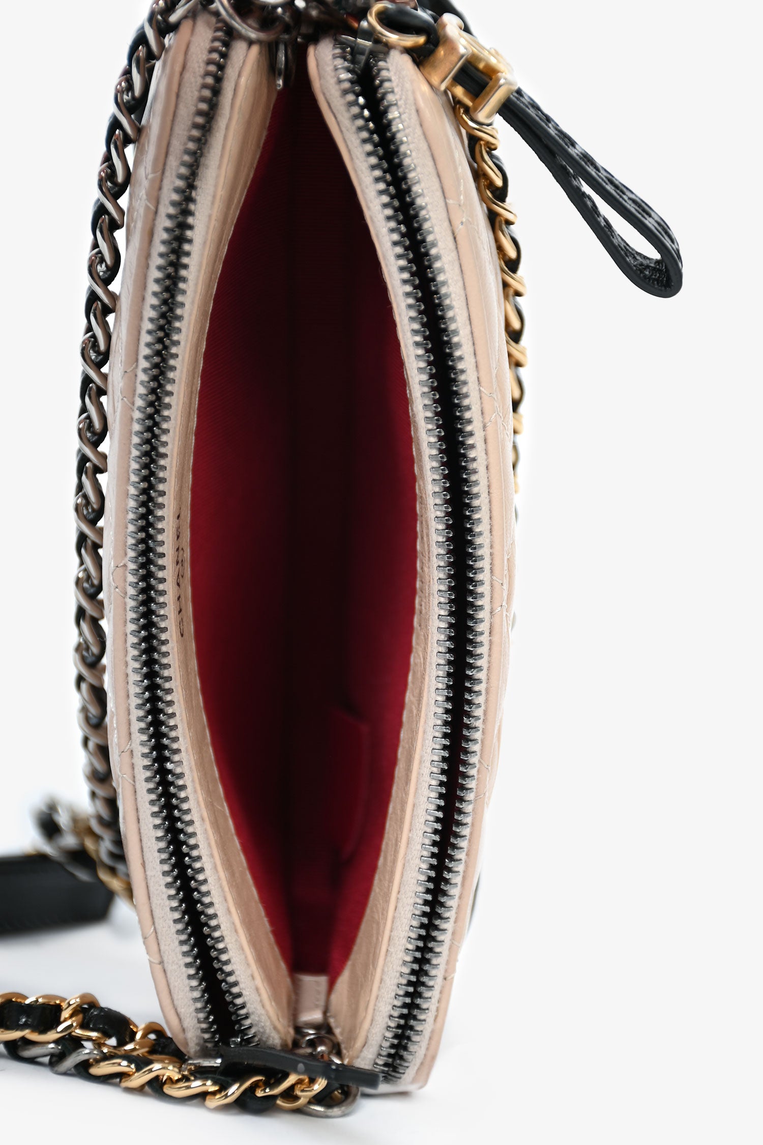 Refresh availabilityPre-Loved Chanel™ 2017-18 Beige/Black Leather Gabrielle Wallet on Chain. Mixed-texture design. Features a central open compartment between two zippered sections. Three card slip pockets inside each of the zipped compartments. Chain-link and leather woven strap for crossbody or shoulder wear. Silver and gold-tone hardware. Tonal stitching.