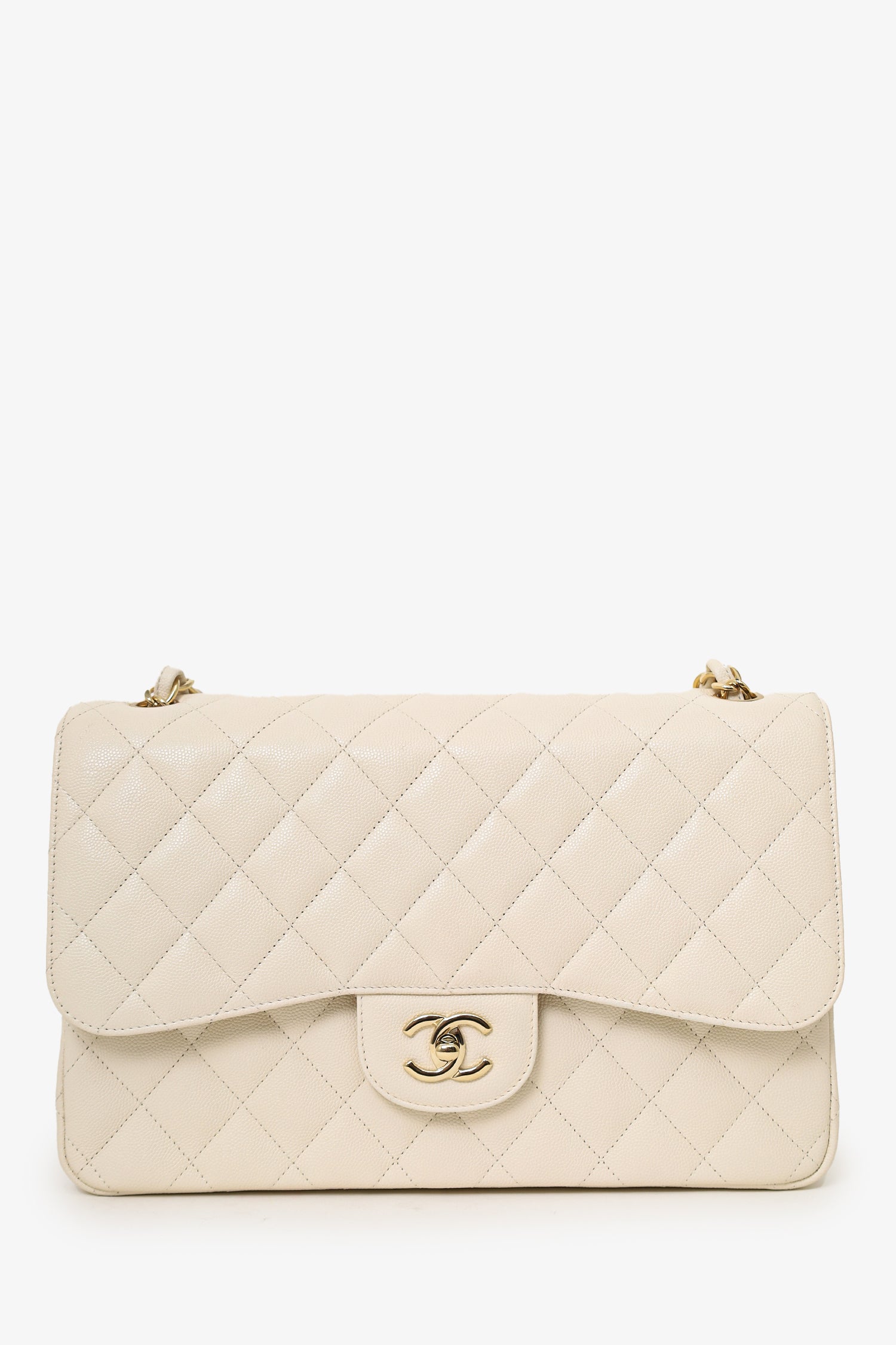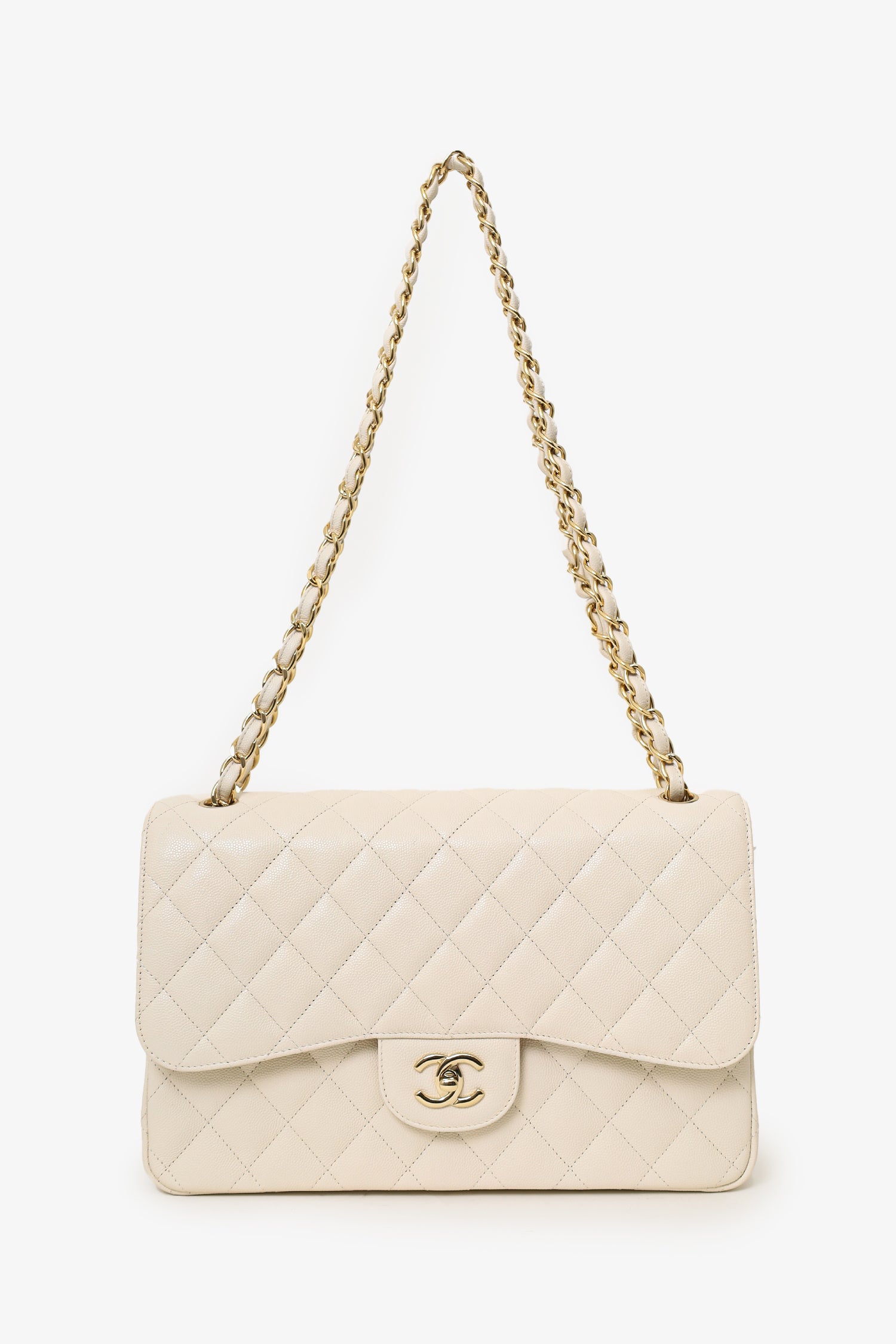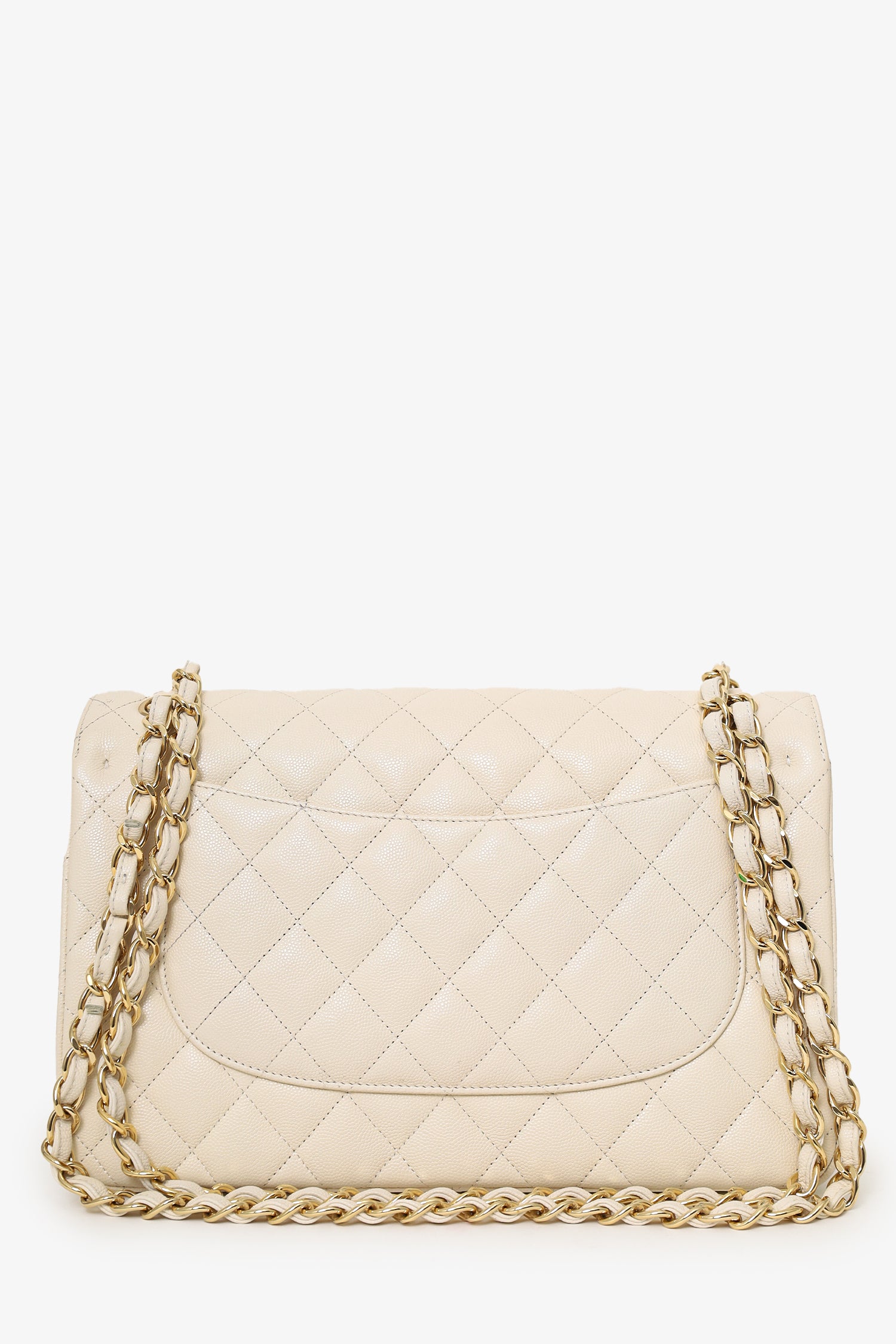 Refresh availabilityPre-Loved Chanel™ 2017 White Caviar Leather Classic Jumbo Double Flap Bag. Front fold-over flap with turn-lock closure. Twin chainlink straps that can be pulled into one long strap. Quilted exterior. Rear exterior slip pocket. Single rear slip compartment under first flap. Secondary fold-over flap with snap-button closure. 2 main interior compartments; front slip, rear with 2 wall slip pockets. Leather-lined interior. Gold-tone hardware. Tonal stitching.