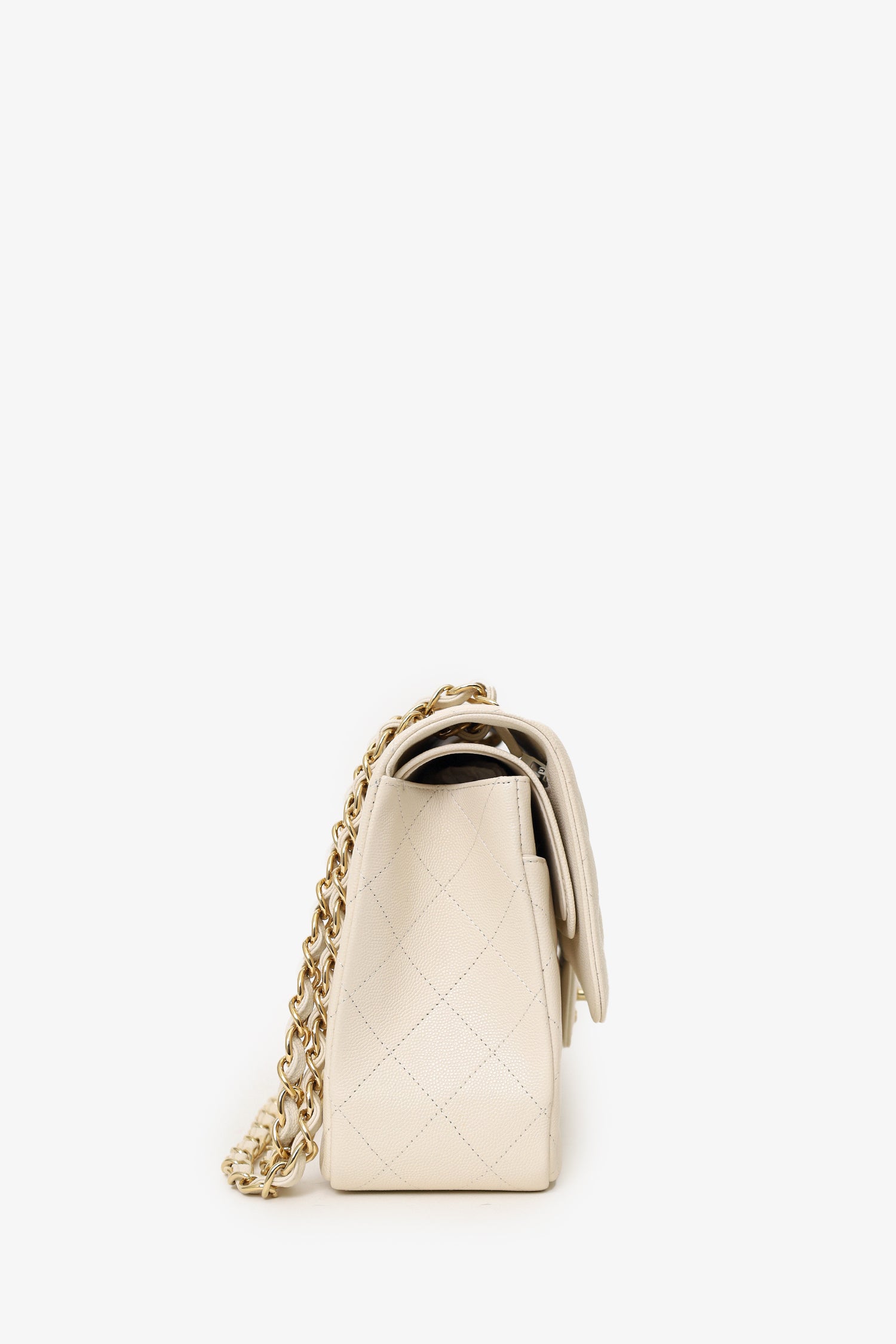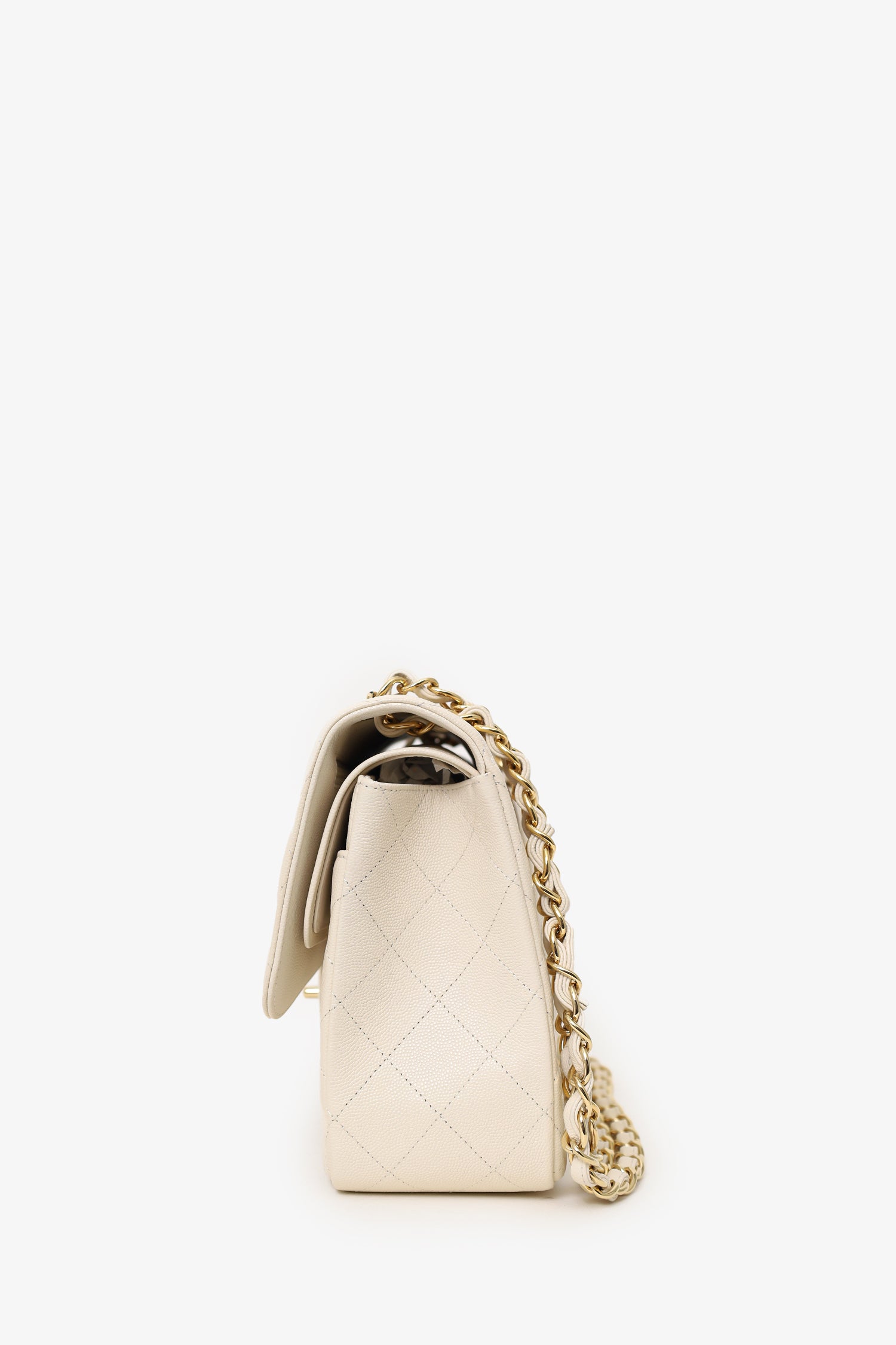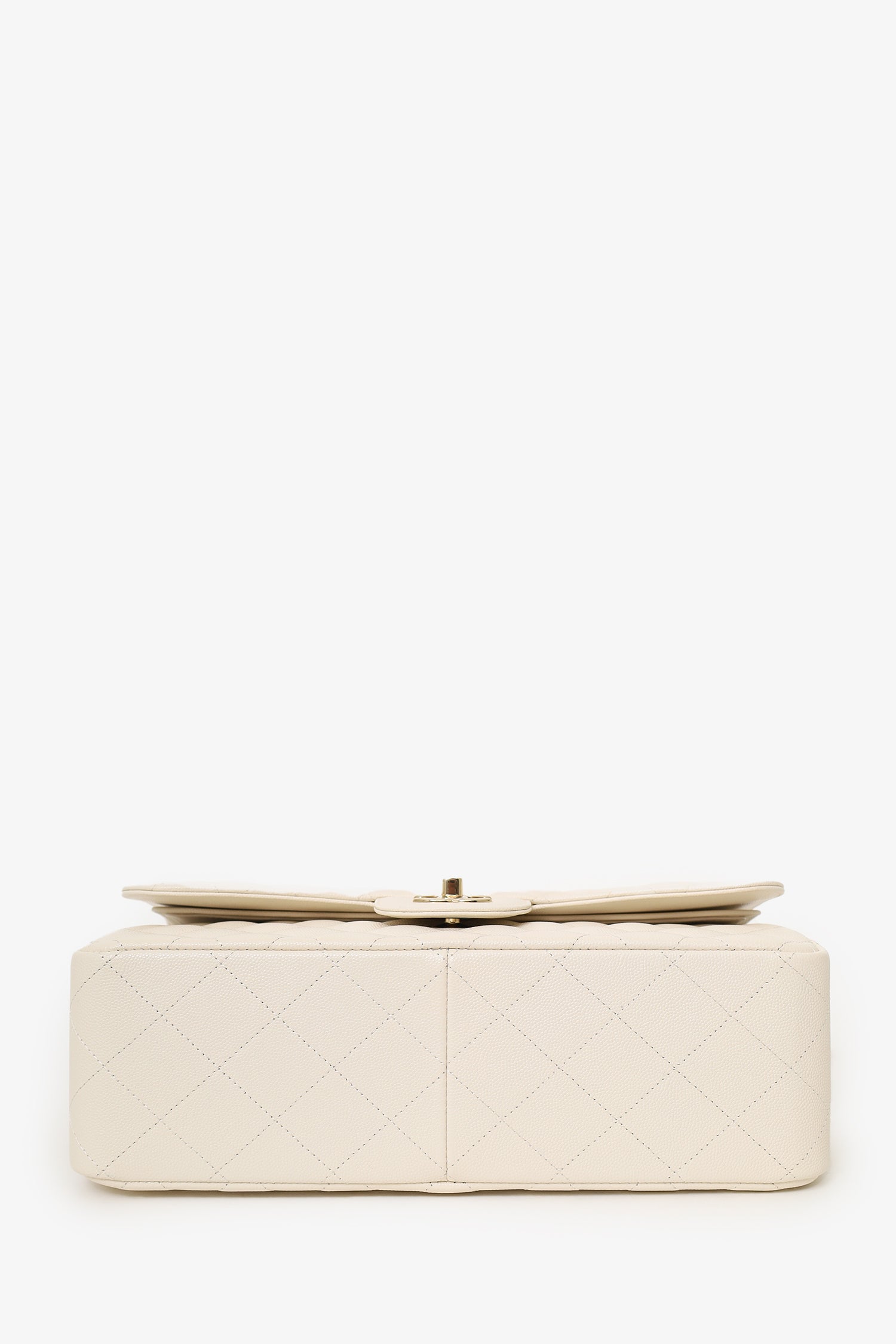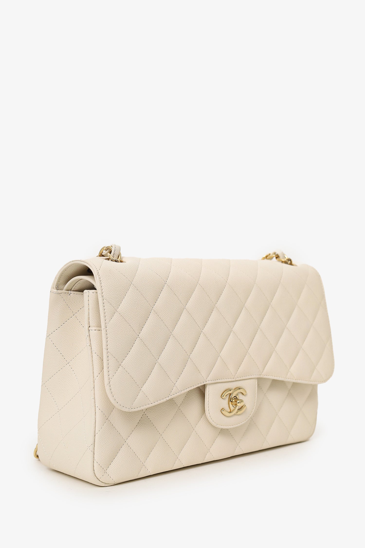 Refresh availabilityPre-Loved Chanel™ 2017 White Caviar Leather Classic Jumbo Double Flap Bag. Front fold-over flap with turn-lock closure. Twin chainlink straps that can be pulled into one long strap. Quilted exterior. Rear exterior slip pocket. Single rear slip compartment under first flap. Secondary fold-over flap with snap-button closure. 2 main interior compartments; front slip, rear with 2 wall slip pockets. Leather-lined interior. Gold-tone hardware. Tonal stitching.