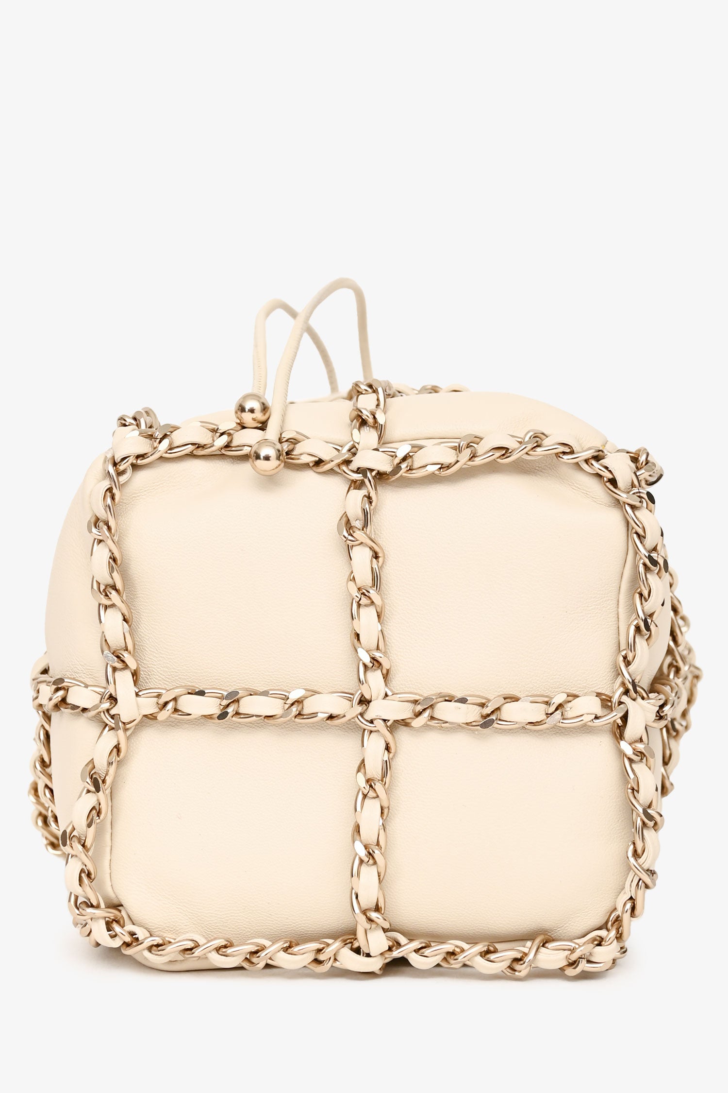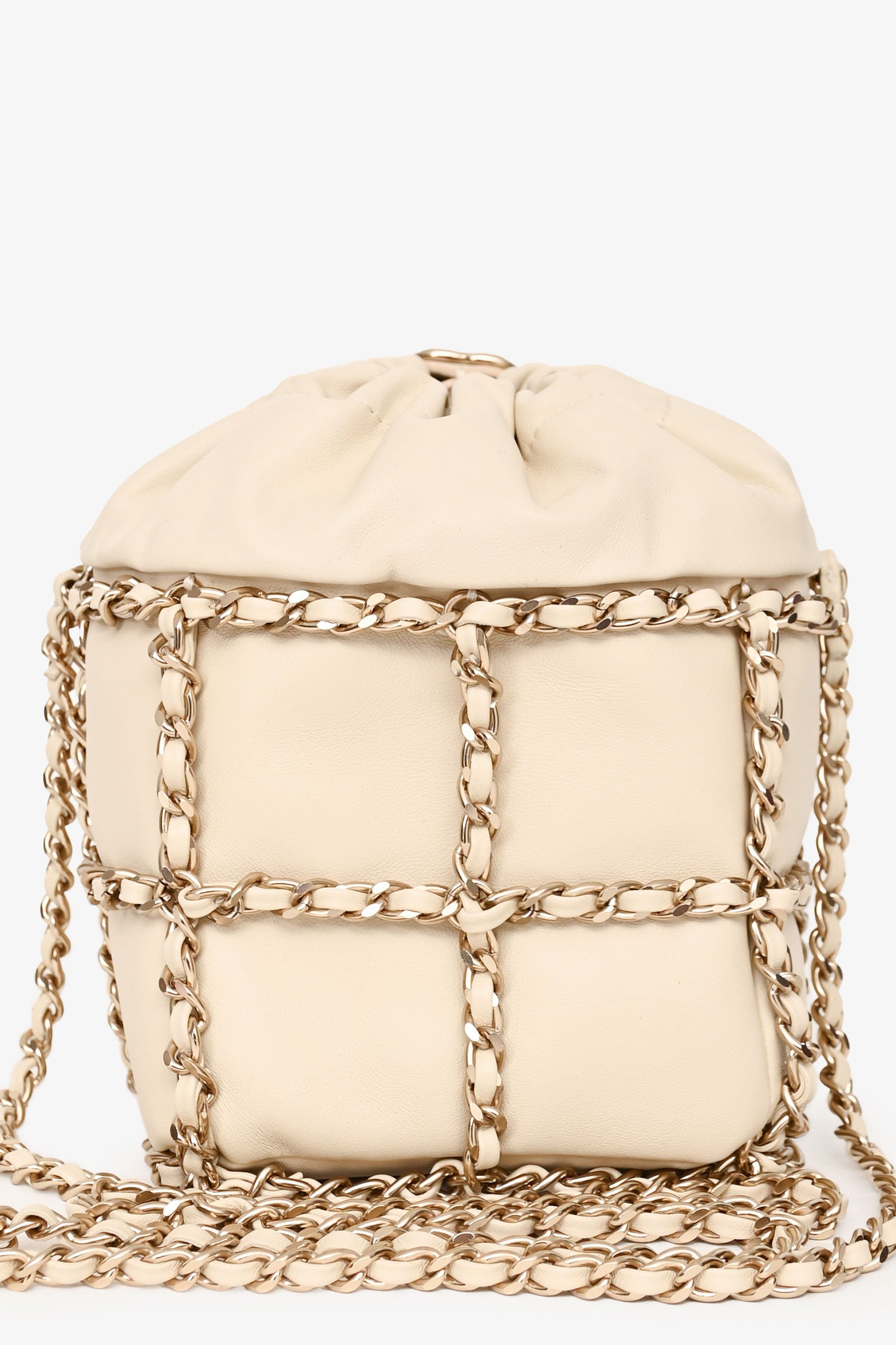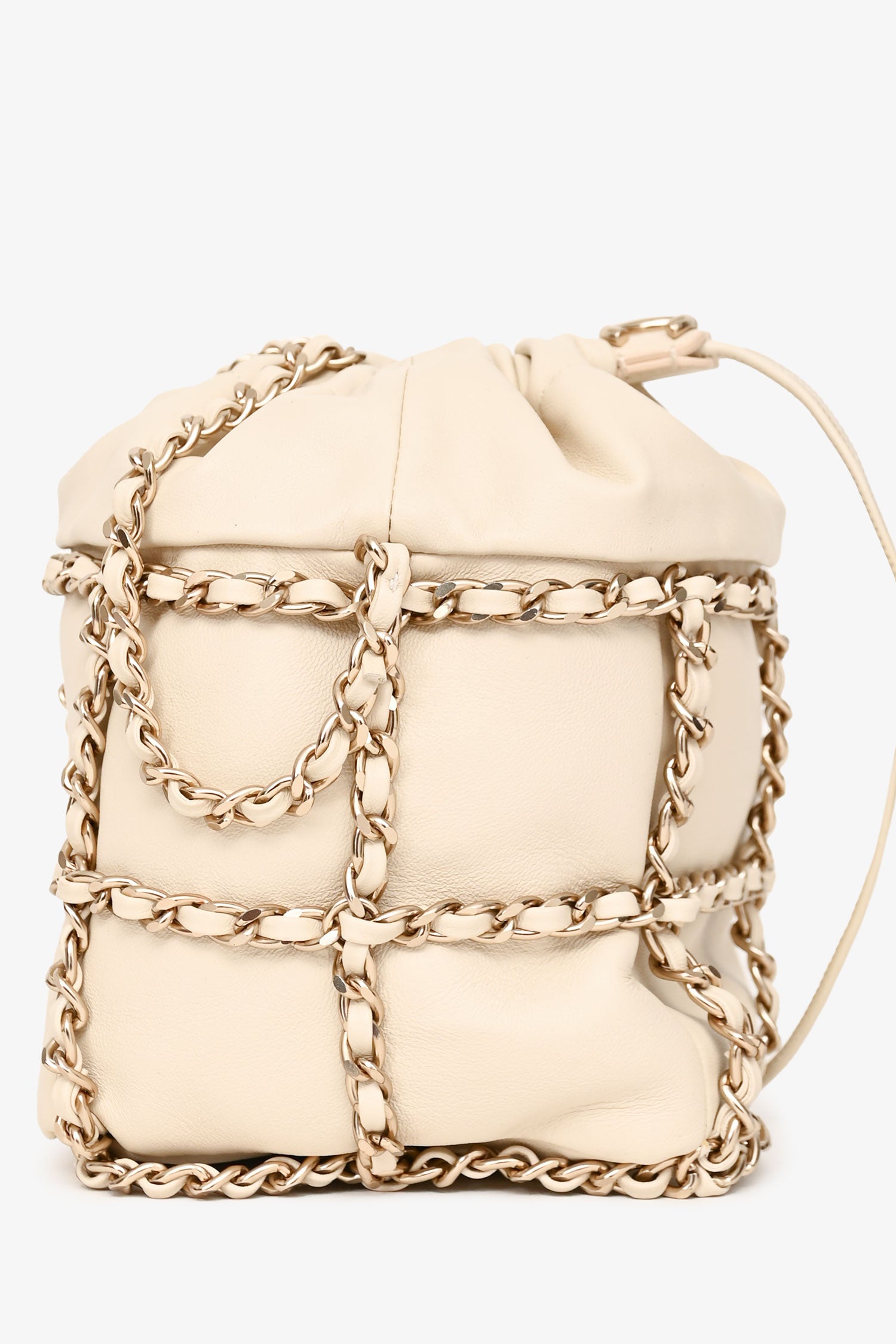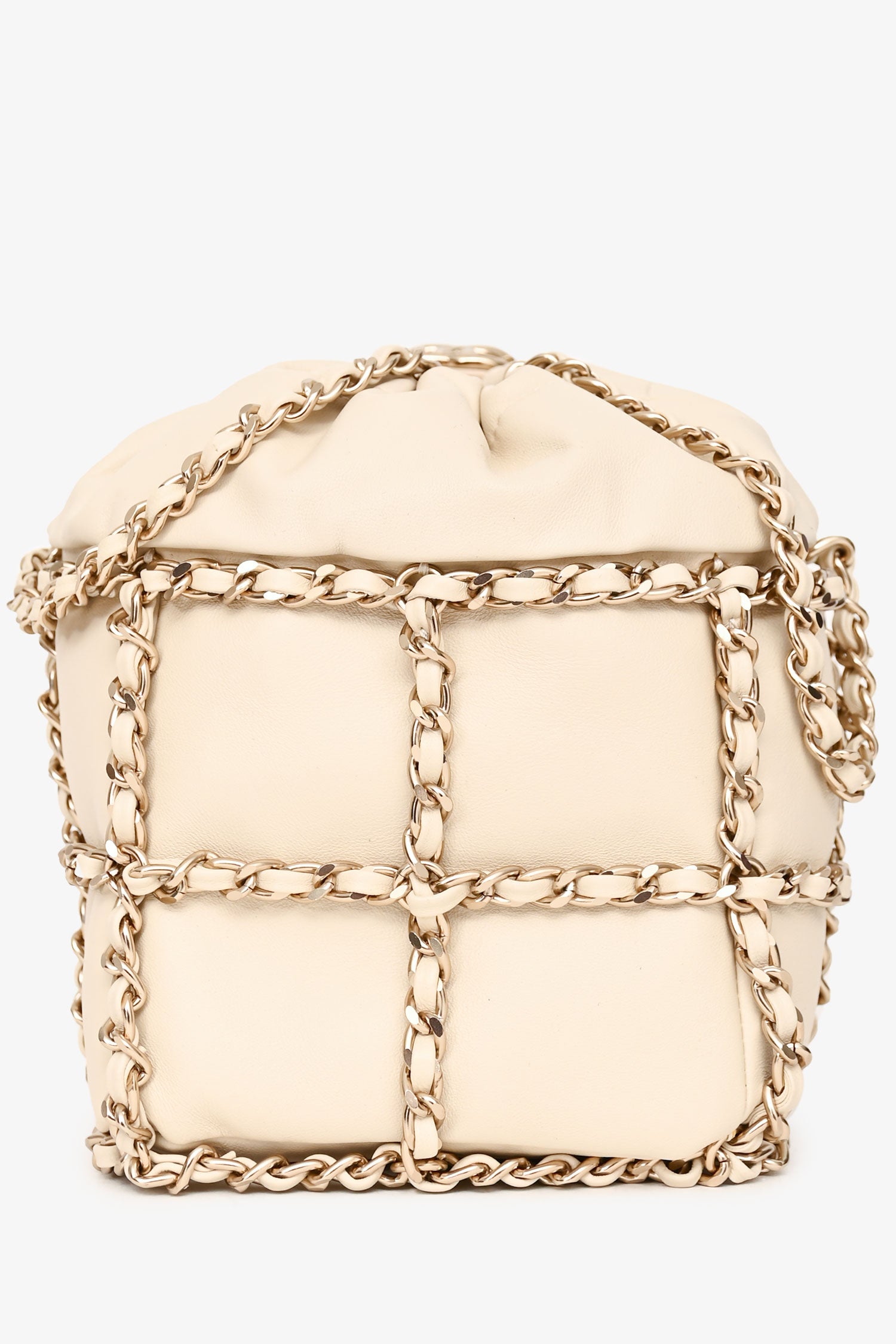 Refresh availabilityPre-Loved Chanel™ 2019-20 Cream Lambskin Leather Bucket Chain Drawstring Bag. Gold-tone hardware. Chain-link detailing and strap. Adjustable pull-tab. Lined interior with a slip compartment. Tonal stitching.