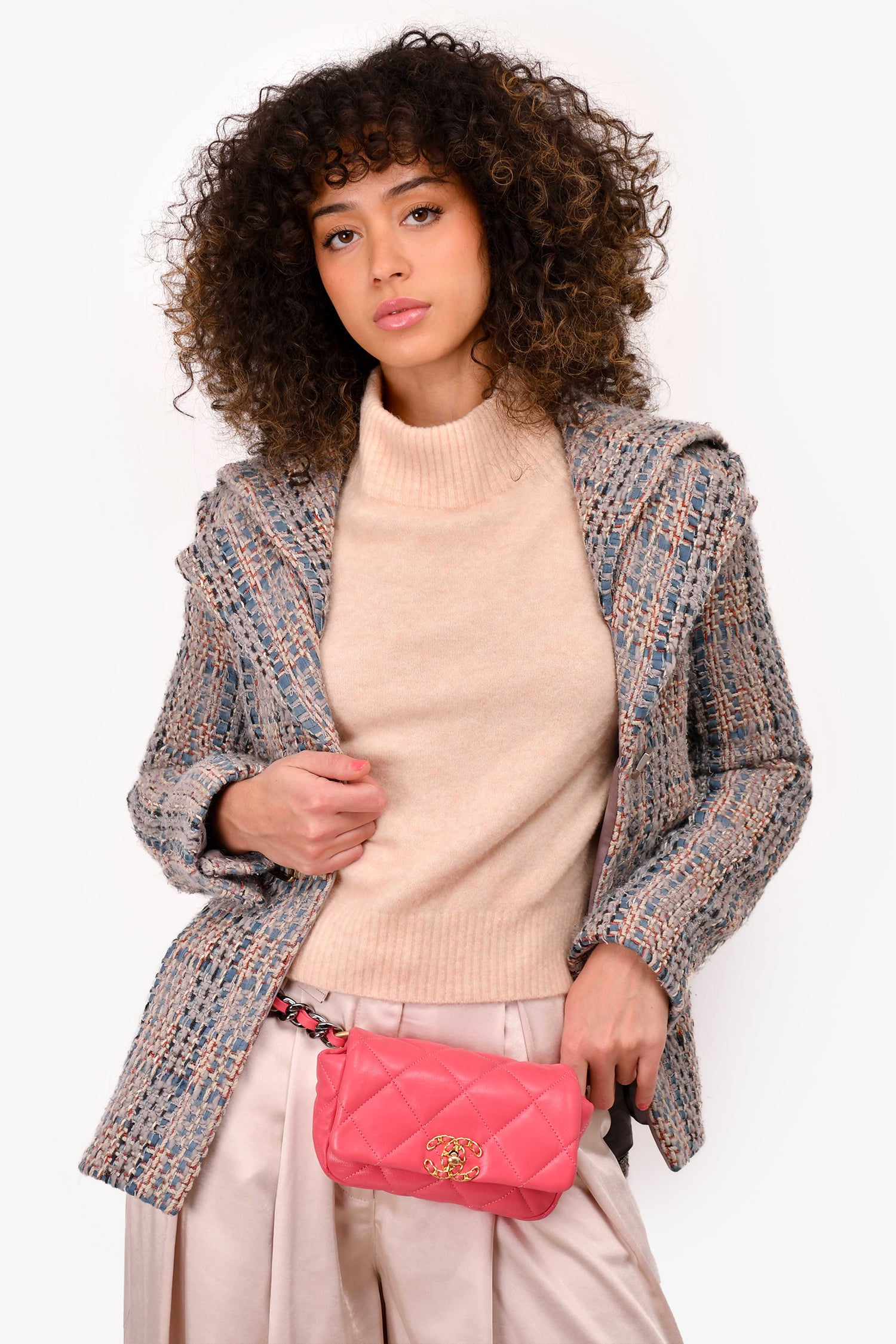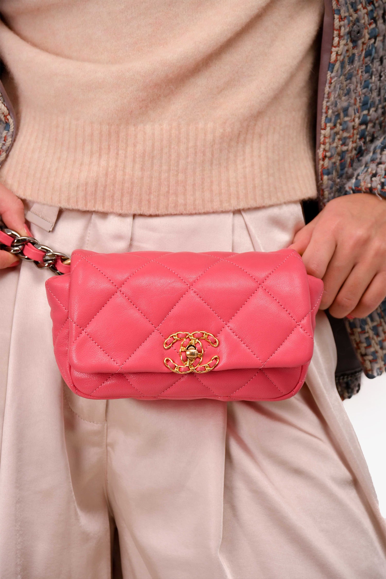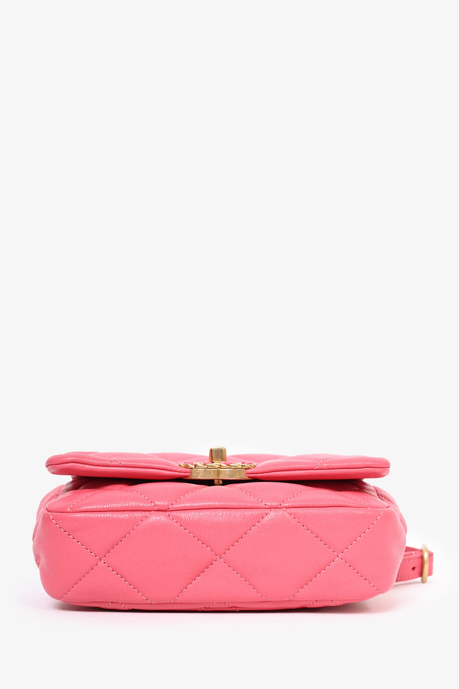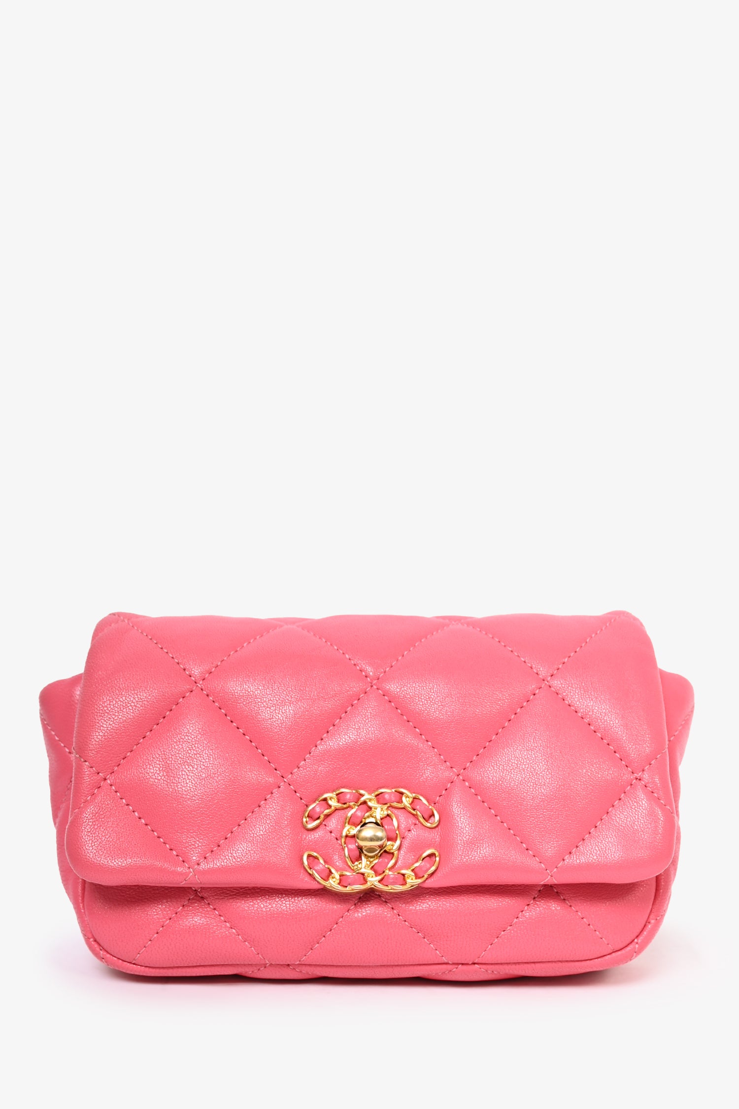 Refresh availabilityPre-Loved Chanel™ 2019 Pink Lambskin 19 2-Tone Chain Belt Bag. Tonal stitching. Gold-tone hardware. Single interior compartment. Strap with 2-tone hardware accents. Interlocking turn-lock 'CC' closure.