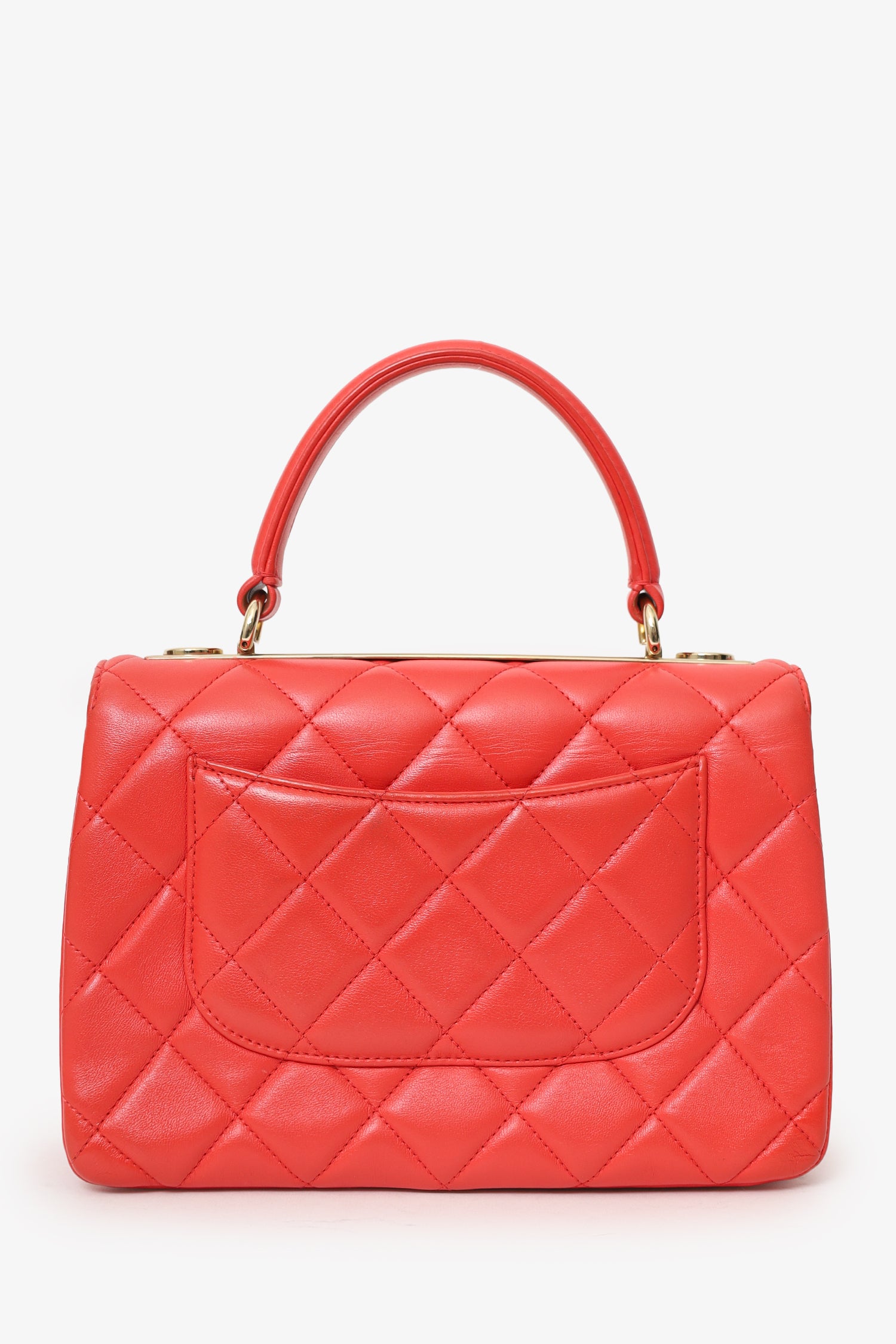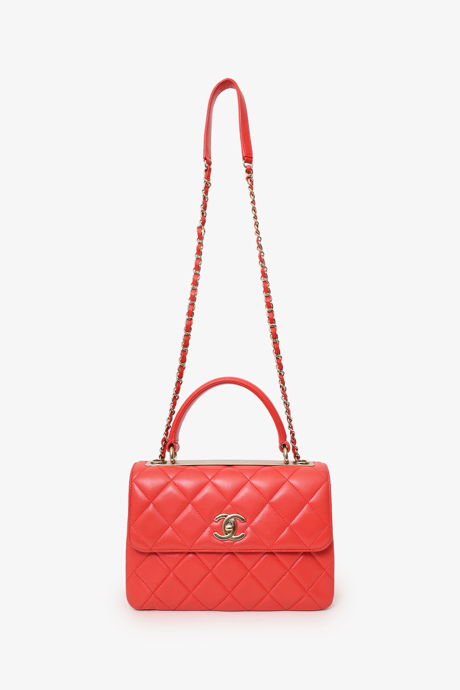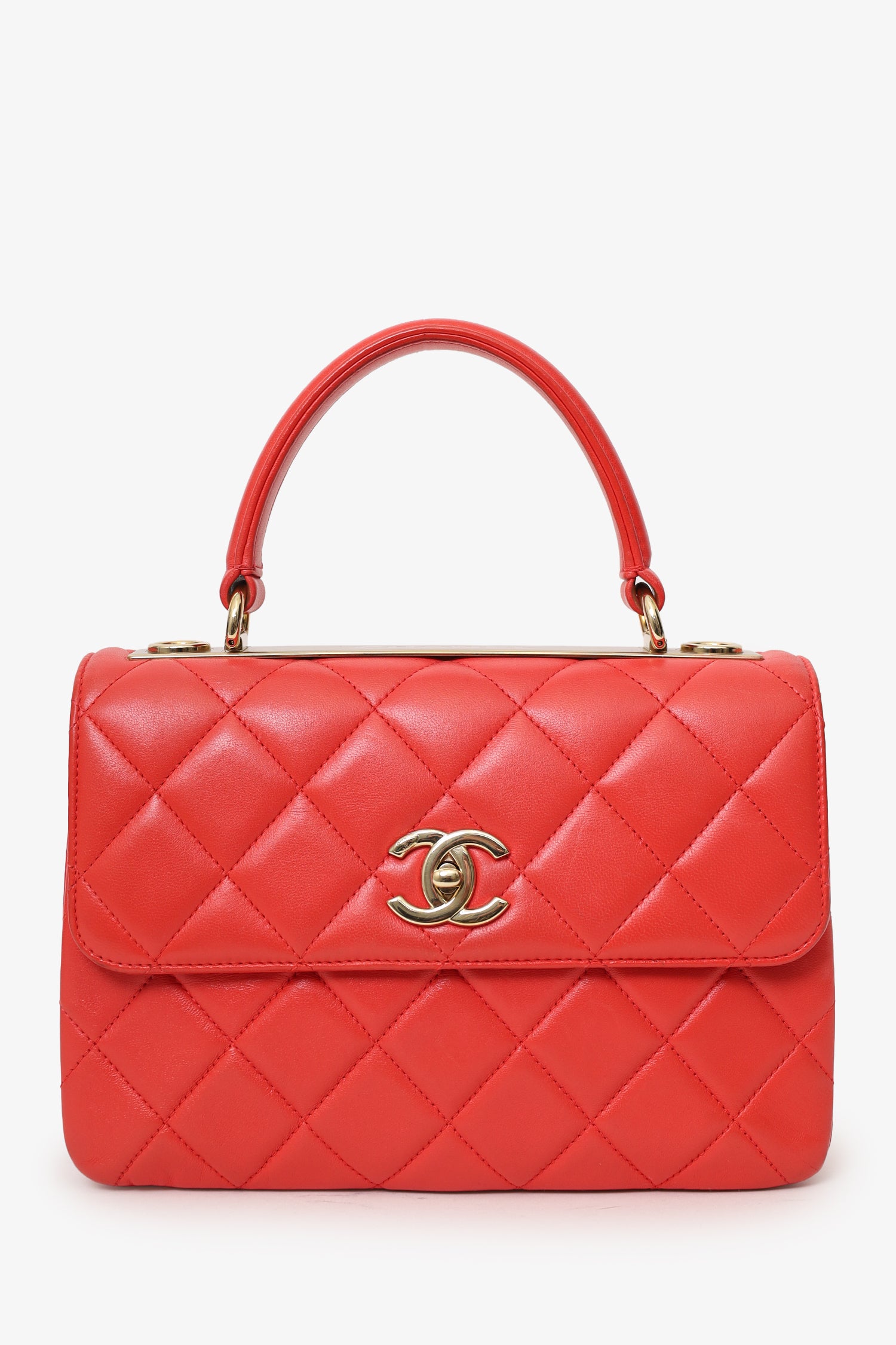 Refresh availabilityPre-Loved Chanel™ 2019 Red Leather Trendy CC Small Top Handle. Front fold-over flap with turn-lock closure. Removable chainlink shoulder strap. Single exterior rear slip pocket. Leather-lined interior with 7 pockets; 5 slip; 1 zip, and 1 lipstick. Gold-tone hardware. Tonal stitching.