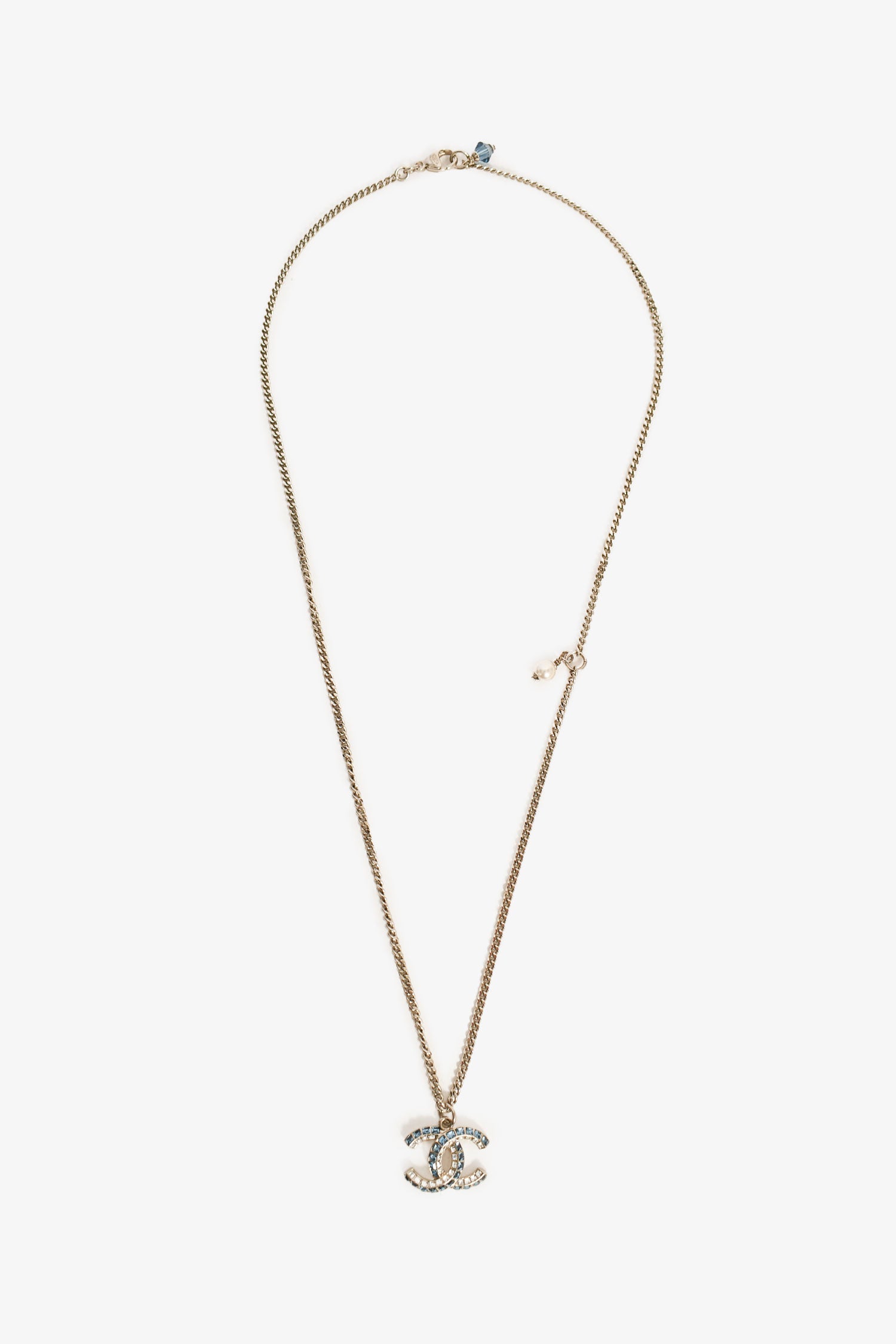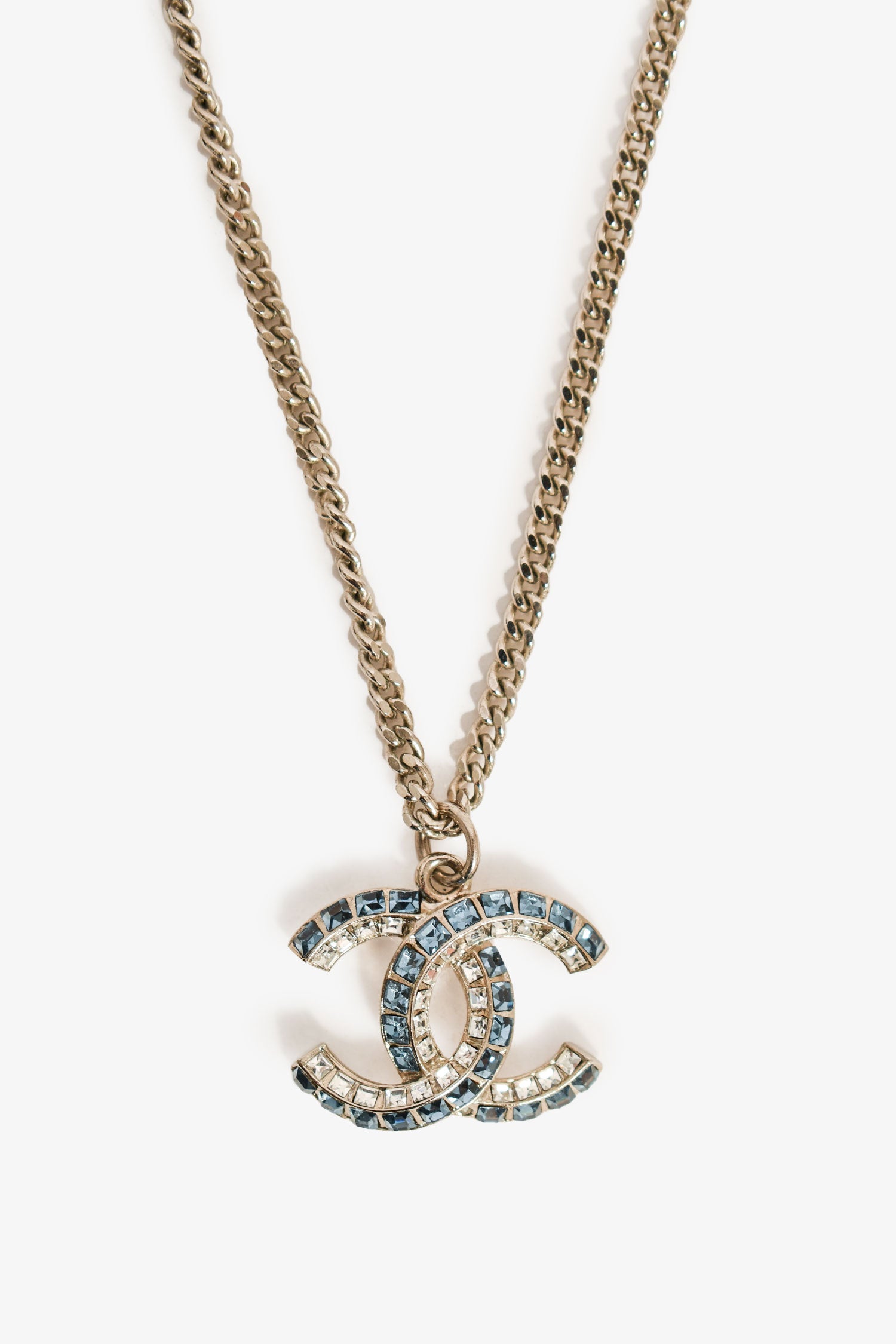 Refresh availabilityPre-Loved Chanel™ 2019 Silver Toned Blue Crystal CC Long Necklace. Chain-link strand with a lobster clasp closure. Pearl drop. Blue-tone and clear crystal embellished logo.