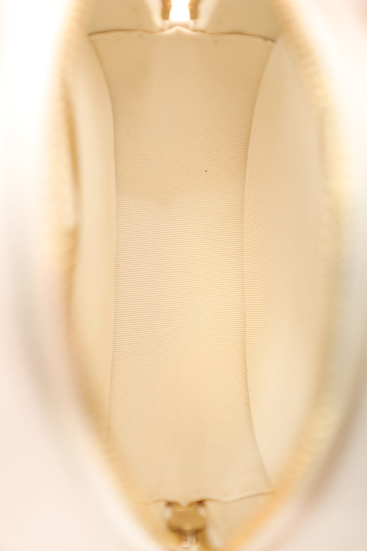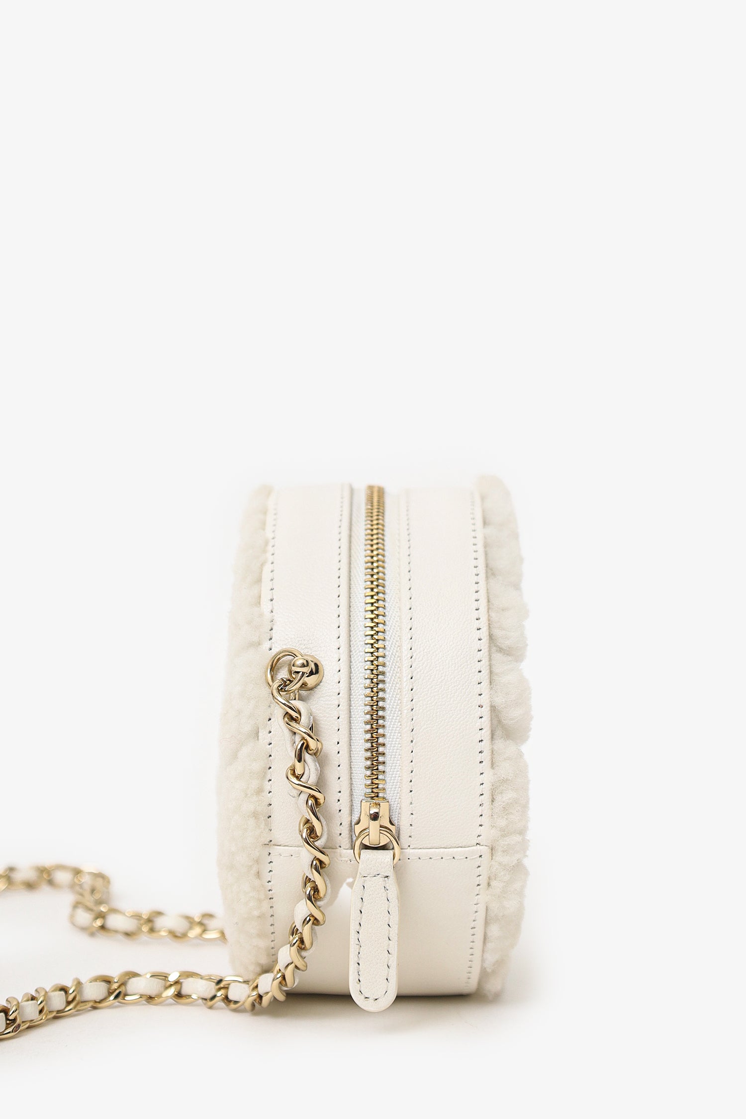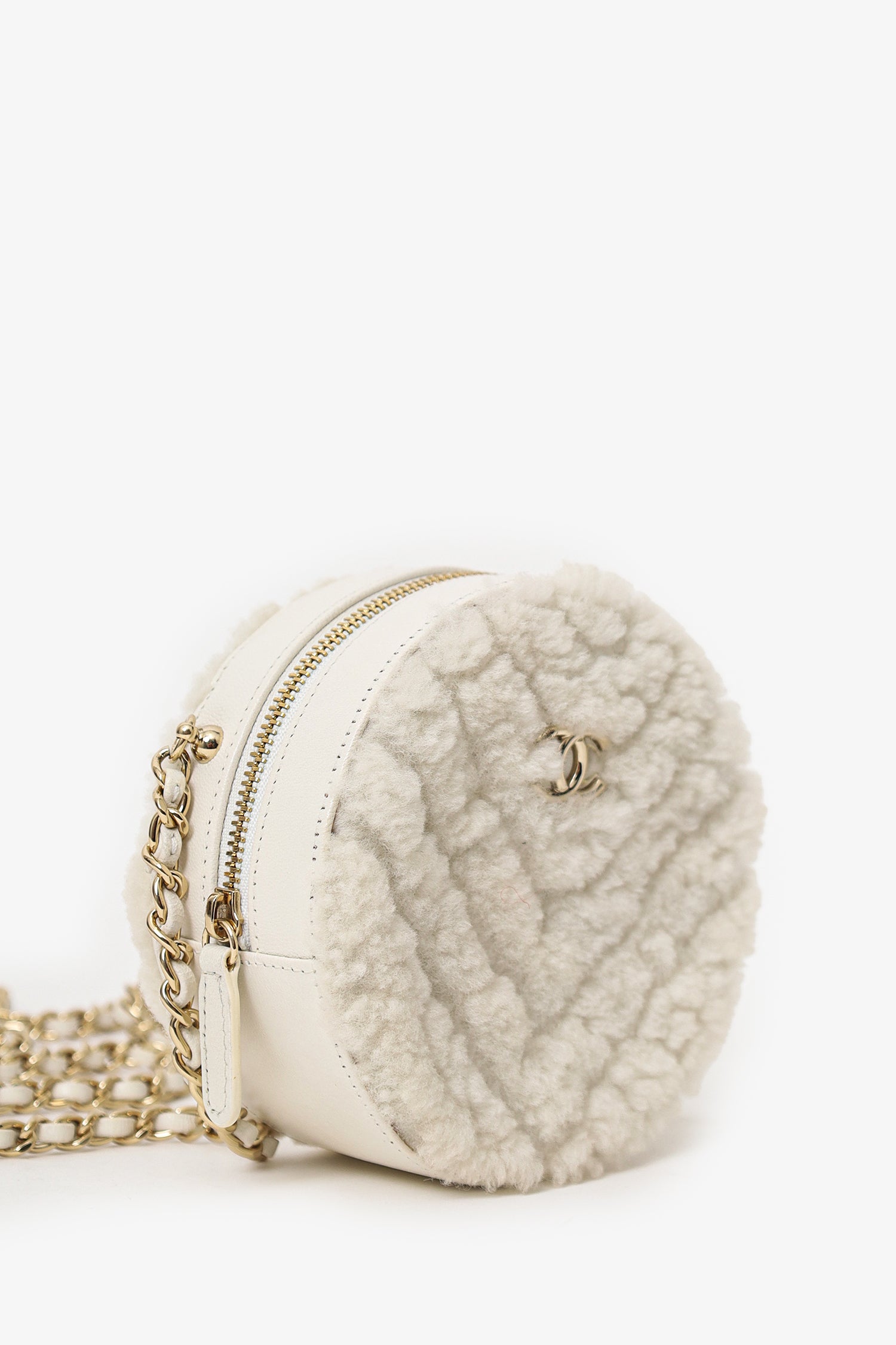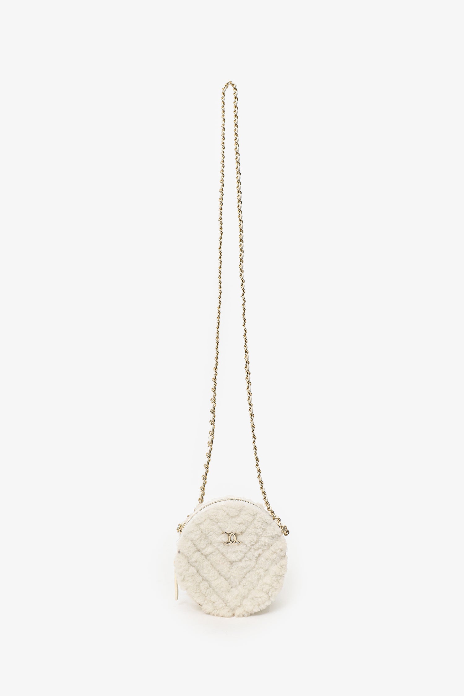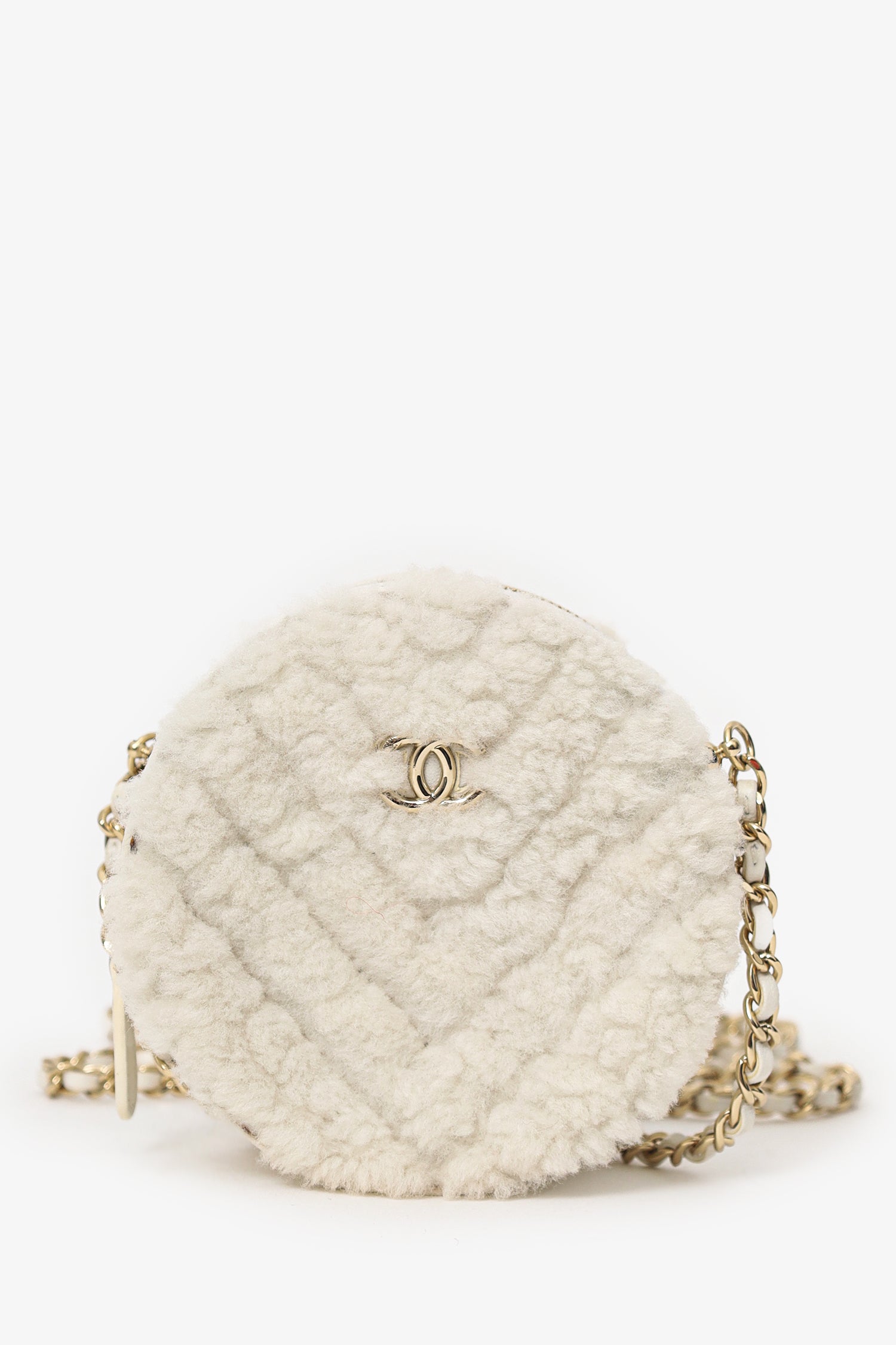 Refresh availabilityPre-Loved Chanel™ 2019 White Shearling Chevron Round Crossbody. Top zip closure. Chainlink crossbody strap. Lined interior. 2 interior slip pockets. Gold-tone hardware. Tonal stitching.