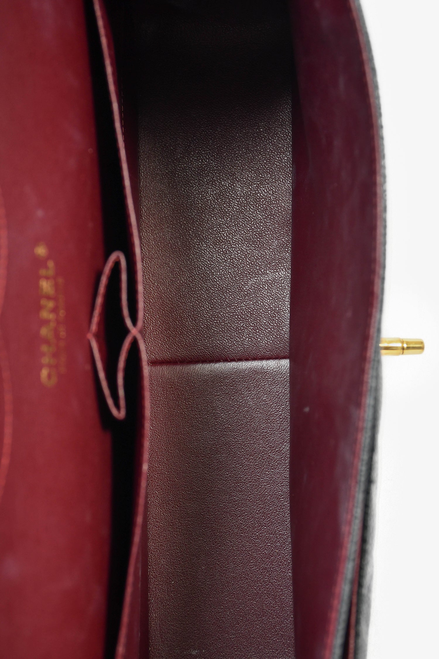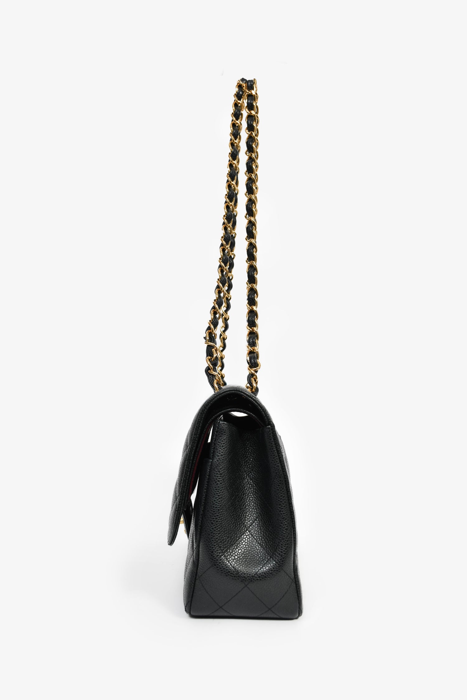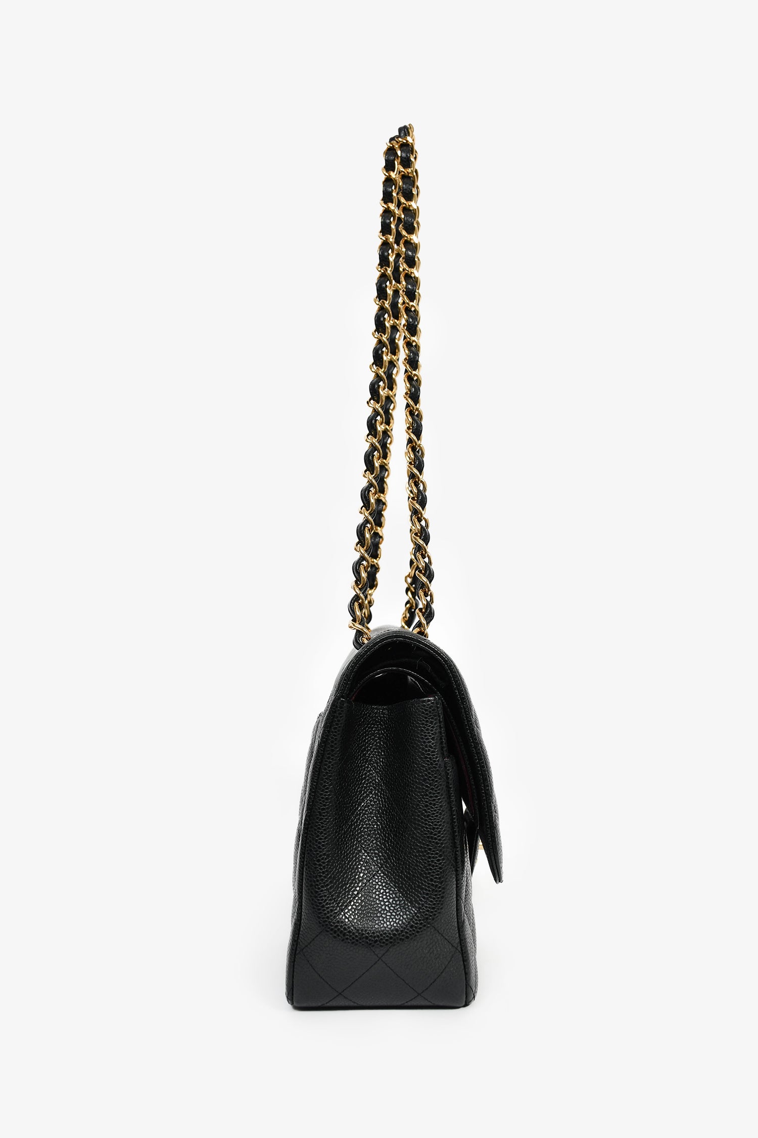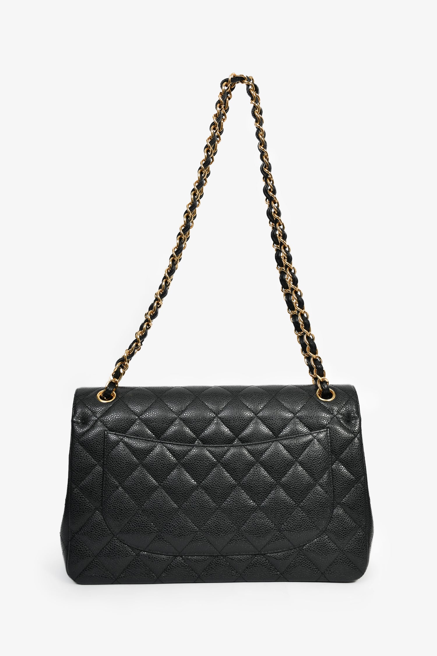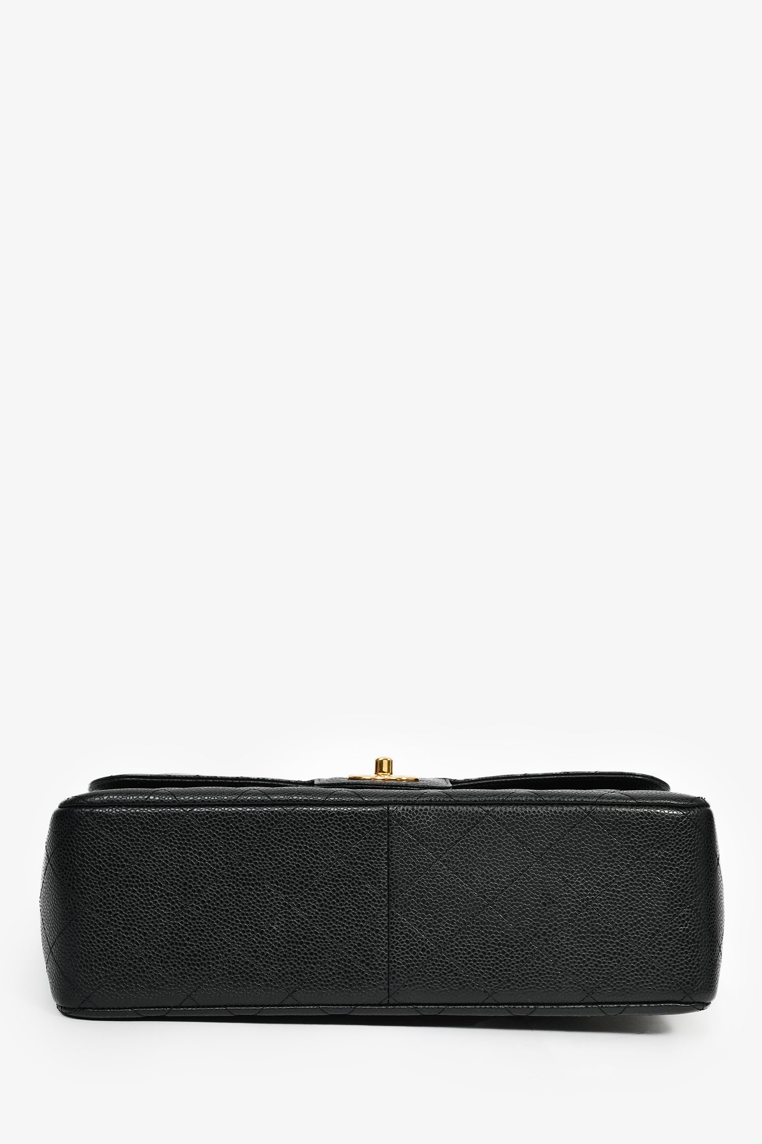 Pre-Loved Chanel™ 2021 Black Caviar Leather Jumbo Double Flap Bag GHW. Double fold-over flaps with turn-lock closure. Twin chainlink strap that can be pulled into one longer strap. Zip pocket on underside of flap. Exterior front and rear slip pockets. Single interior compartments with two wall slip pockets. Gold-tone hardware. Tonal stitching.