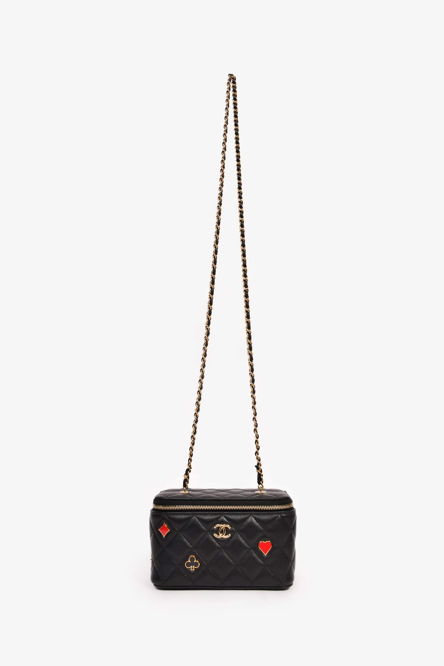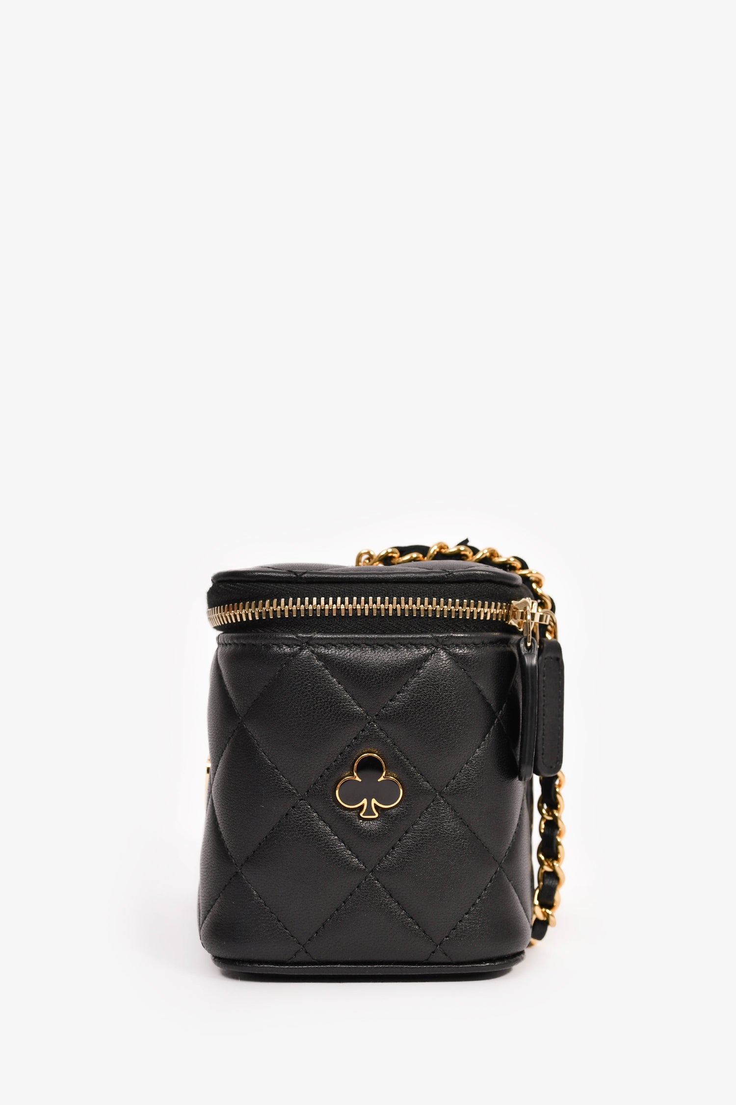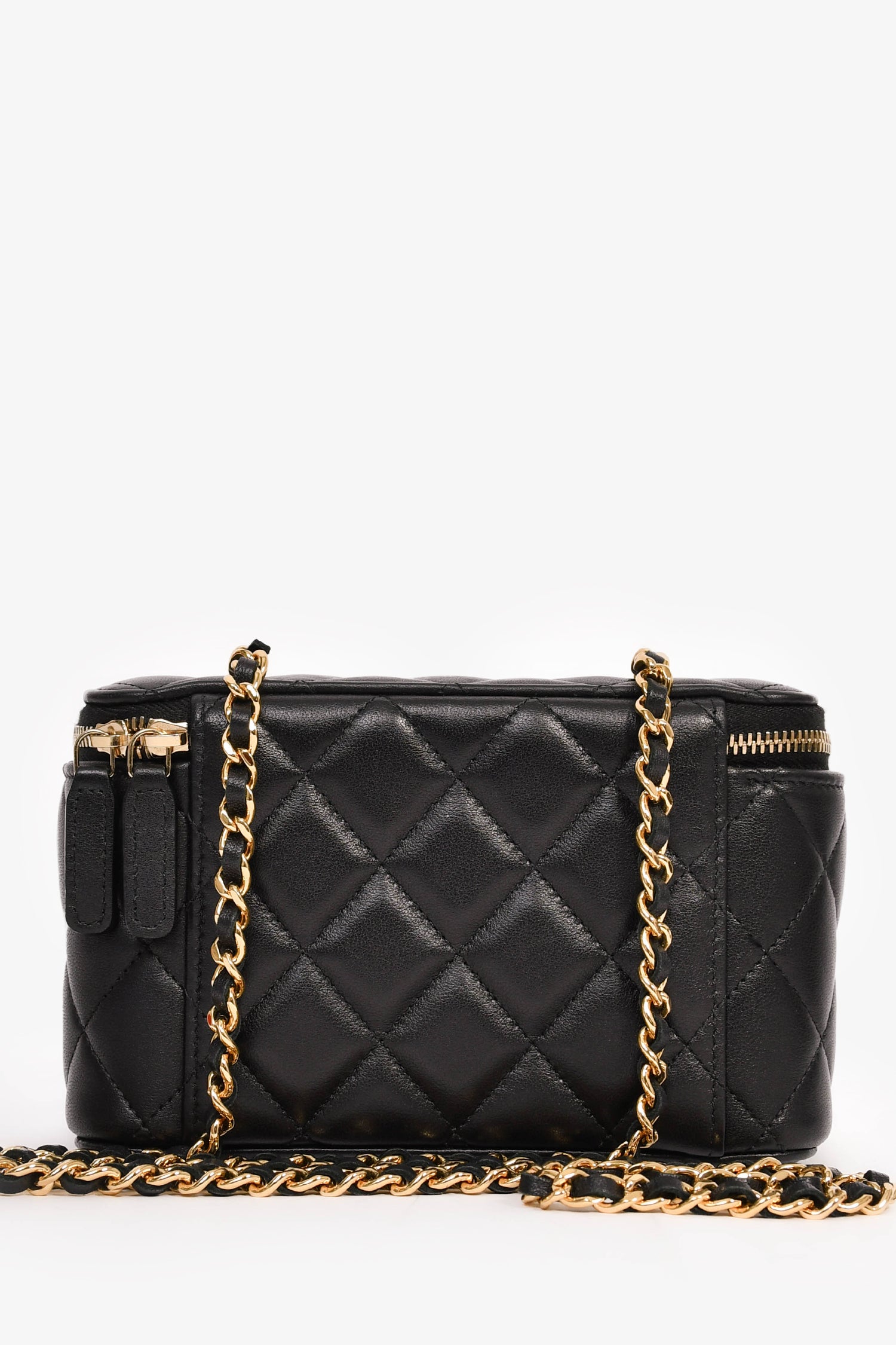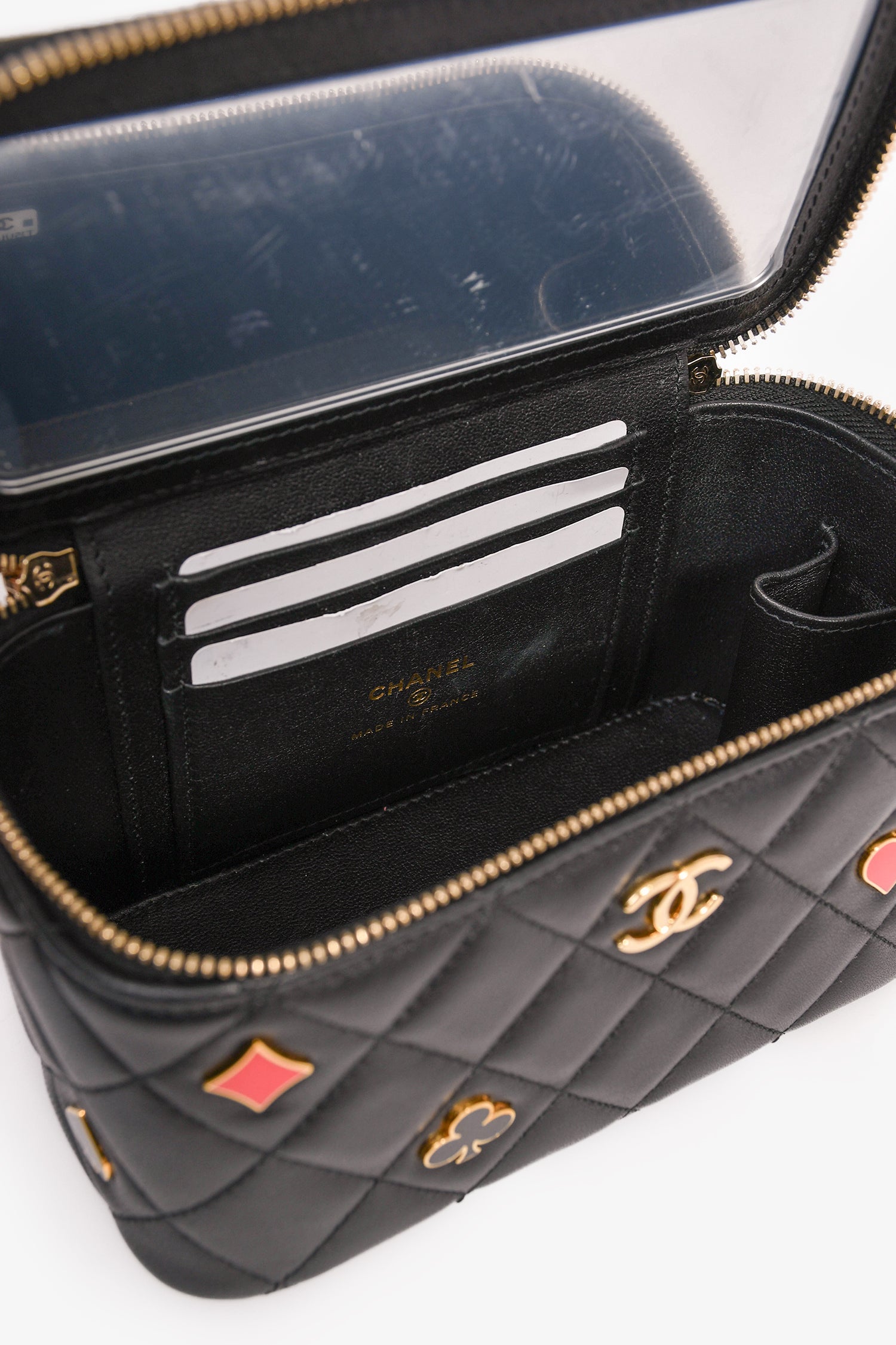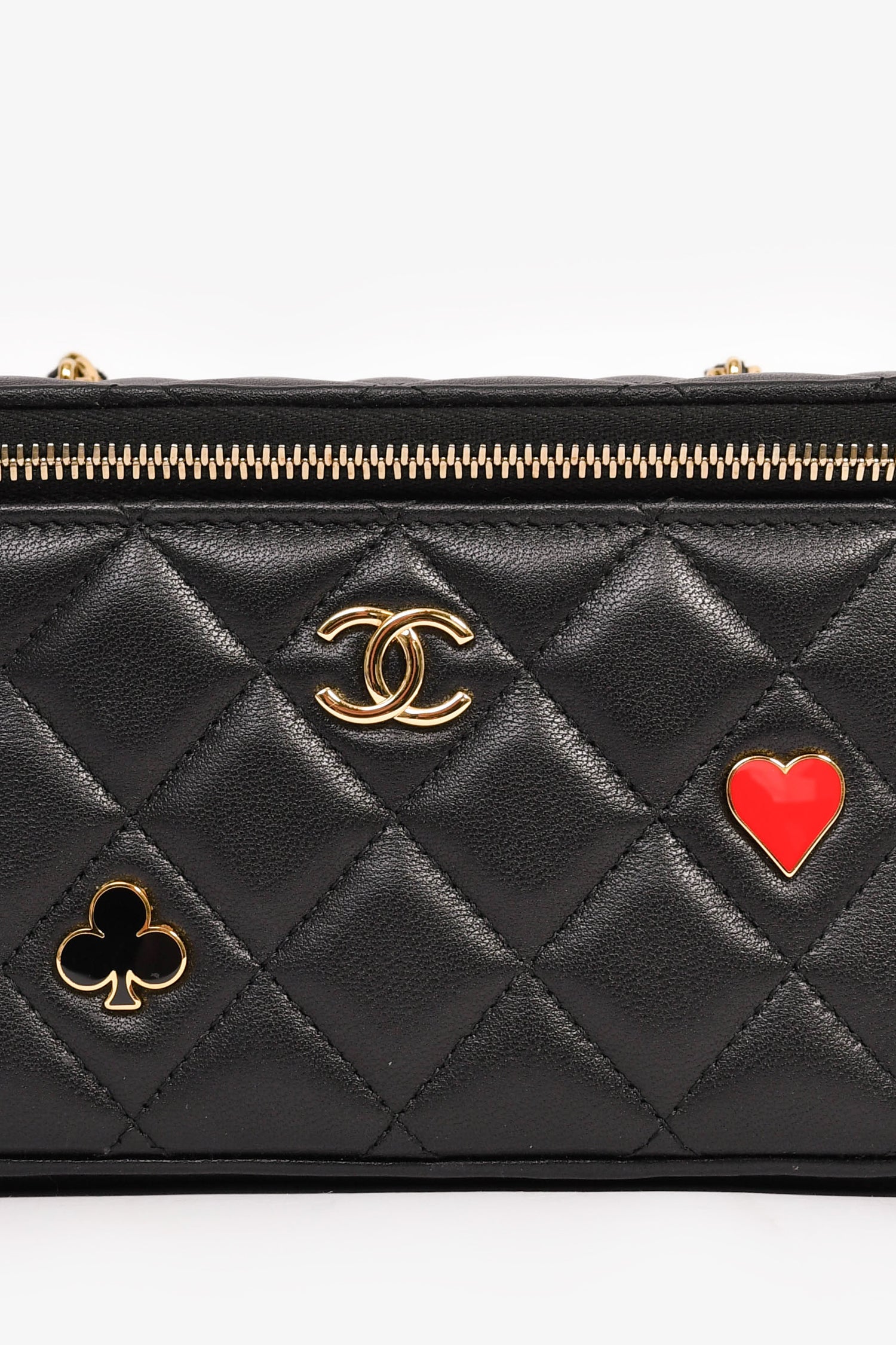 Pre-Loved Chanel™ 2021+ Black Lambskin Leather Coco Casino Small Vanity Case Crossbody. Top 2-way zip closure. Built-in mirror on the interior of the front flap. 3 interior wall card slots. Gold-tone hardware. Tonal stitching.