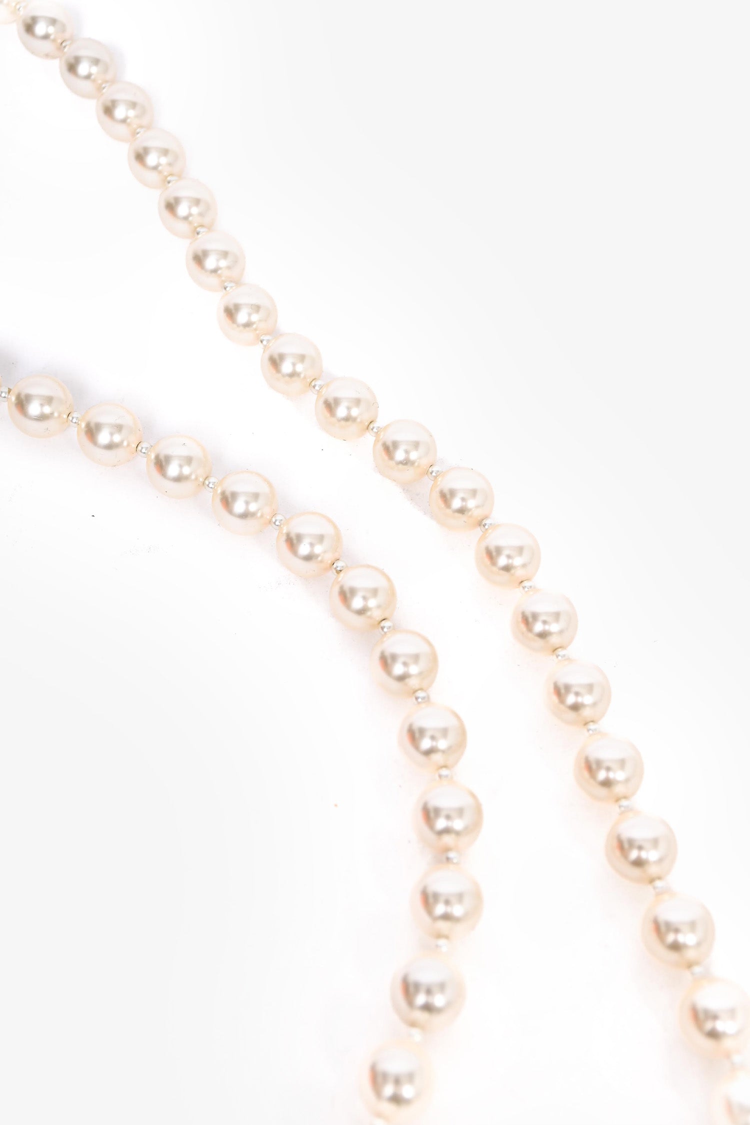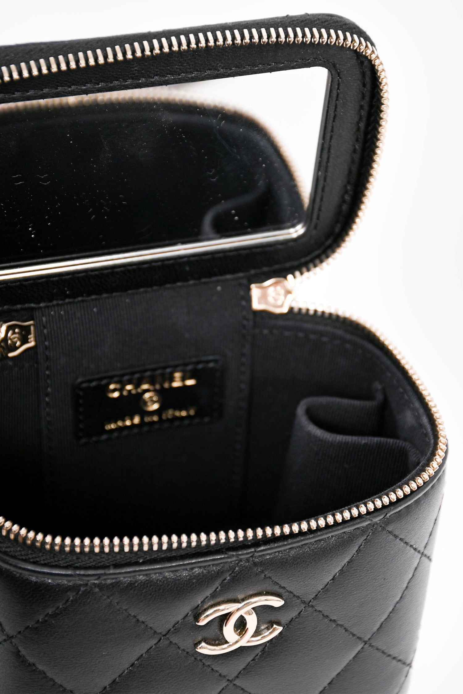 Pre-Loved Chanel™ 2021 Black Lambskin Mini Pearl Strap Vanity Case. Tonal stitching. Gold-tone hardware. Faux pearl strap with chain-link accents. Mirror in interior. Grosgrain lined interior.