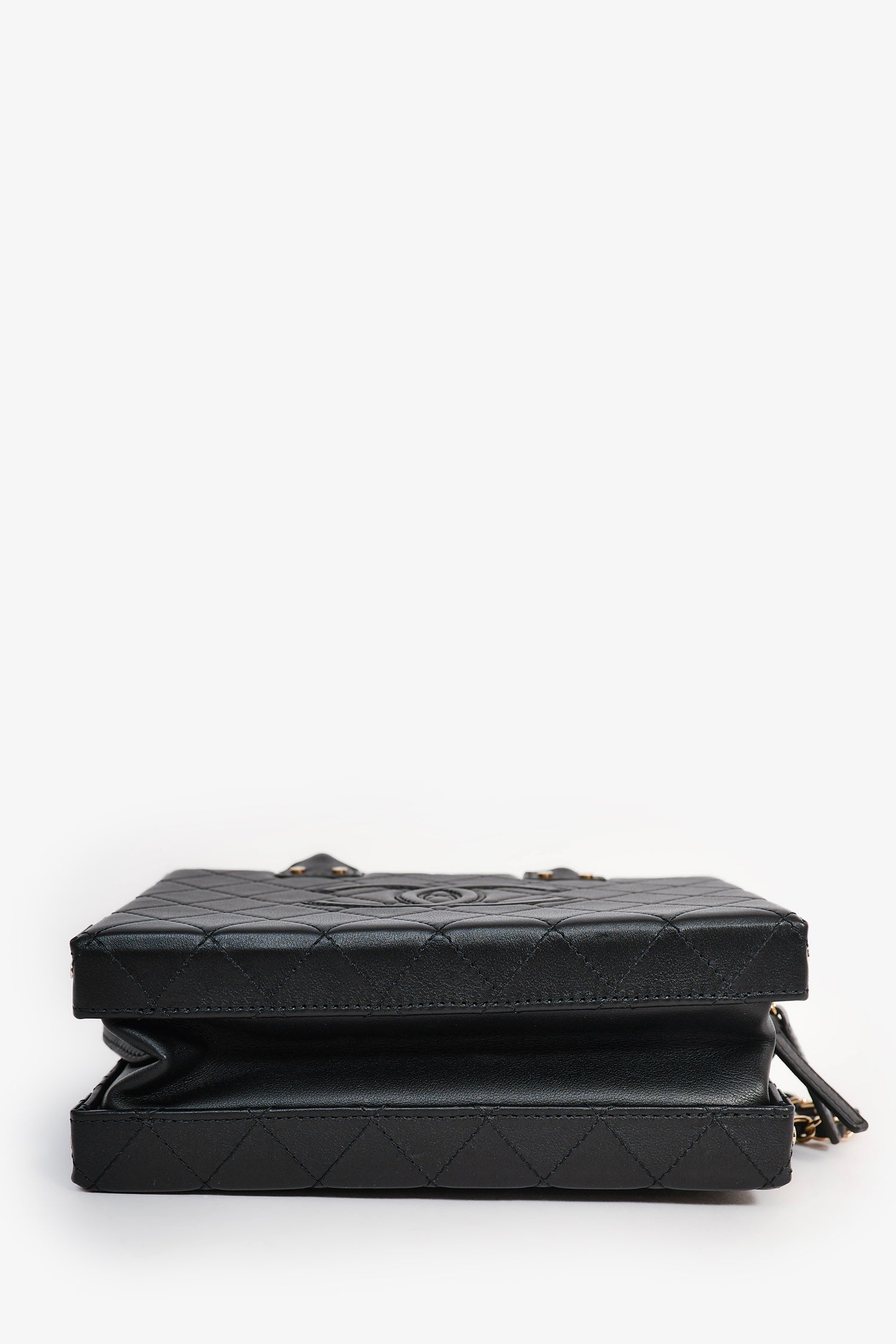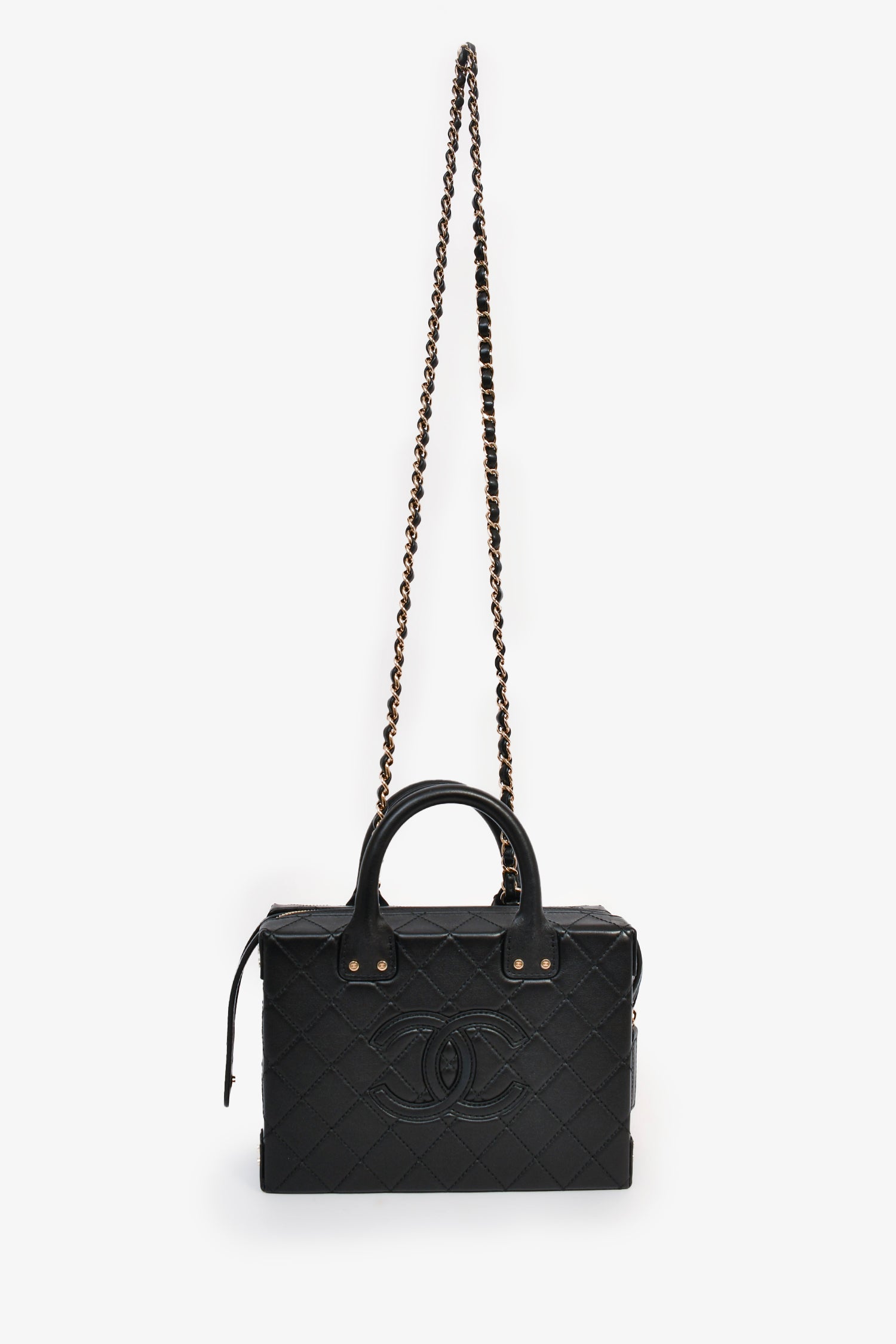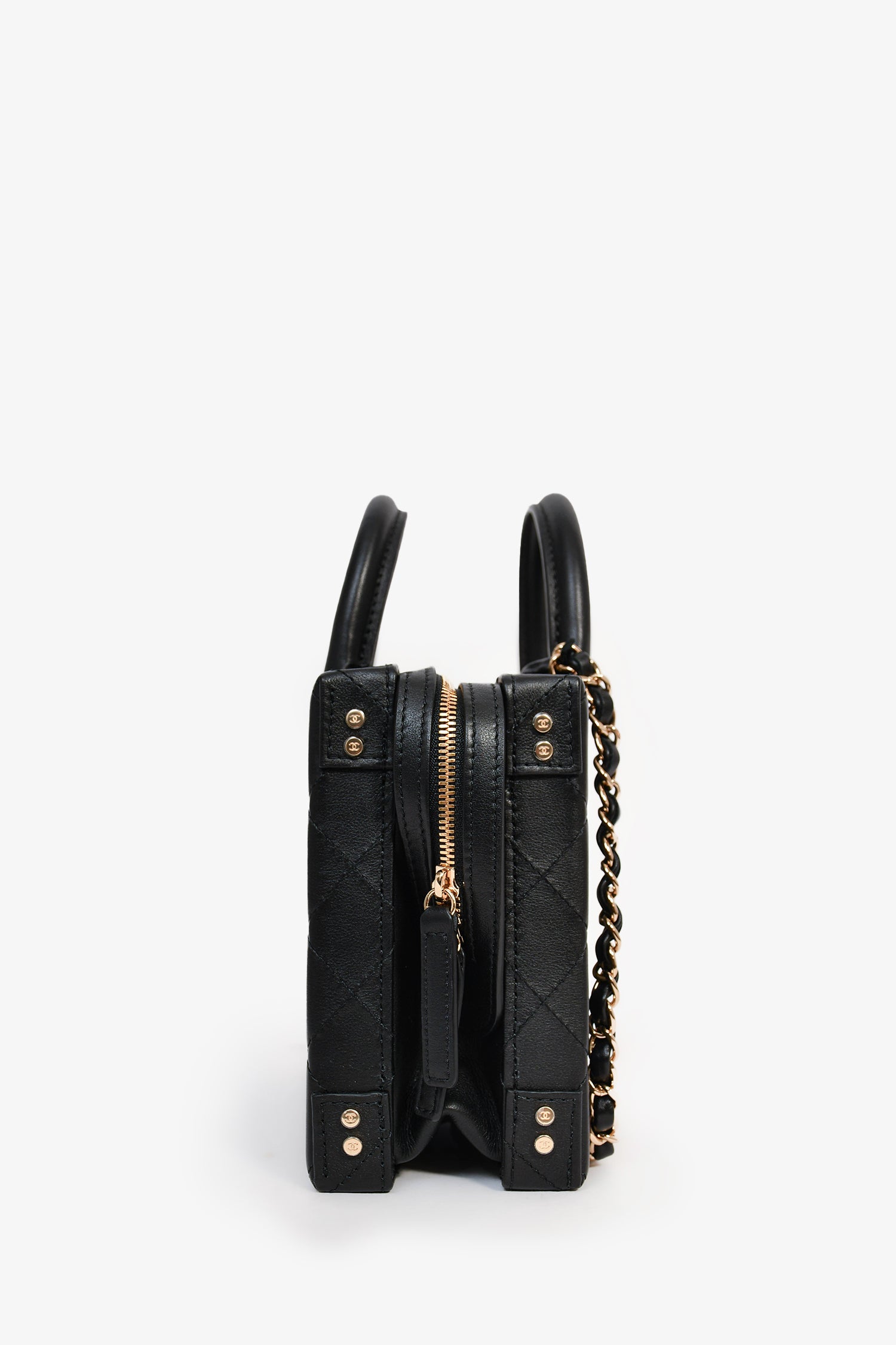 Refresh availabilityPre-Loved Chanel™ 2021+ Black Leather 'Coco Vault' Top Handle with Chain. 2 rolled top handles. Bifold opening with gold-tone hardware. Lined interior with 2 pockets. Chain-link and leather strap. Tonal stitching.