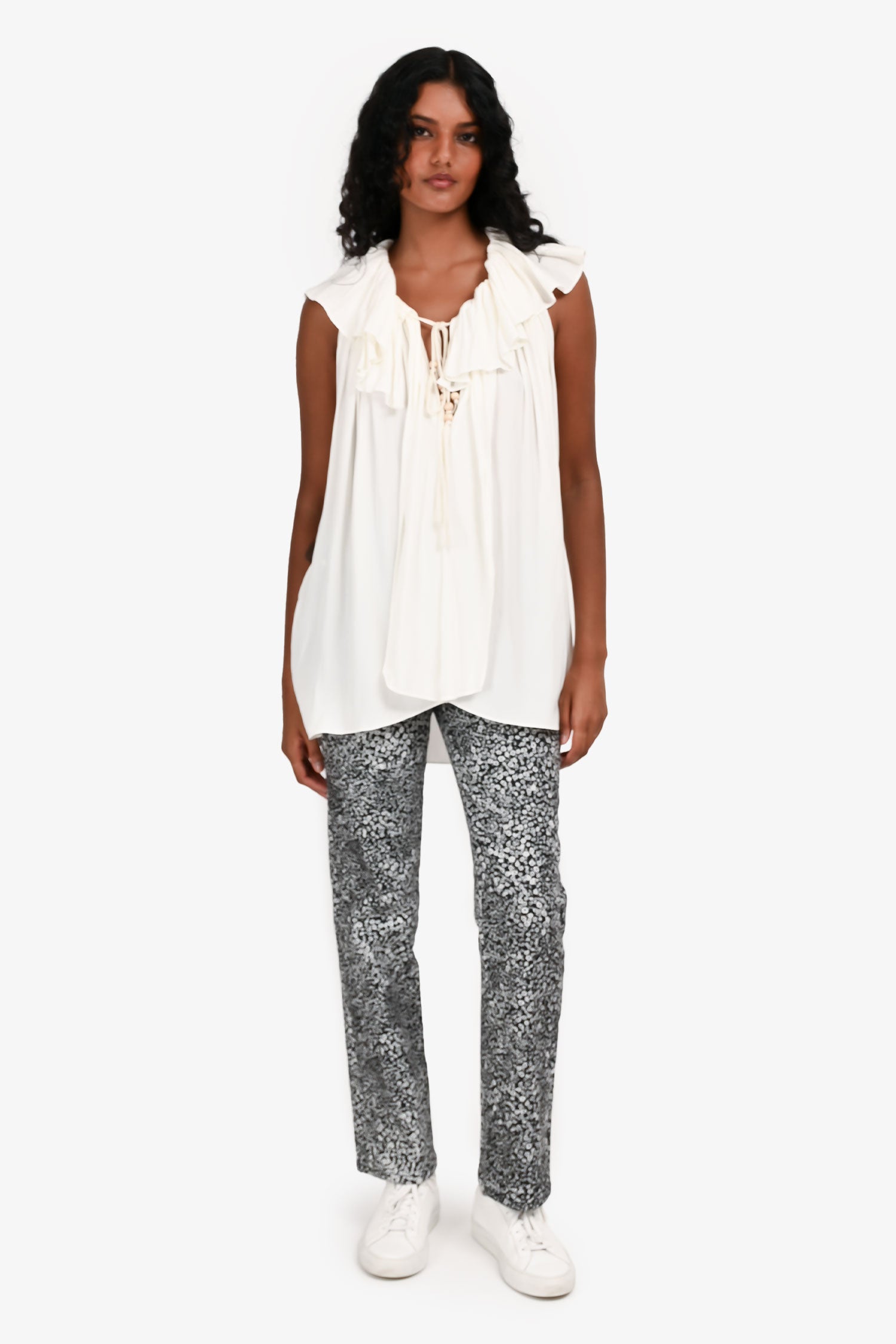 Refresh availabilityPre-Loved Chanel™ 2021 Black/White Camellia Print Slim Tapered Jeans. Front pockets. Zip fly with button closure. Belt loops. Tonal stitching.