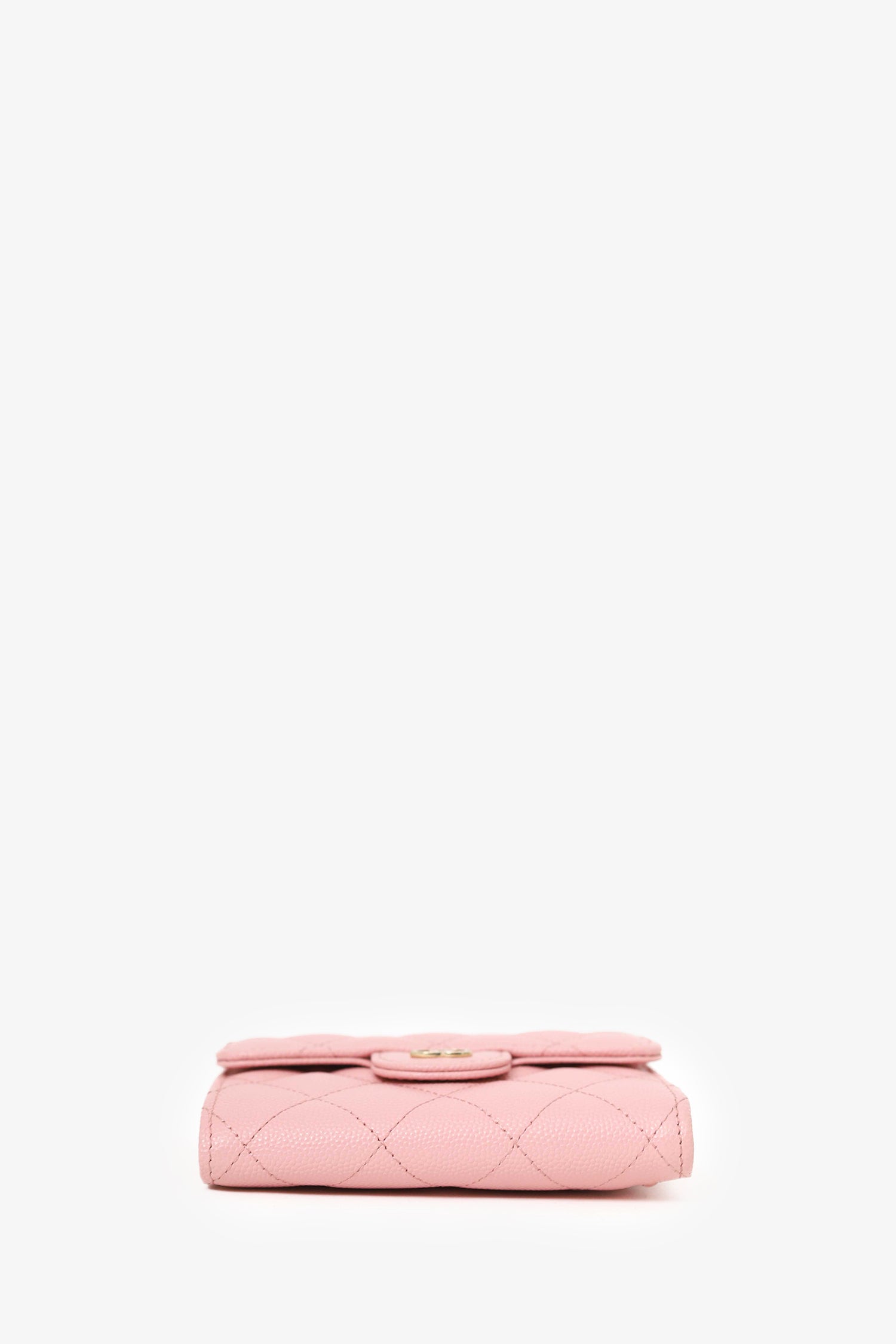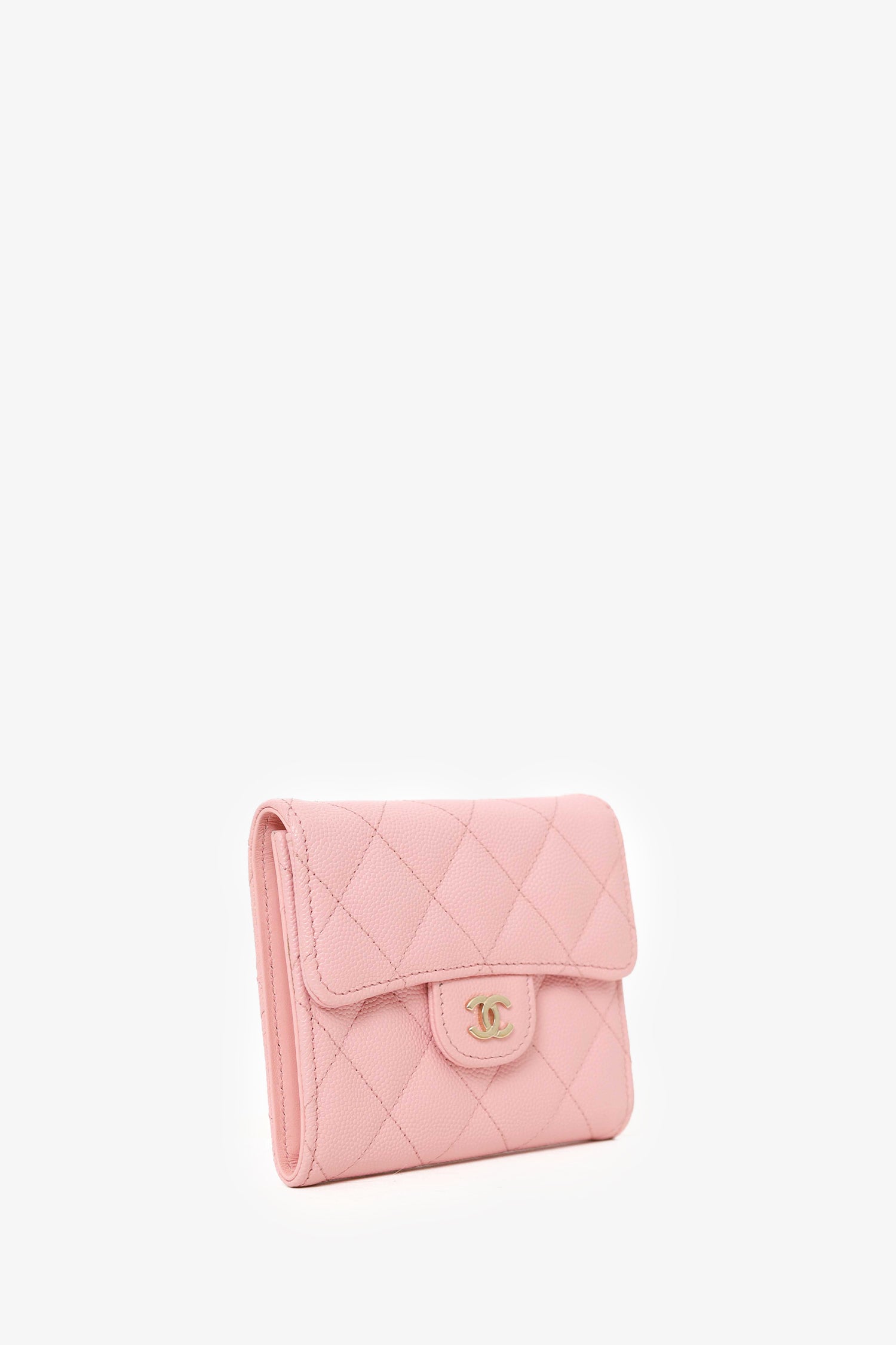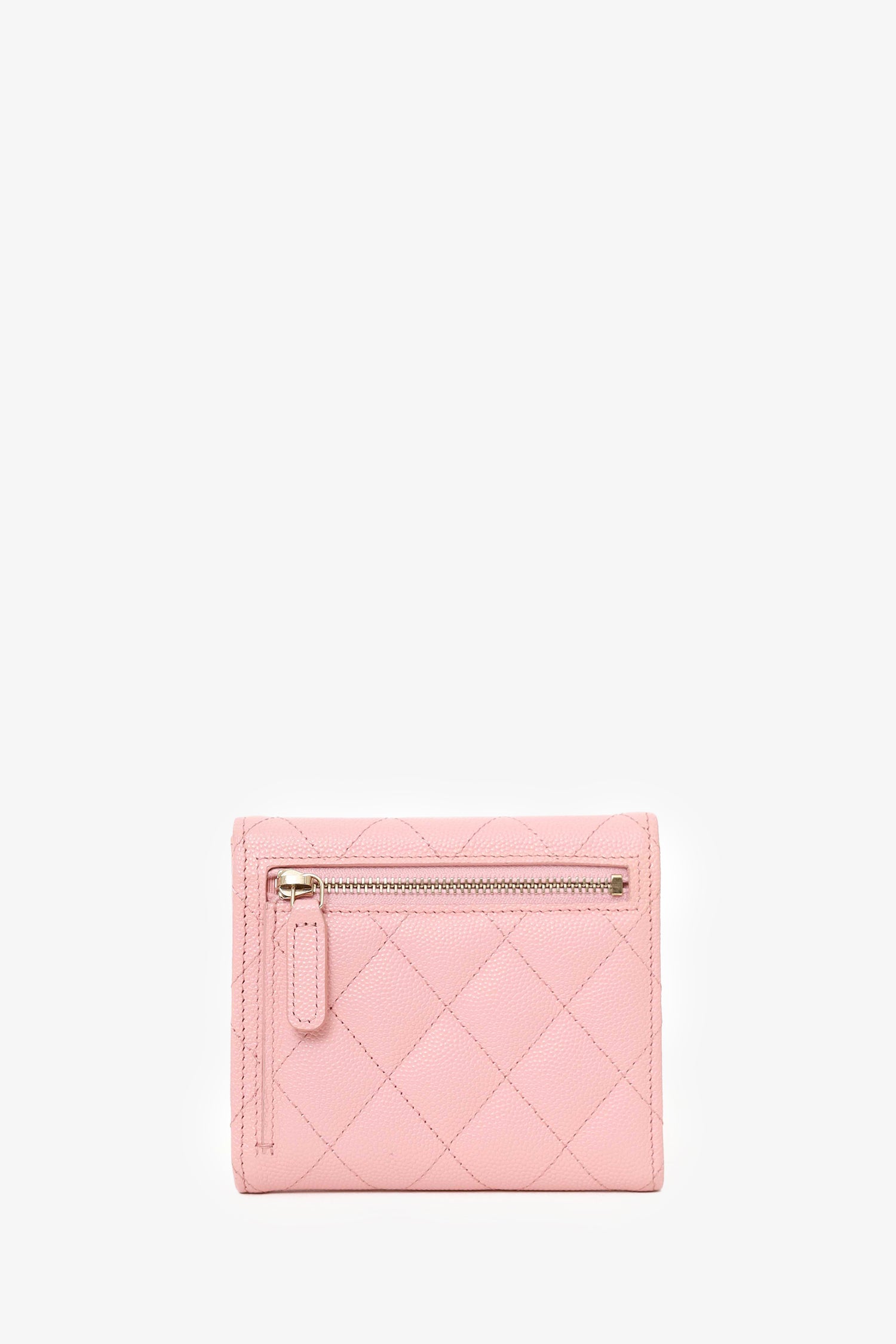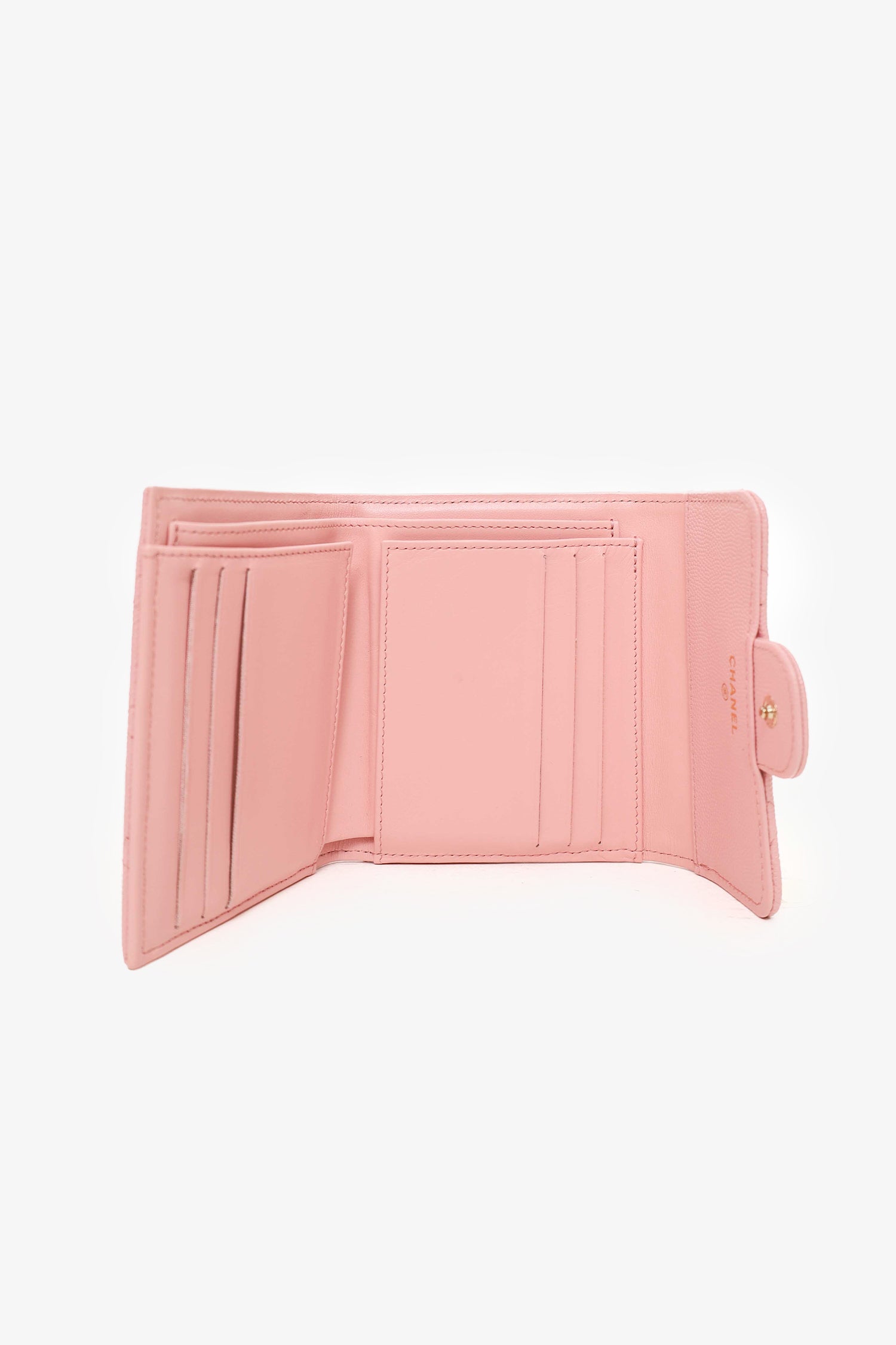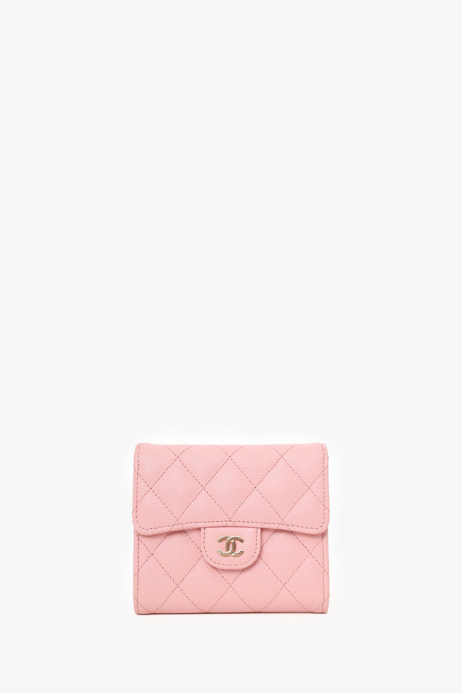 Refresh availabilityPre-Loved Chanel™ 2021 Pink Caviar Leather Quilted CC Compact Flap Wallet. Front fold-over flap with snap-button closure. Rear exterior zip closure. 6 interior card slots and 1 bill slot. Gold-tone hardware. Tonal stitching.