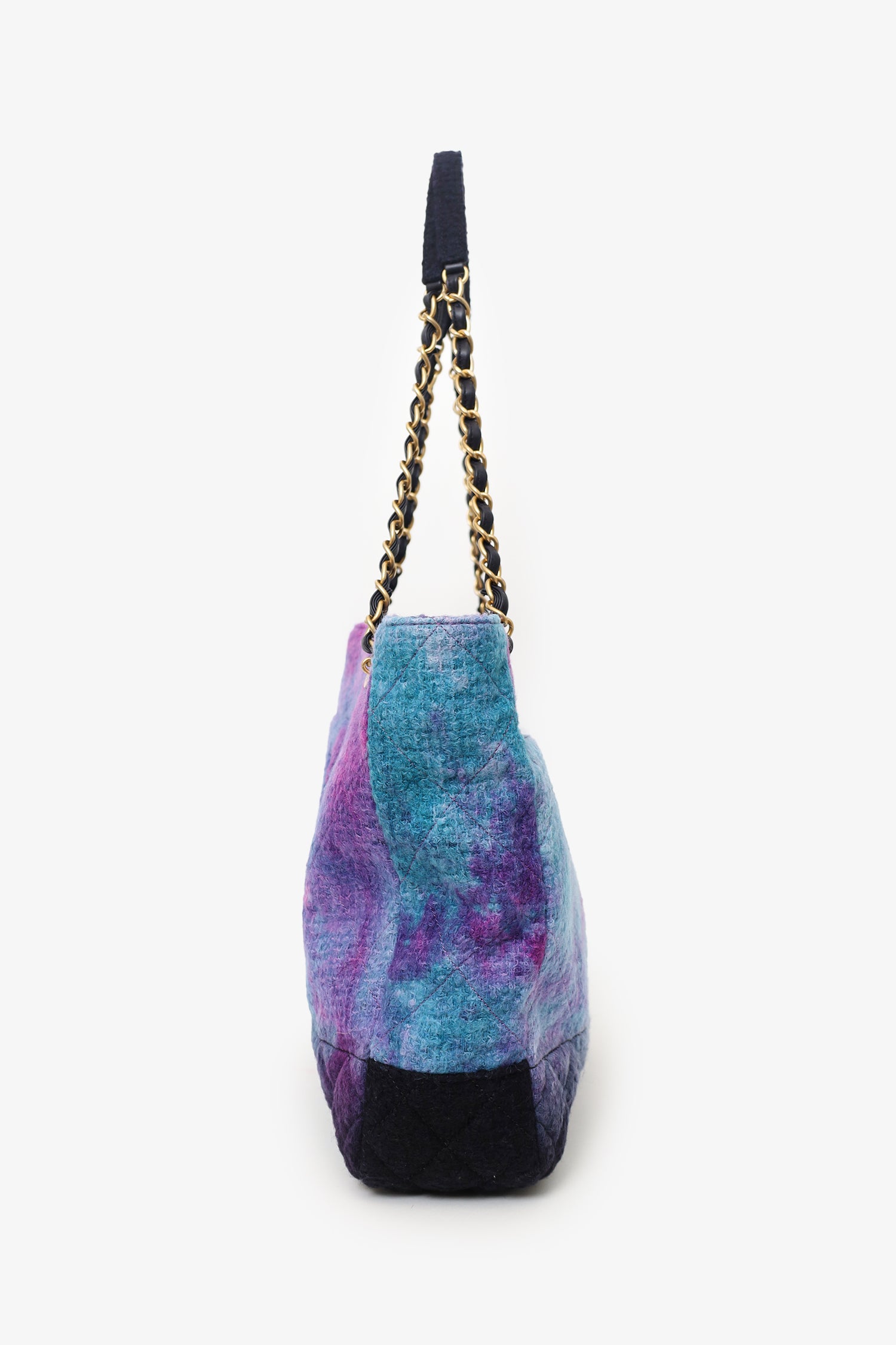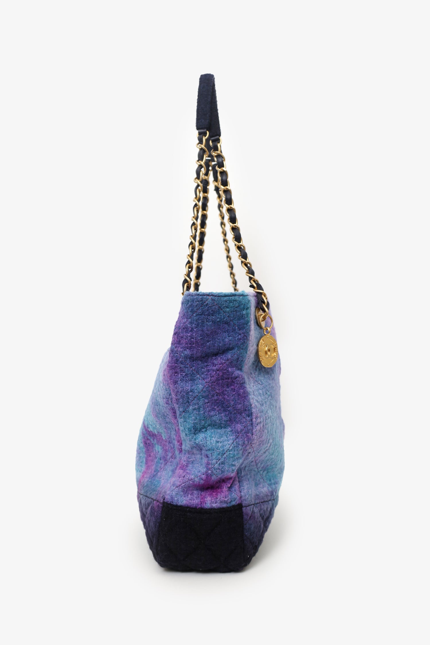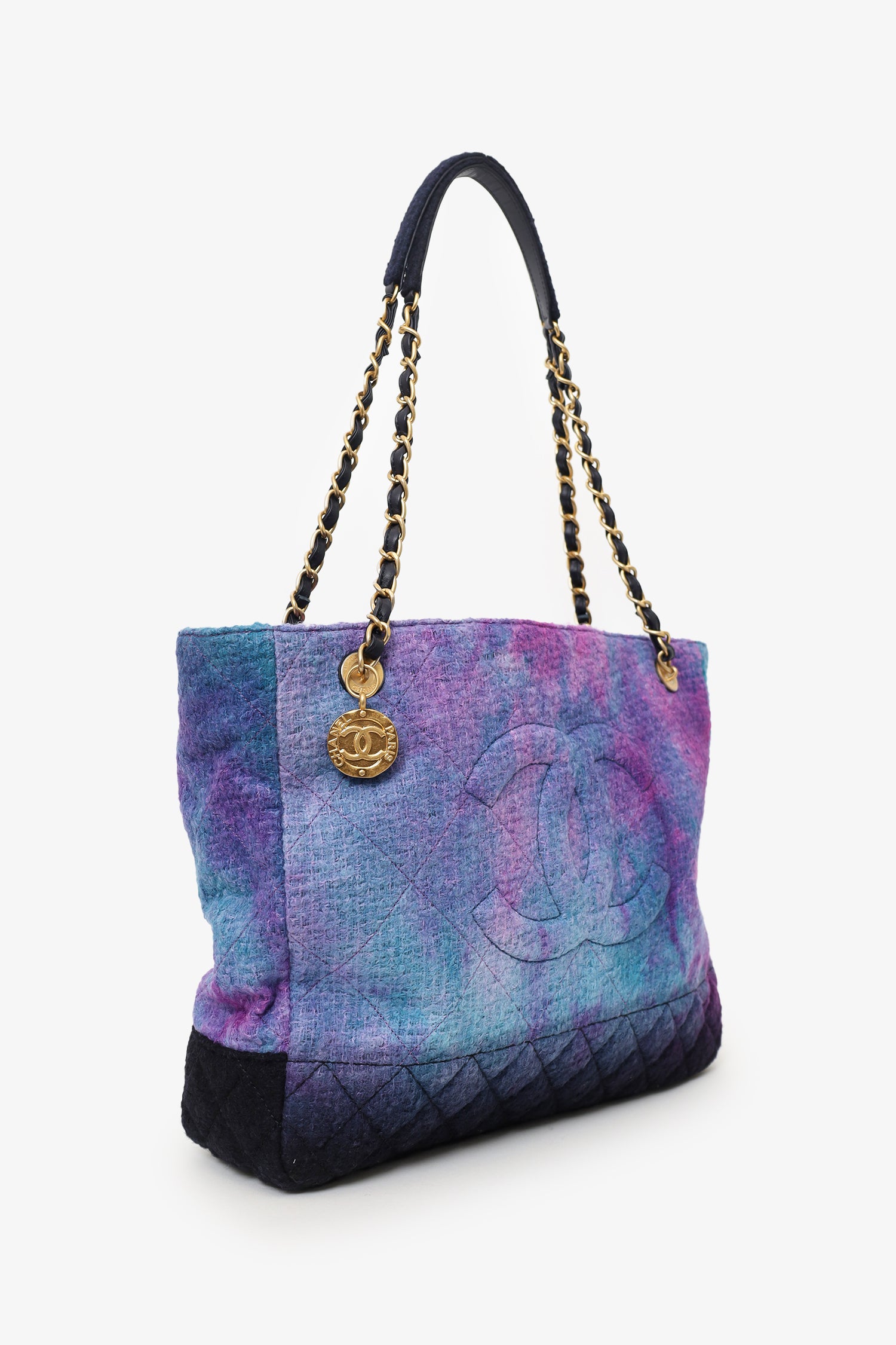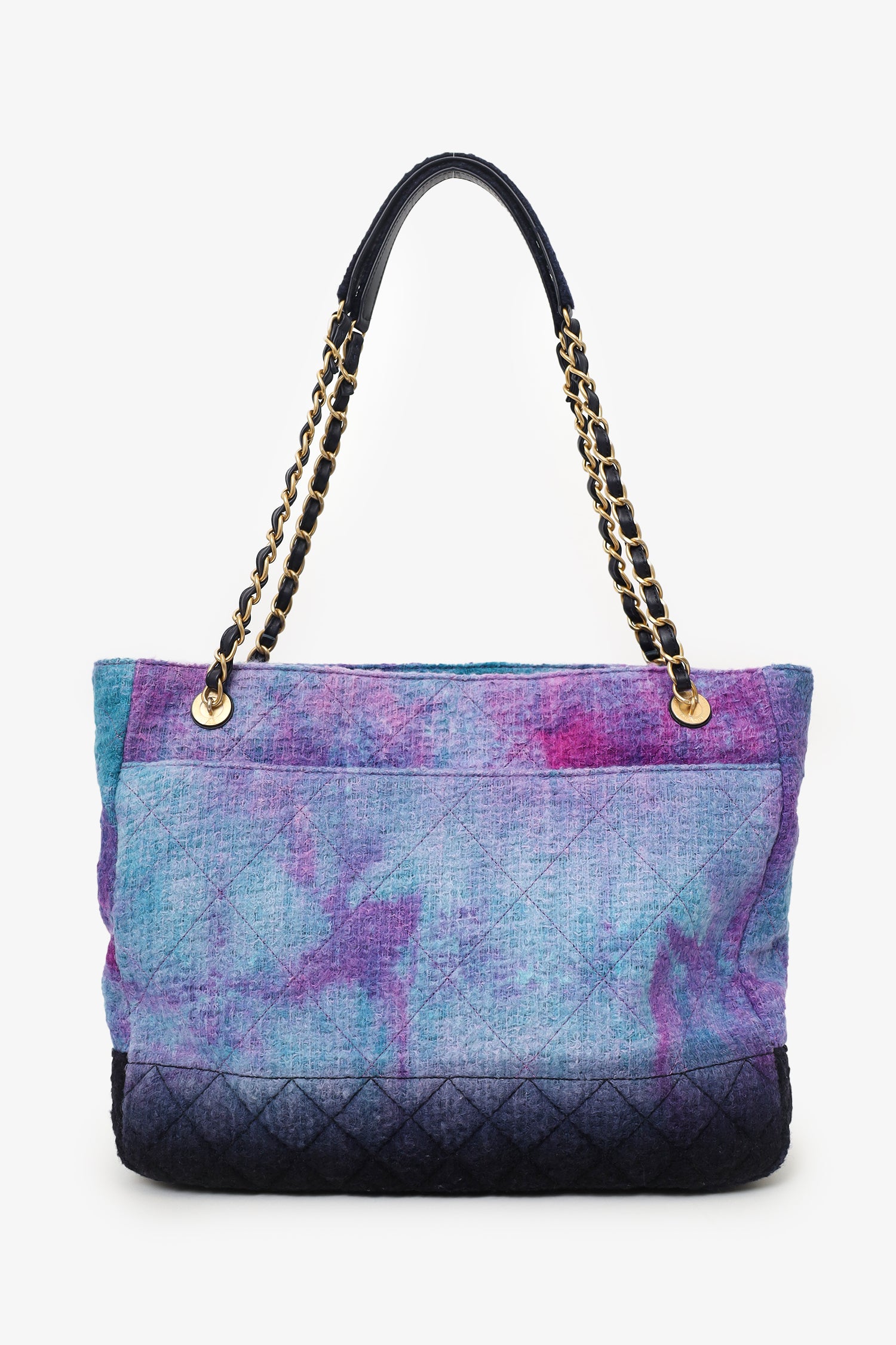 Refresh availabilityPre-Loved Chanel™ 2021 Purple Tie Dye Wool Tweed Shopping Tote. Top interior snap-button closure. Chainlink shoulder straps. Lined interior. Single interior zip pocket. Gold-tone hardware. Tonal stitching.