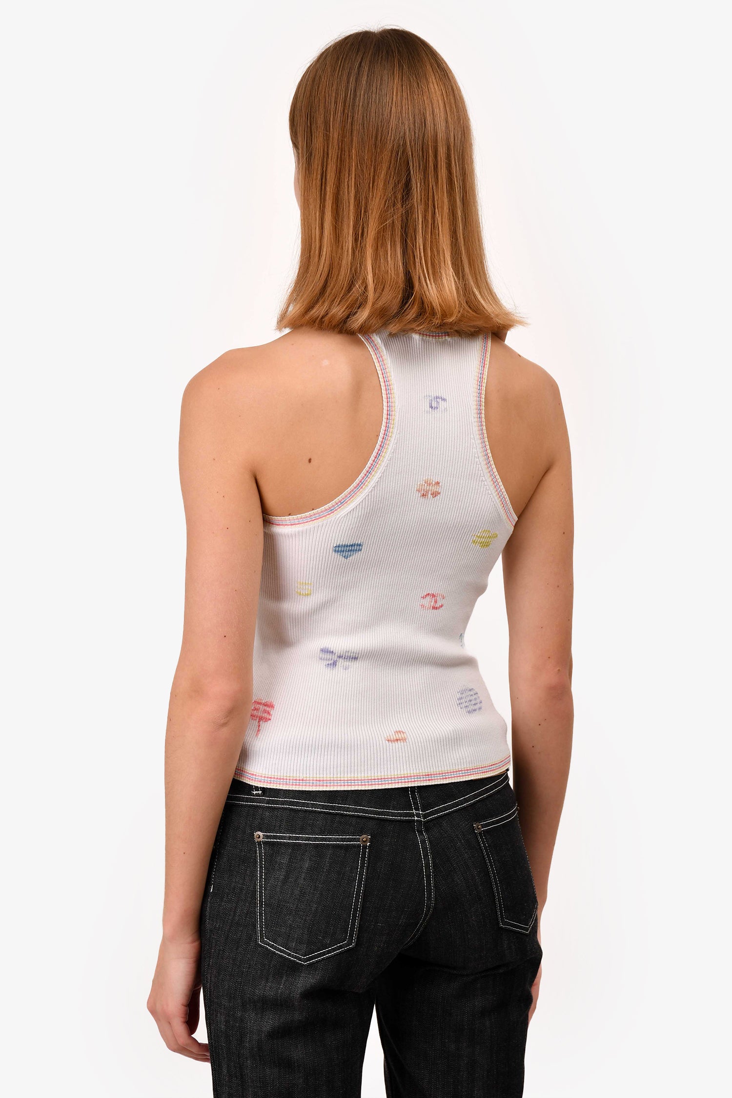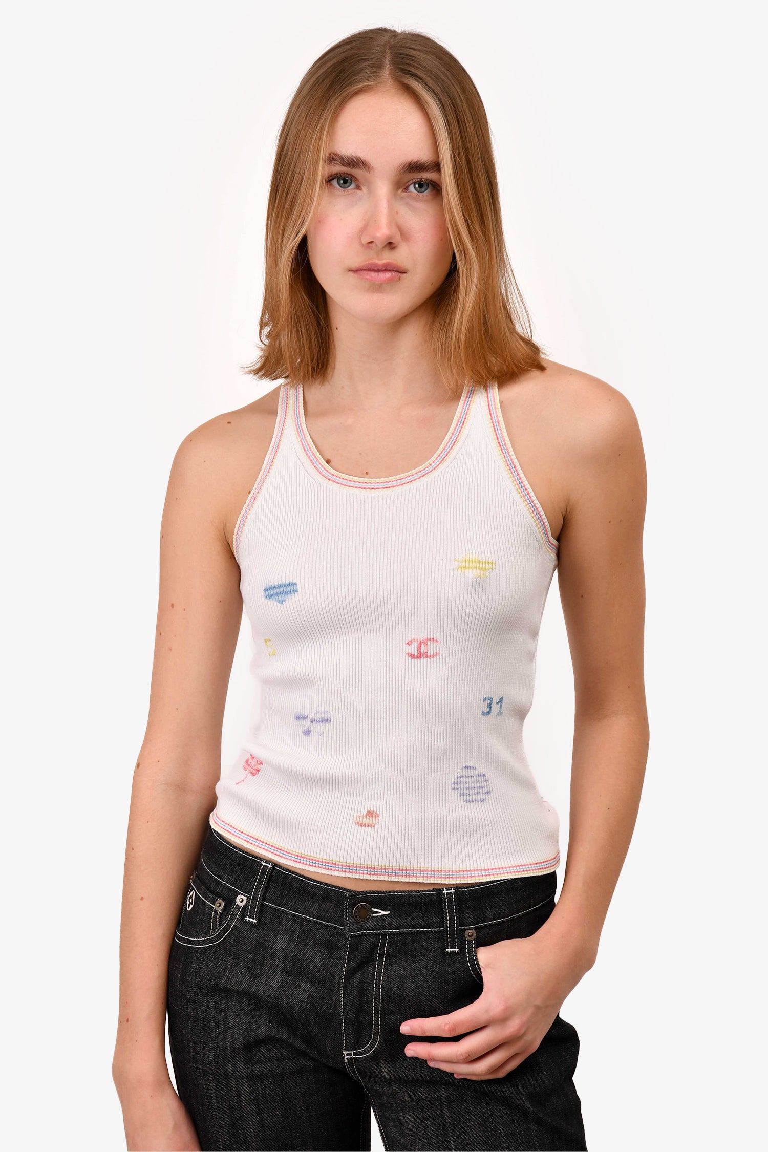 Refresh availabilityPre-Loved Chanel™ 2021 White Graphic Printed Ribbed Tank Top. Multicoloured ribbed trimming and graphic symbols. Tonal stitching.