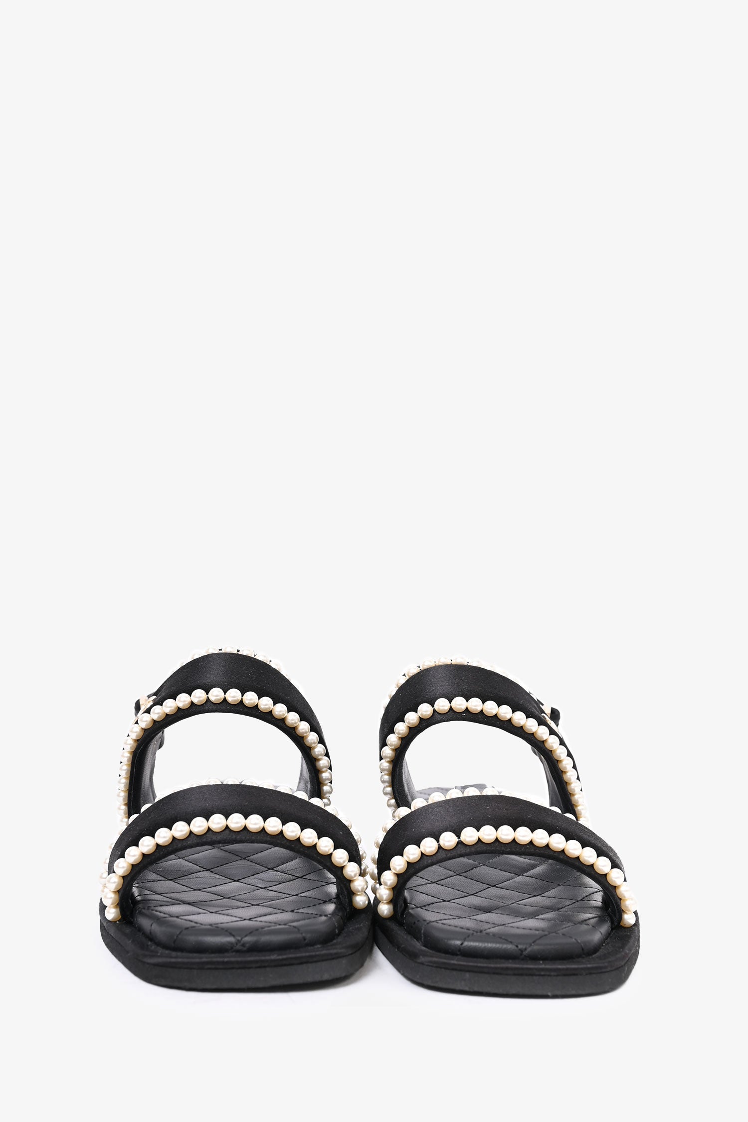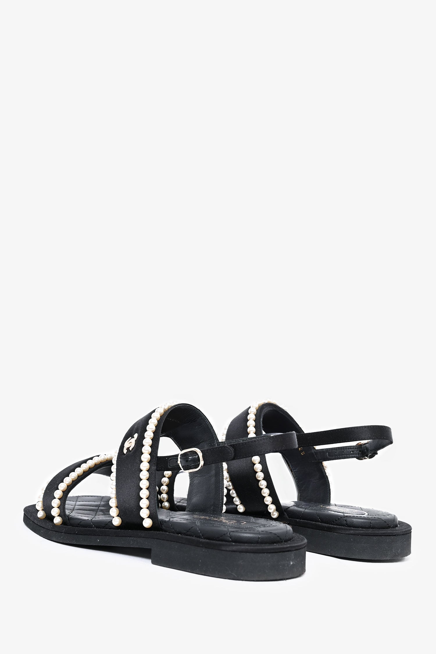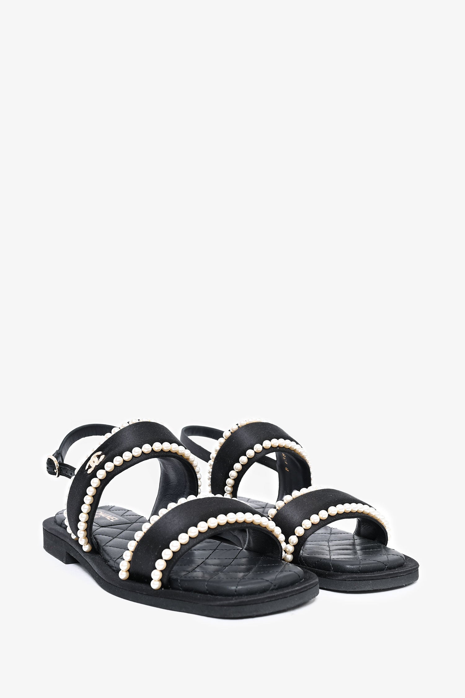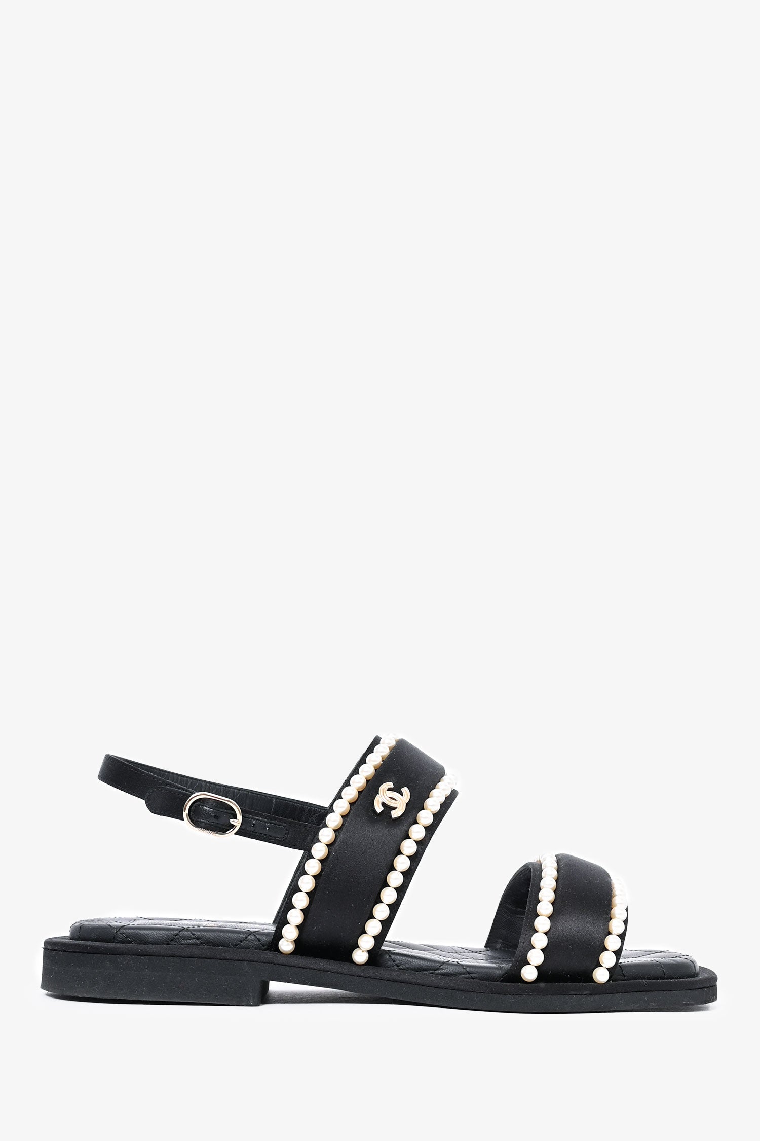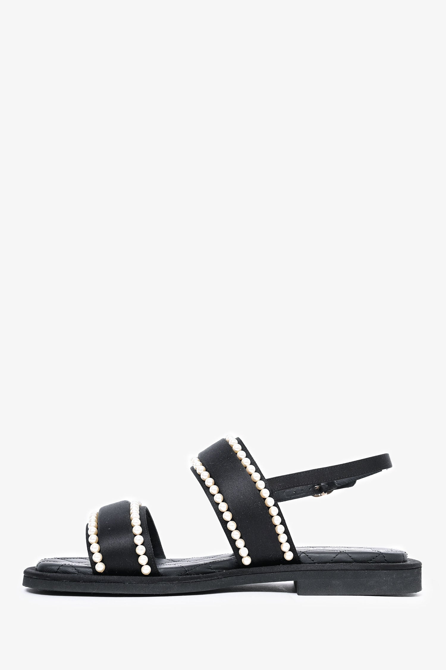 Refresh availabilityPre-Loved Chanel™ 2022 Cruise Black Satin Pearl Quilted Flat Sandals. Slip-on. Square toe. Open back. Strap with buckle closure. Gold-tone hardware.