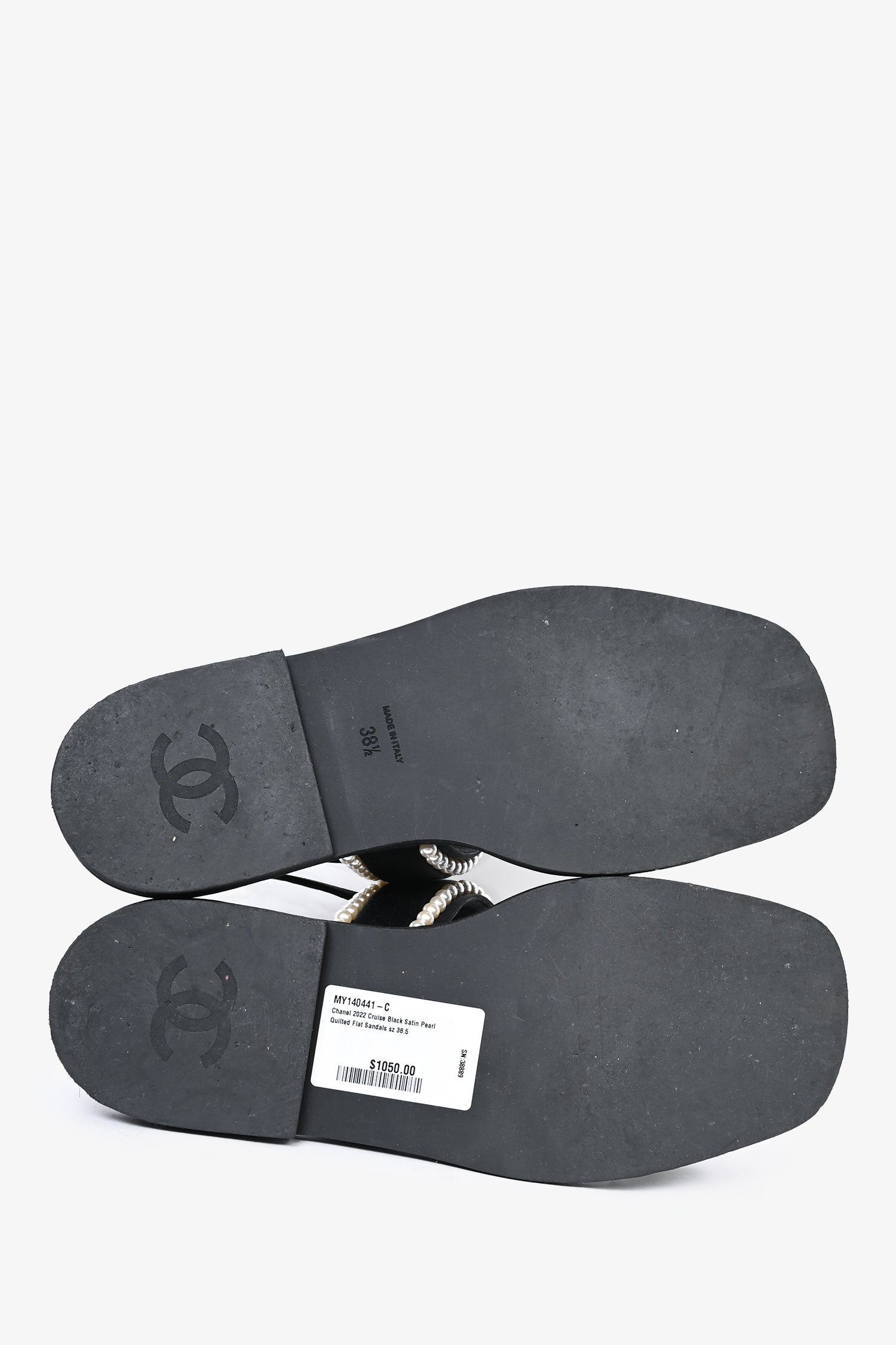 Pre-Loved Chanel™ 2022 Cruise Black Satin Pearl Quilted Flat Sandals Size 38.5