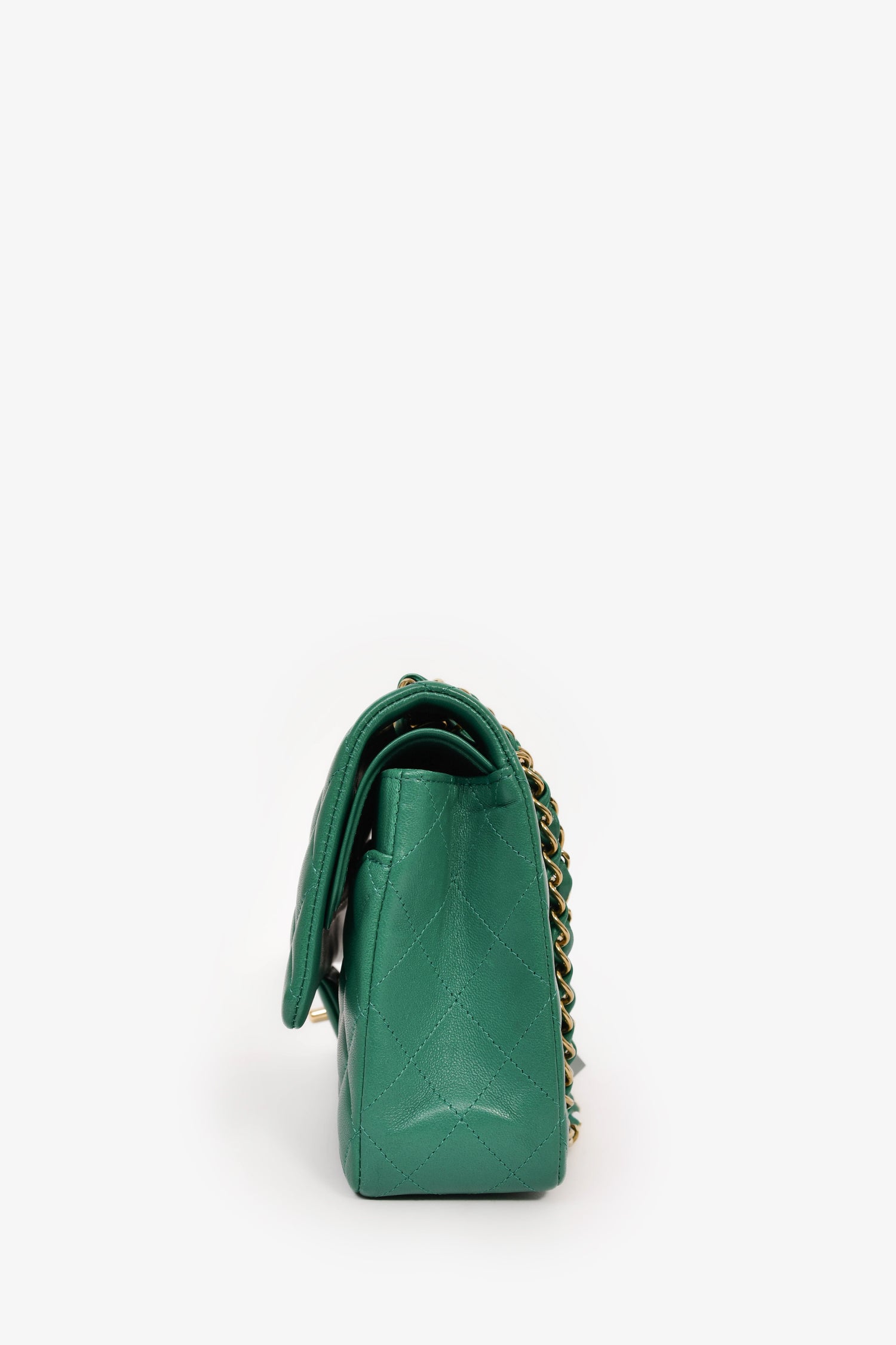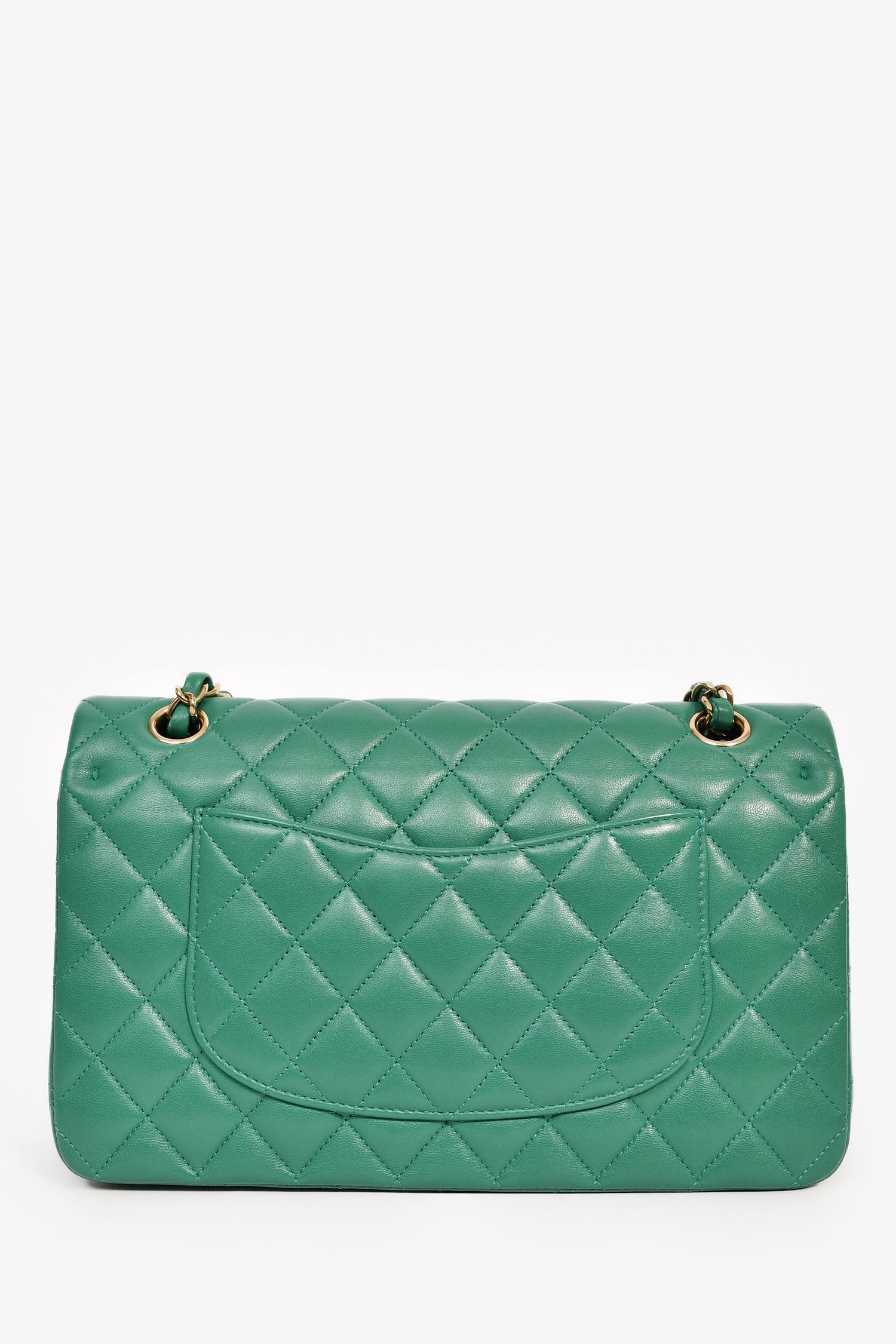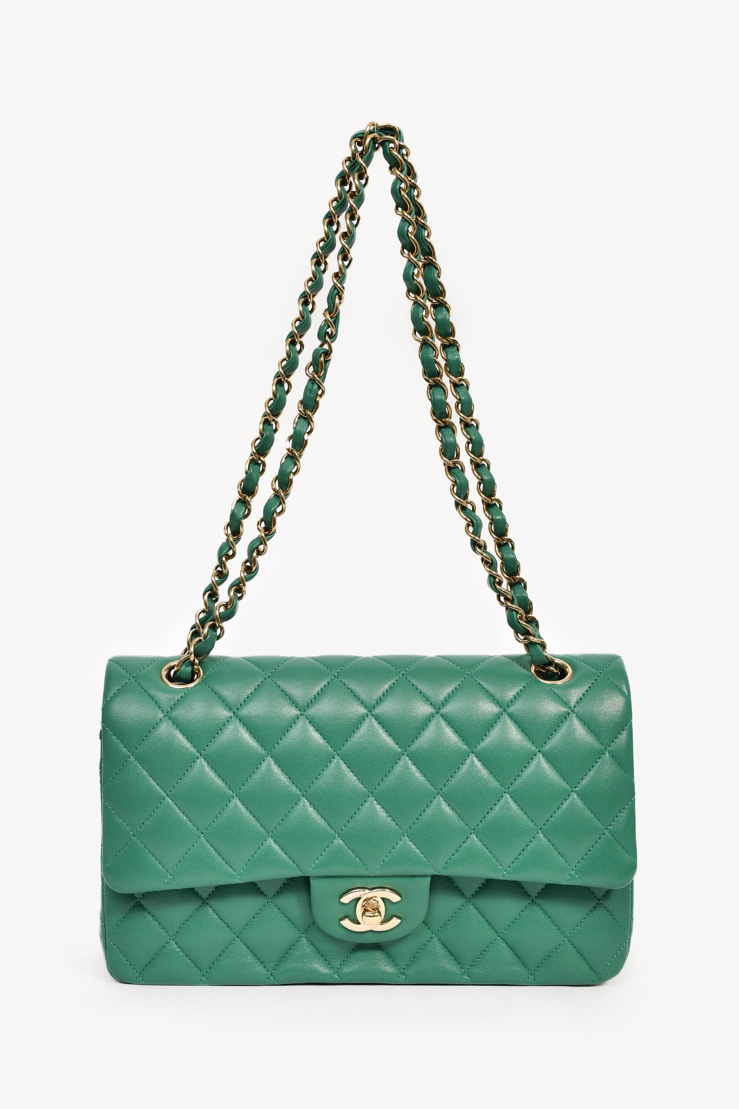 Refresh availabilityPre-Loved Chanel™ 2022 Dark Green Lambskin Medium Classic Double Flap Shoulder Bag. Front fold-over flap with a turn-lock closure. Chain-link and leather shoulder strap. Interior fold-over flap with 2 compartments and 2 pockets. Gold-tone hardware. Tonal stitching.