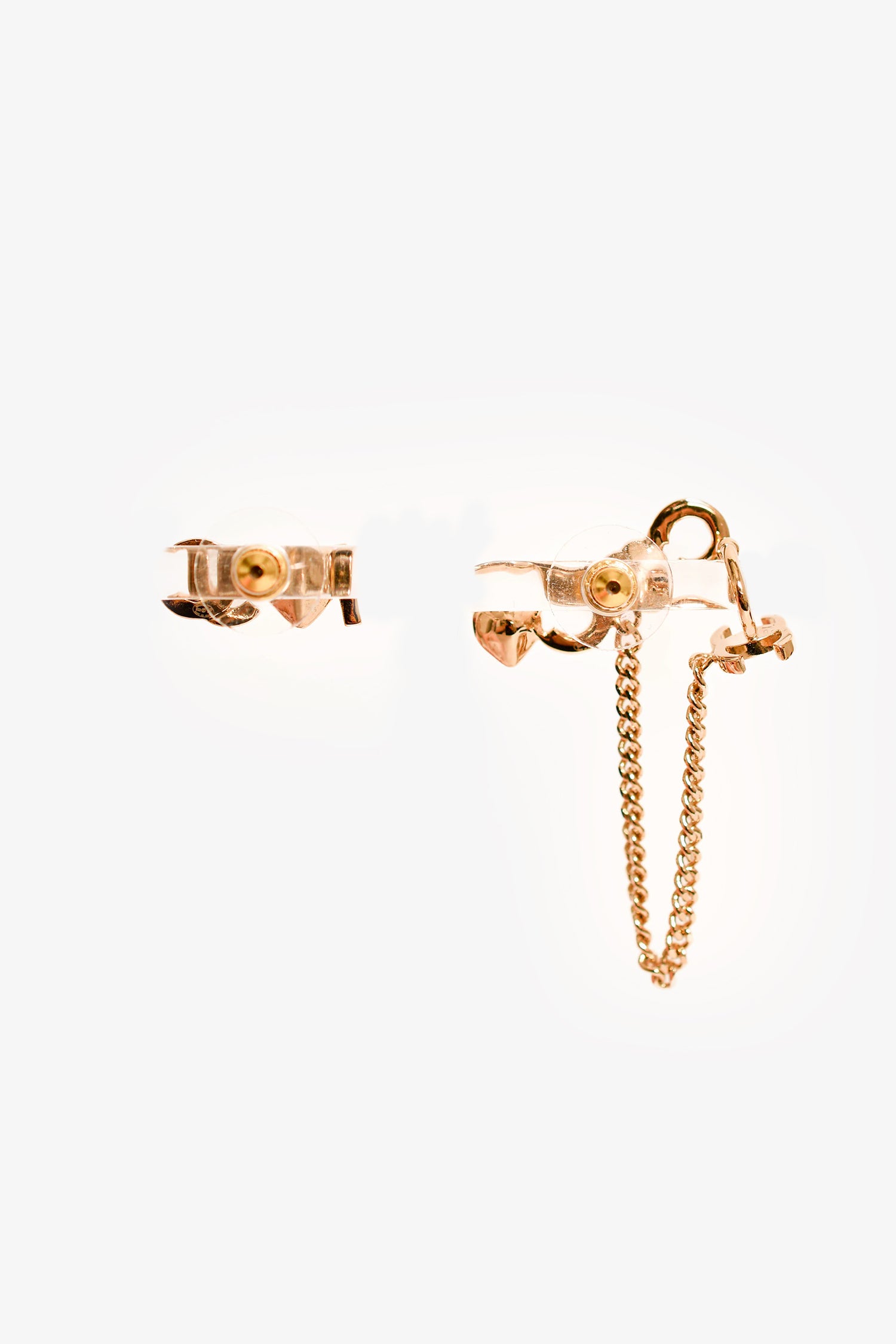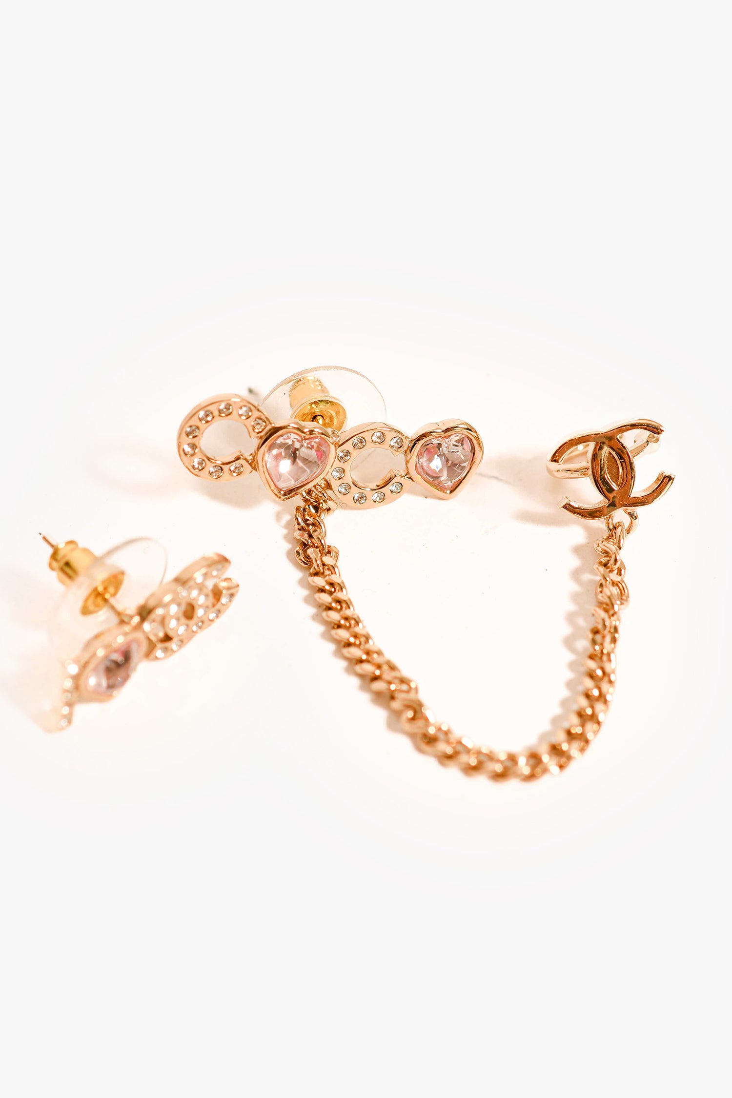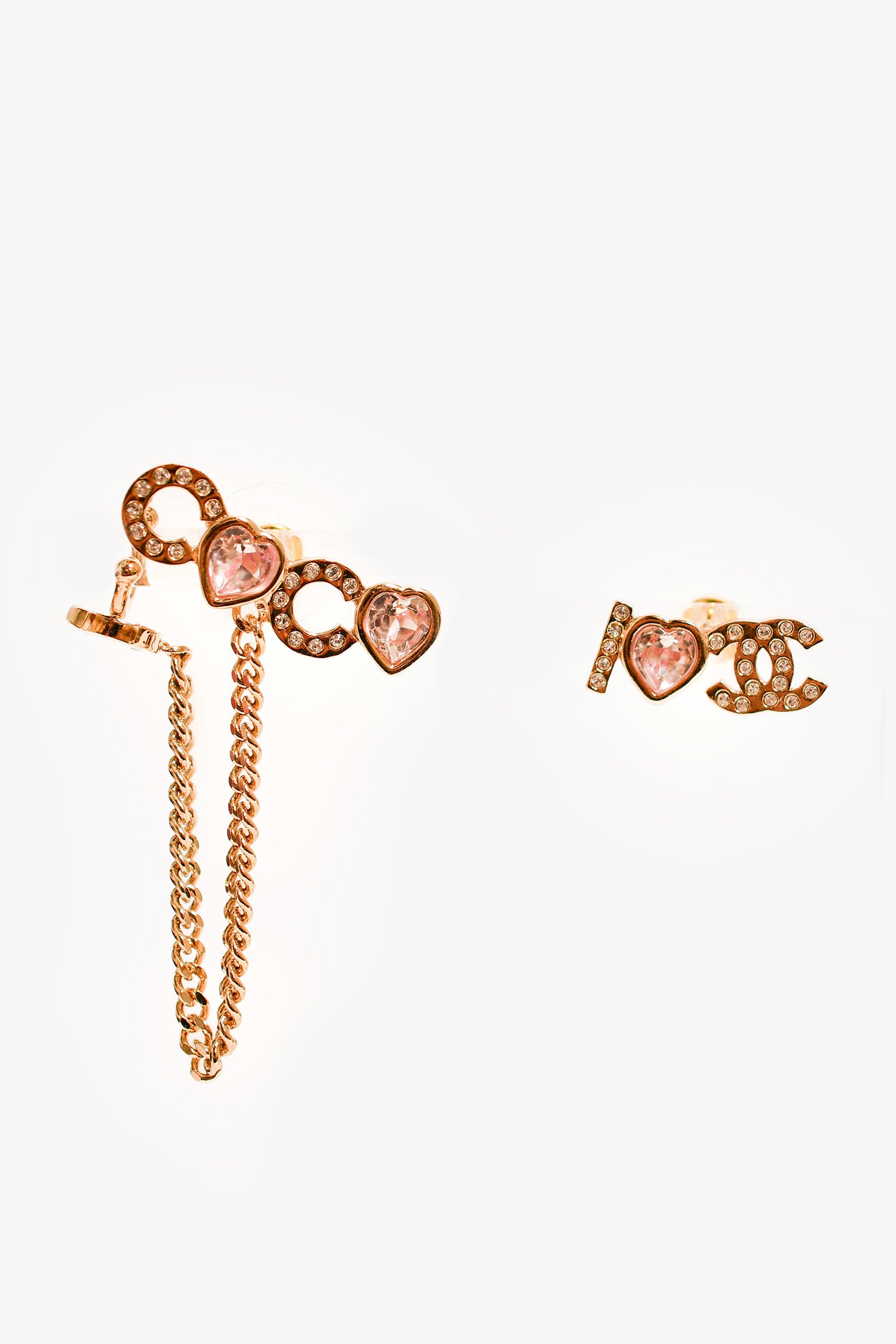 Refresh availabilityPre-Loved Chanel™ 2022 Gold Toned 'I Heart Coco' Pink Crystal Embellished Stud Earrings with Ear Cuff. Post-stud closure.
