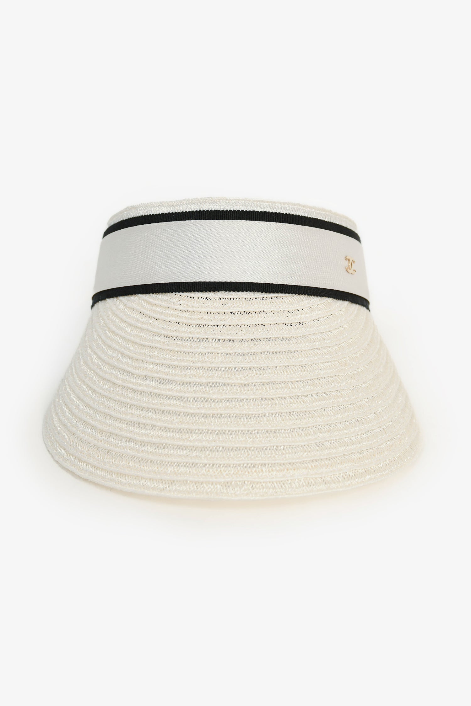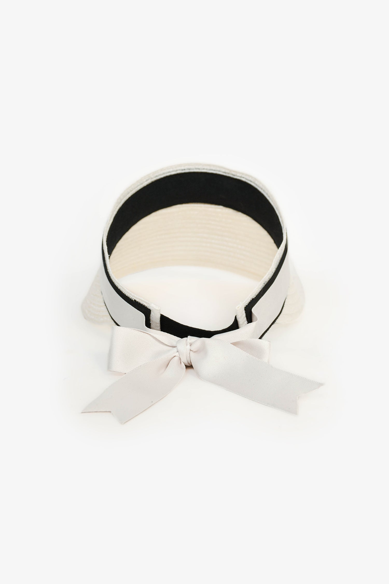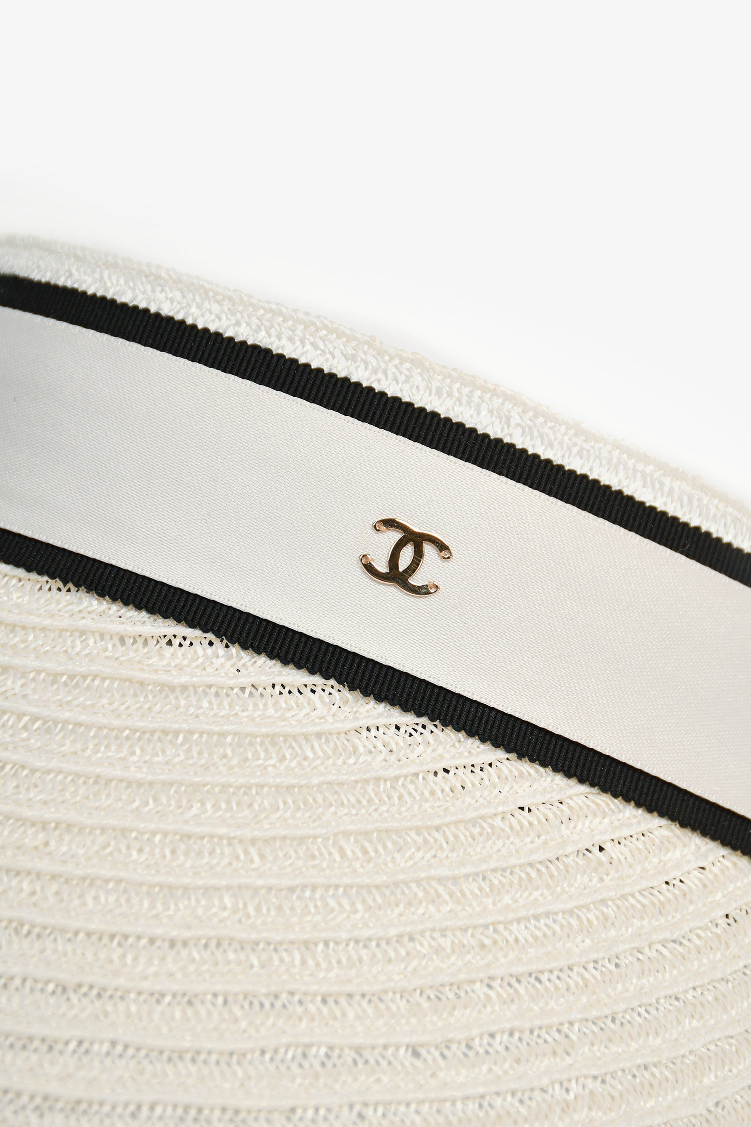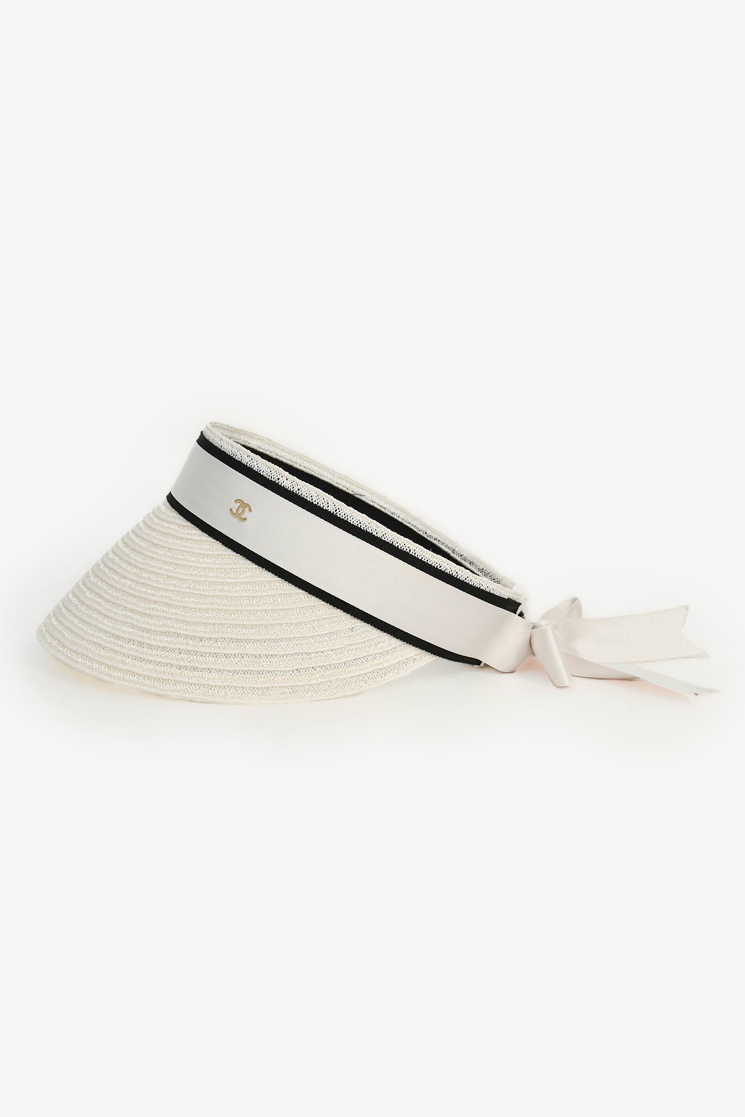 Refresh availabilityPre-Loved Chanel™ 2022 White Raffia CC Visor Hat. Rear elasticized band and ribbon lace-up closure. Tonal stitching.