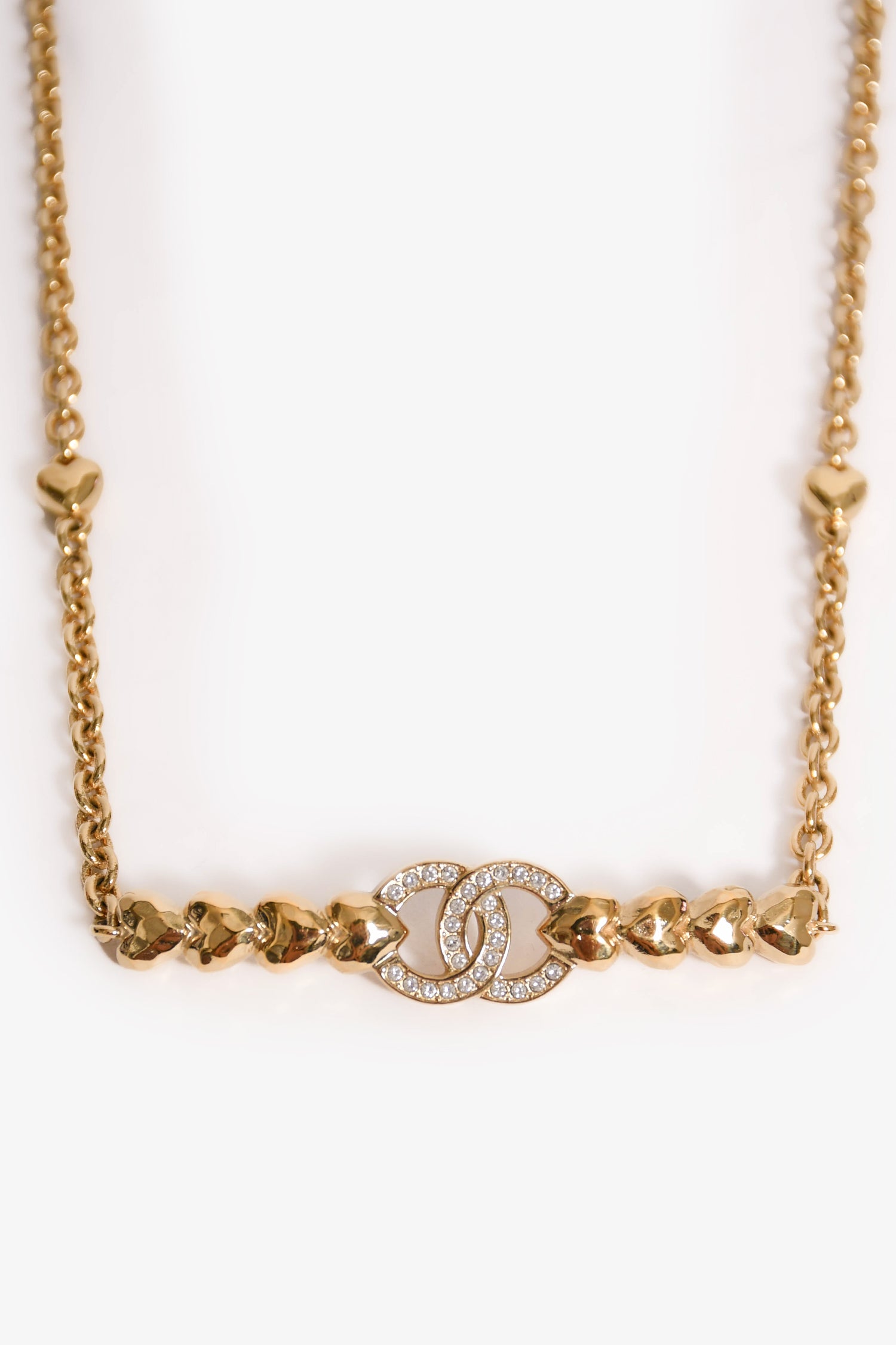Refresh availabilityPre-Loved Chanel™ 2023 Gold Tone Crystal CC Heart Long Chain Belt. Lobster clasp closure.