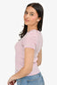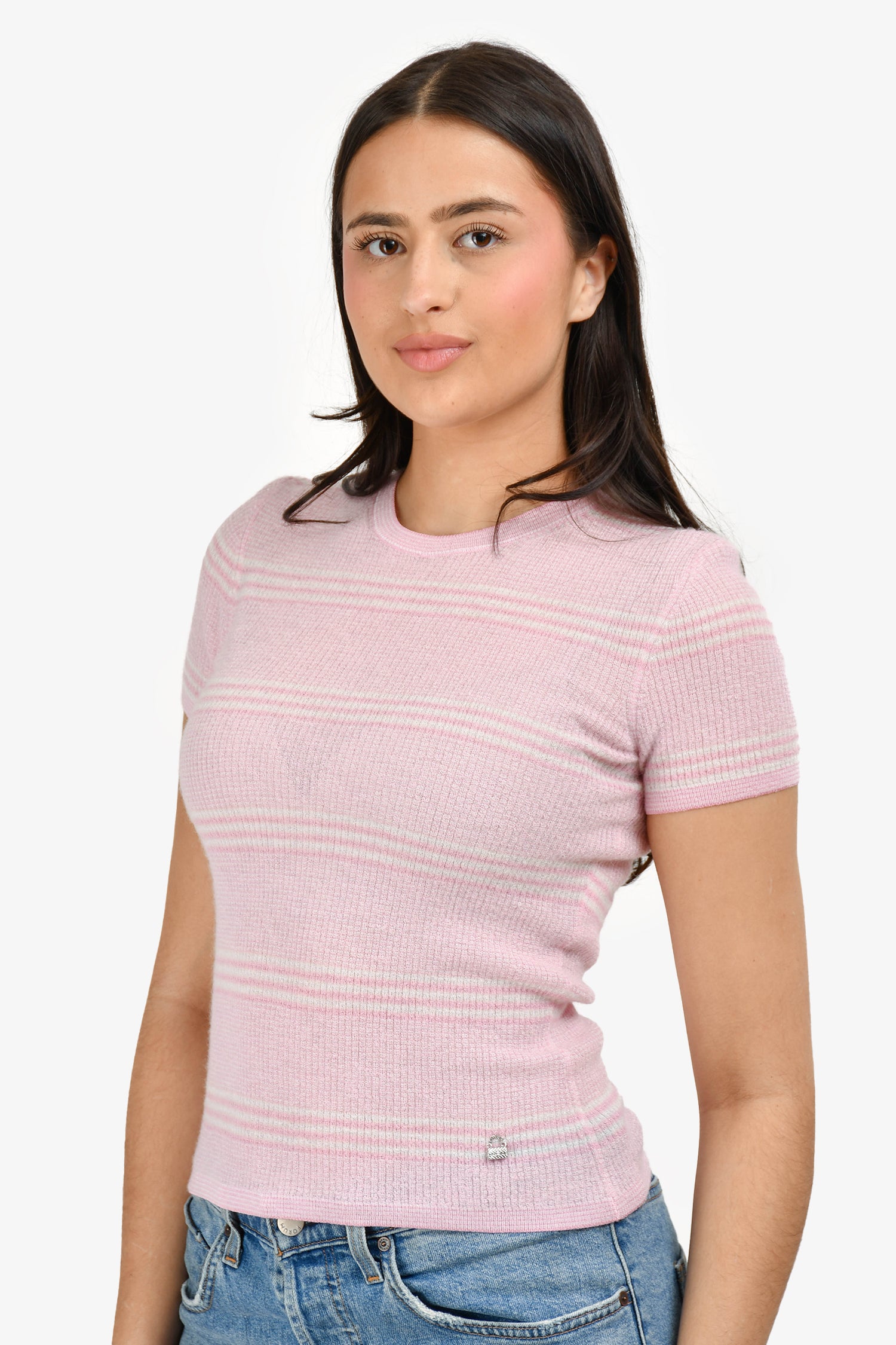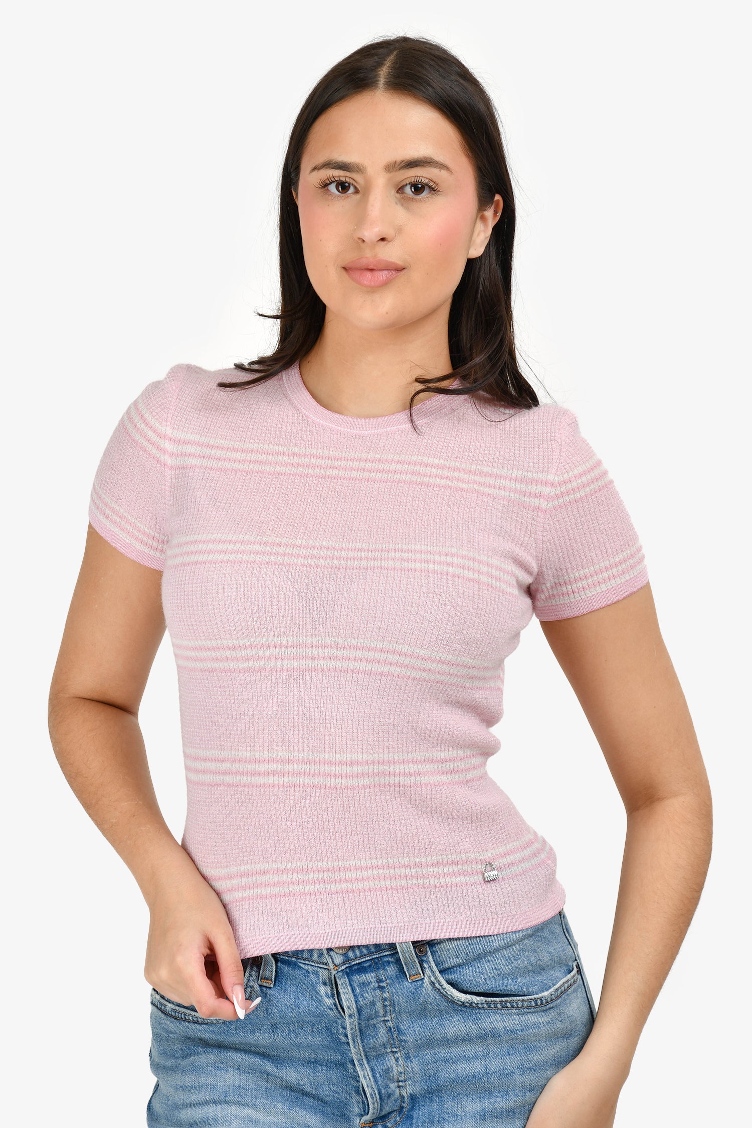 Pre-Loved Chanel™ 2024 Pink/White Striped Knit Crewneck Top with Silver Purse Charm Size 34