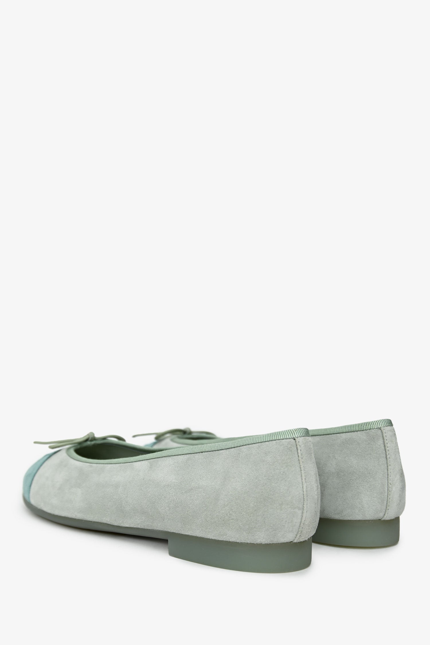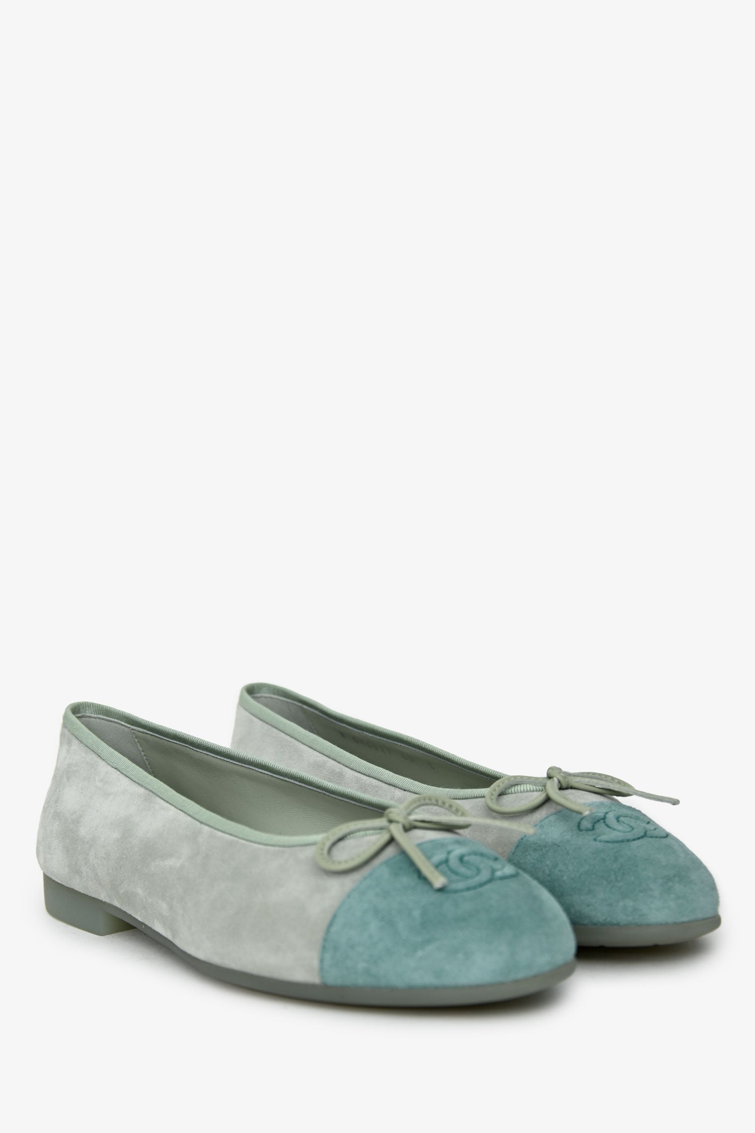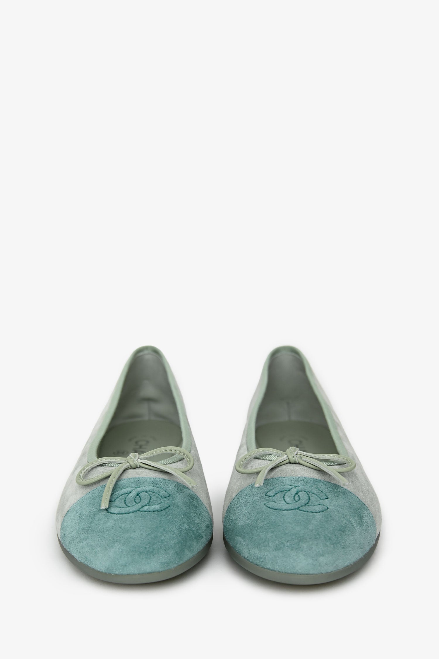 Refresh availabilityPre-Loved Chanel™ 2025 Light Green Suede CC Cap Toe Ballet Flats. Slip-on. Round toe. Leather insoles. Rubber soles. Tonal stitching.
