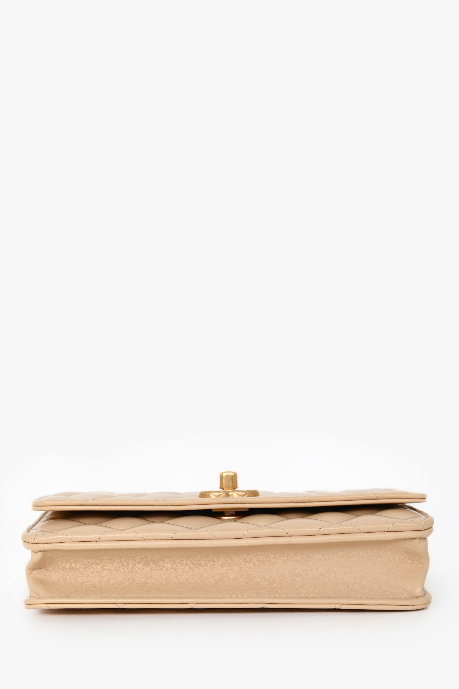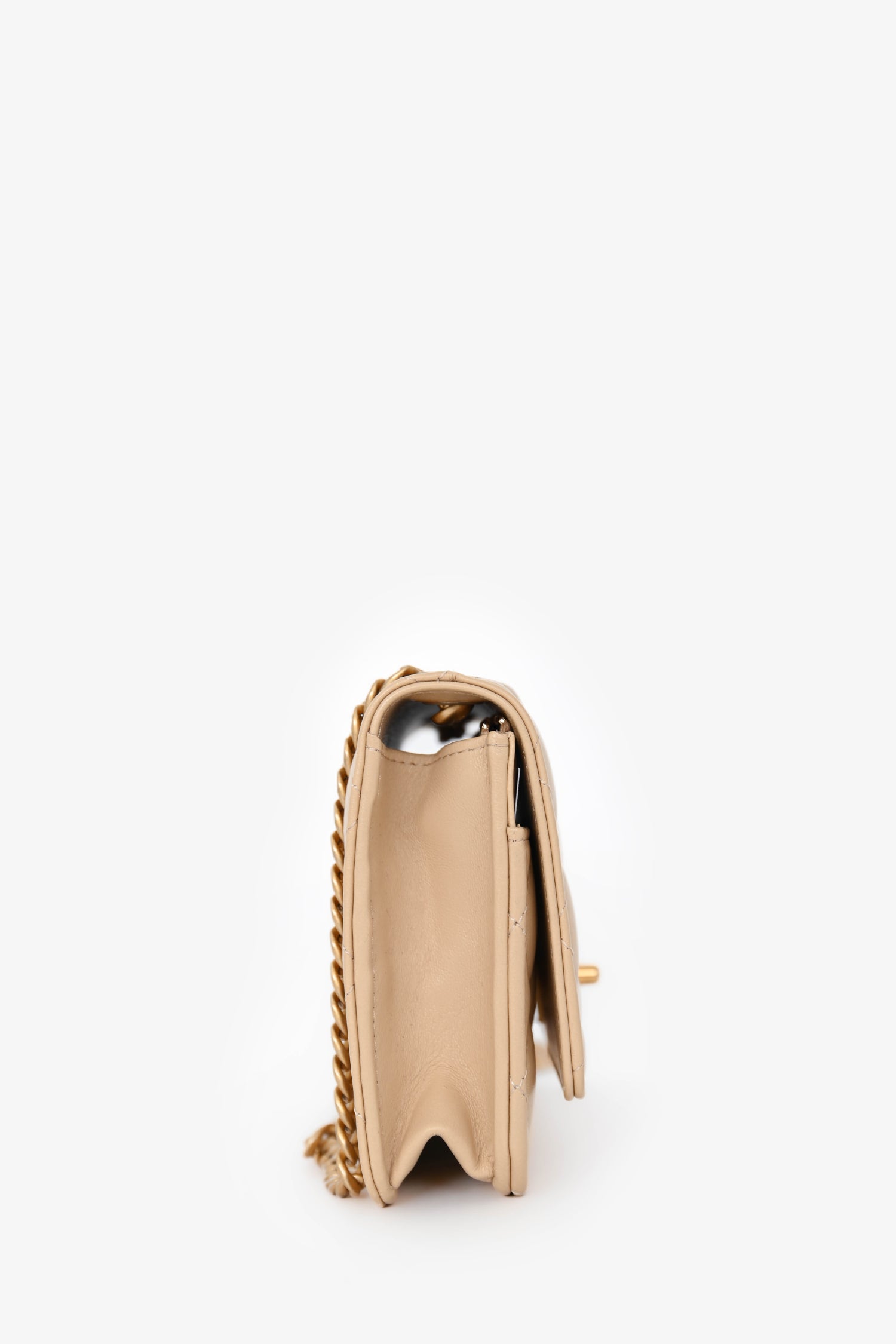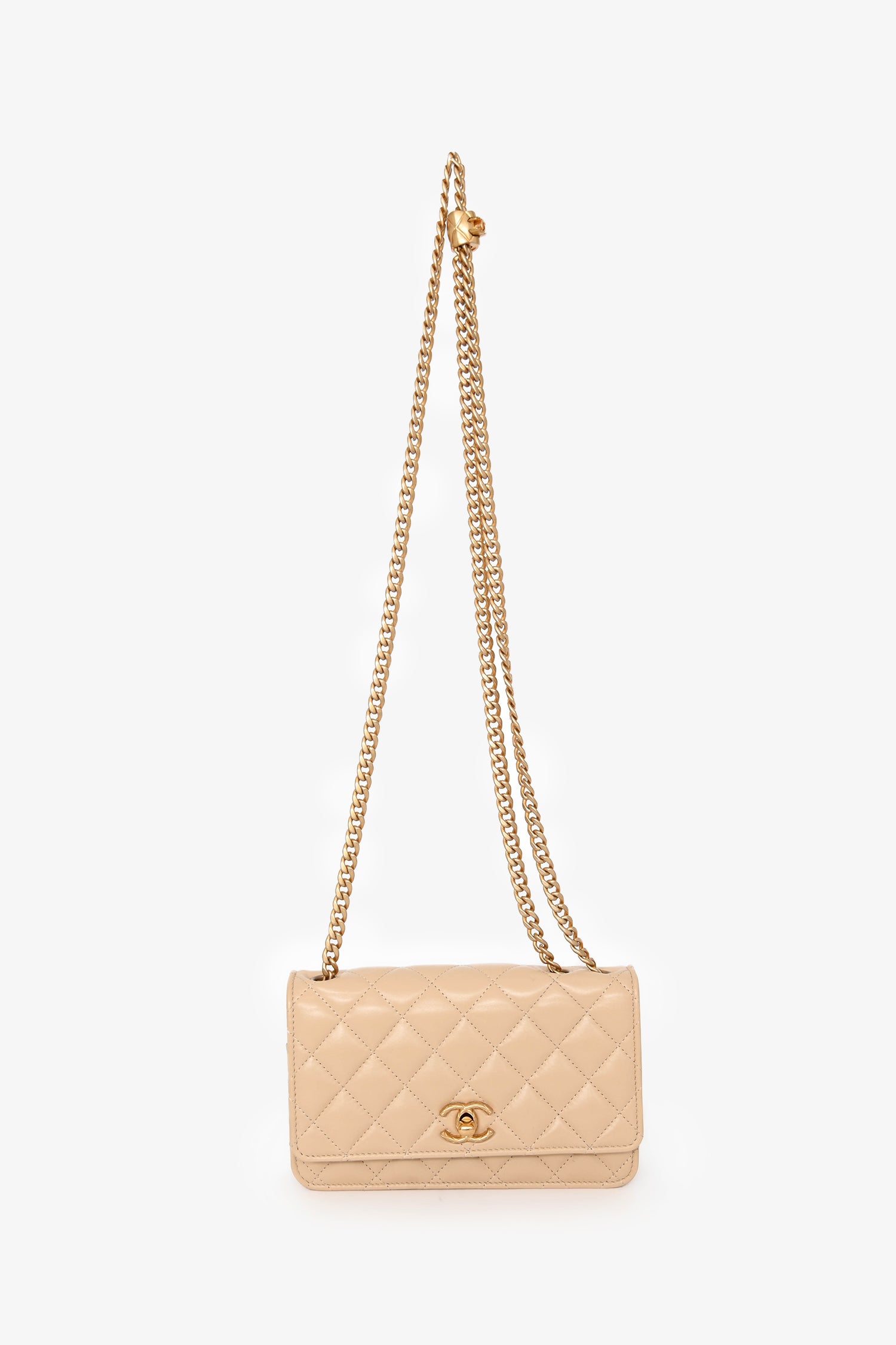 Pre-Loved Chanel™ Beige Lambskin Leather 'All Slide' Wallet on Chain. Front fold-over flap with turn-lock closure. Single chain link crossbody strap. Front and rear exterior slip pocket. Leather-lined interior. Single interior compartment with six card slots, a bill slot, and zip pocket. Gold-tone hardware. Tonal stitching.