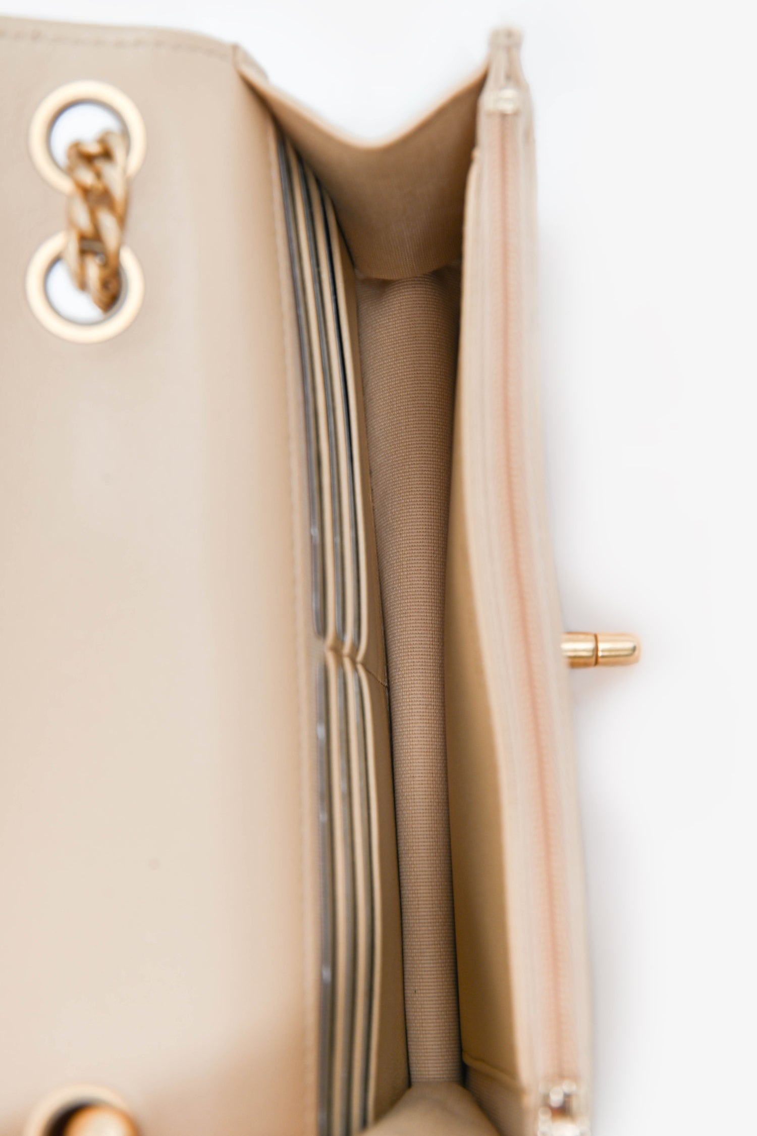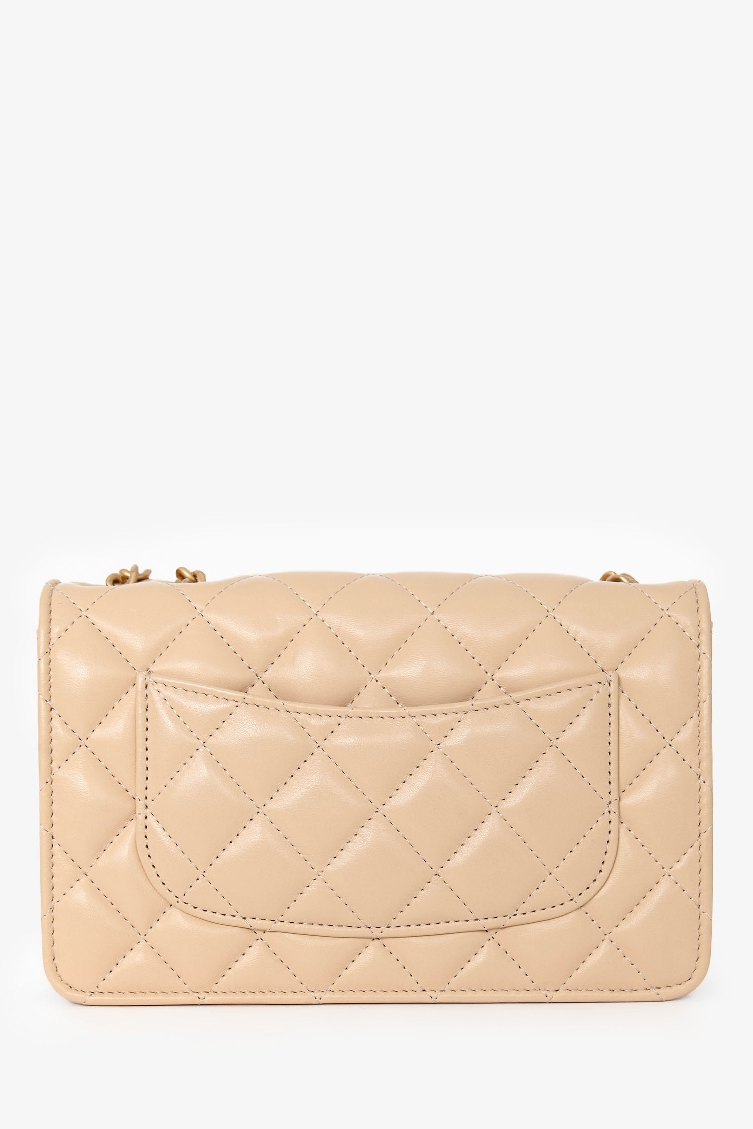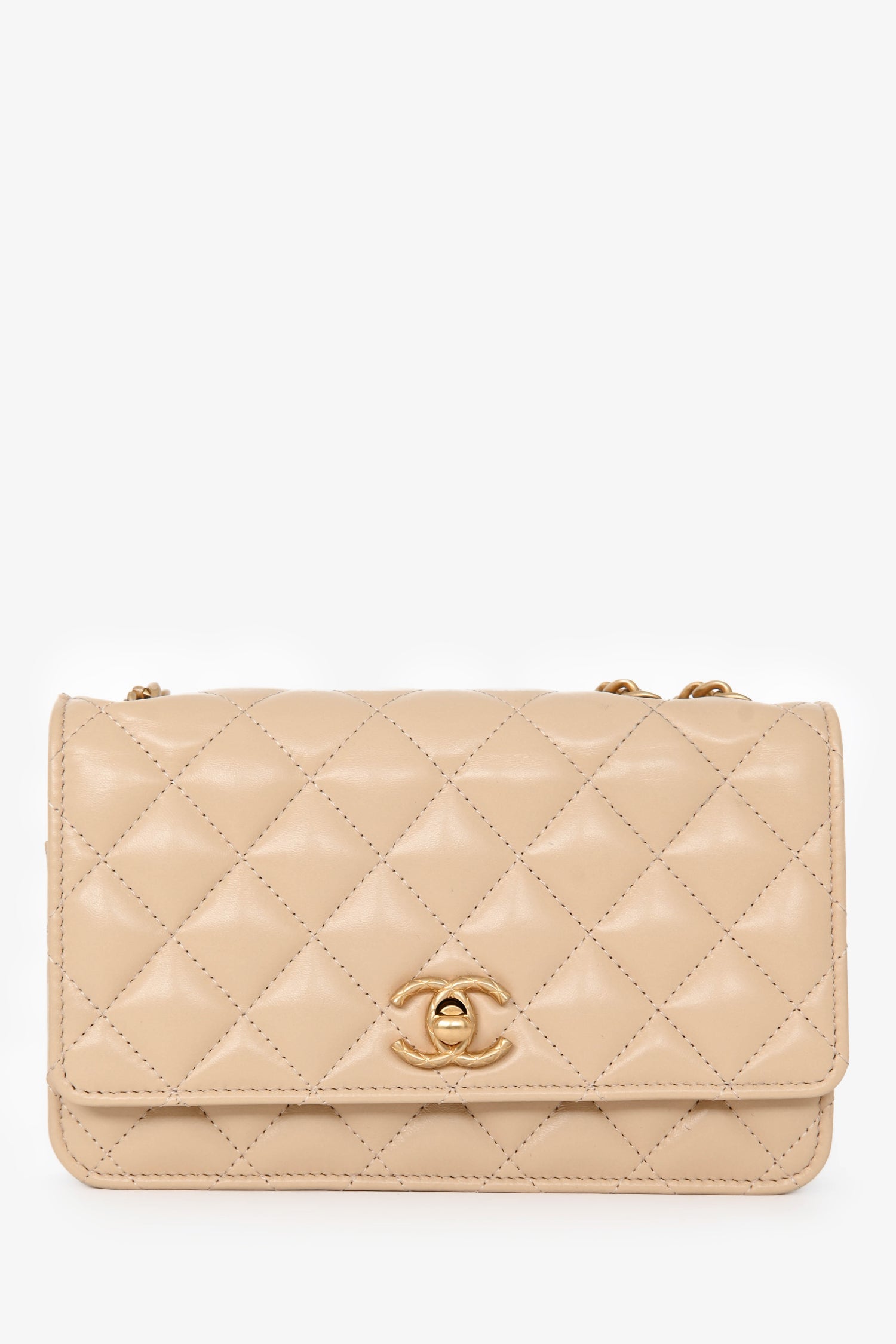 Pre-Loved Chanel™ Beige Lambskin Leather 'All Slide' Wallet on Chain. Front fold-over flap with turn-lock closure. Single chain link crossbody strap. Front and rear exterior slip pocket. Leather-lined interior. Single interior compartment with six card slots, a bill slot, and zip pocket. Gold-tone hardware. Tonal stitching.