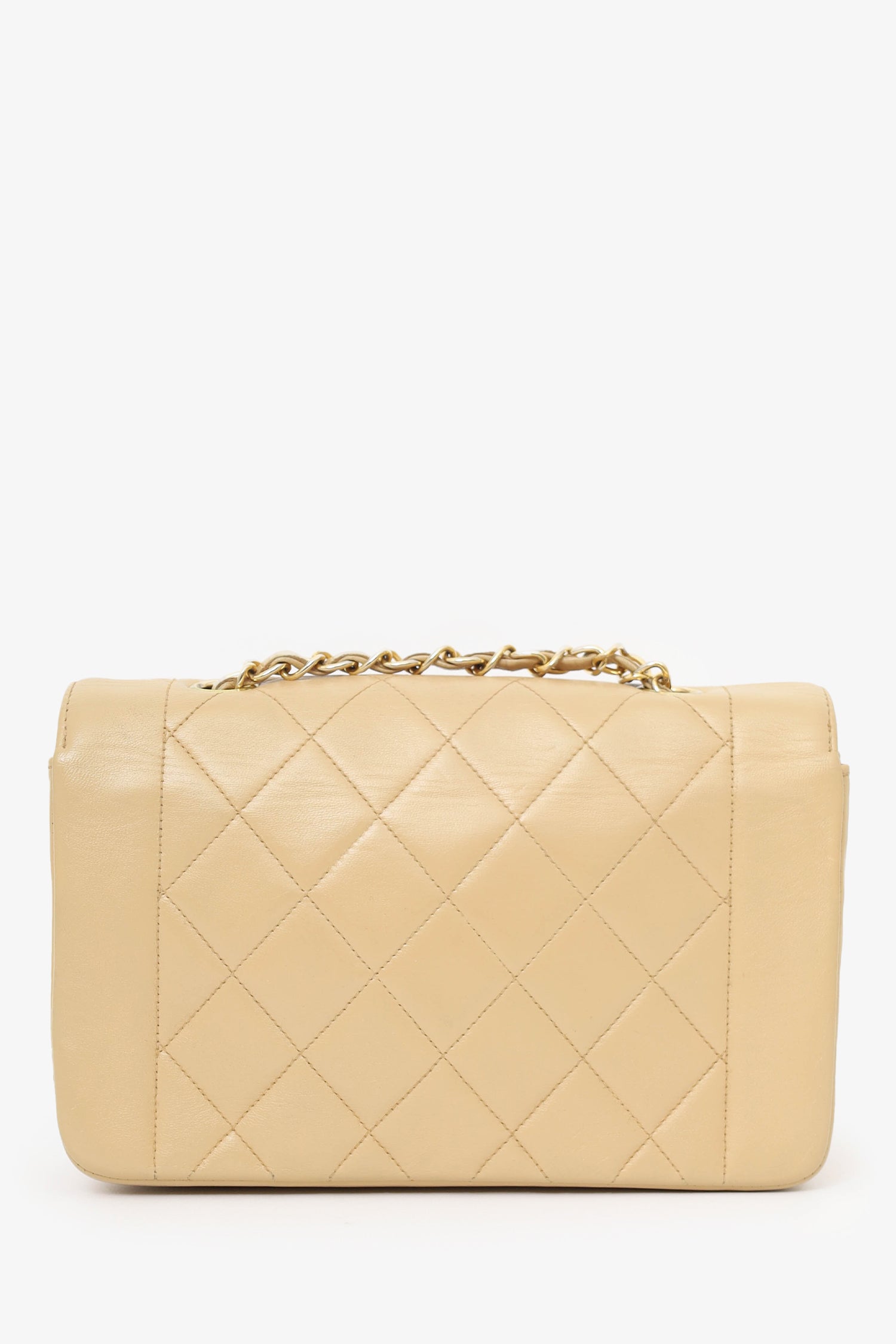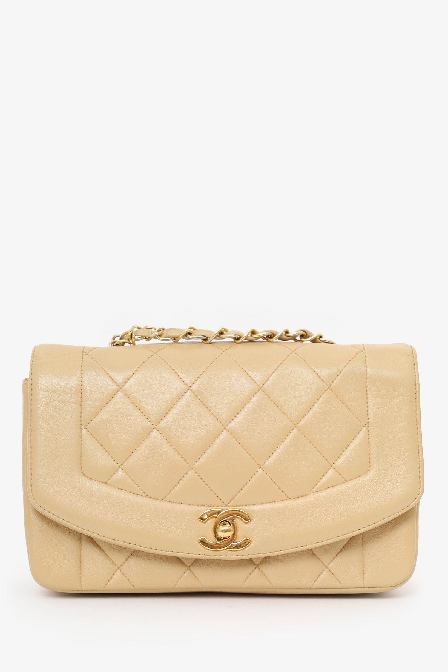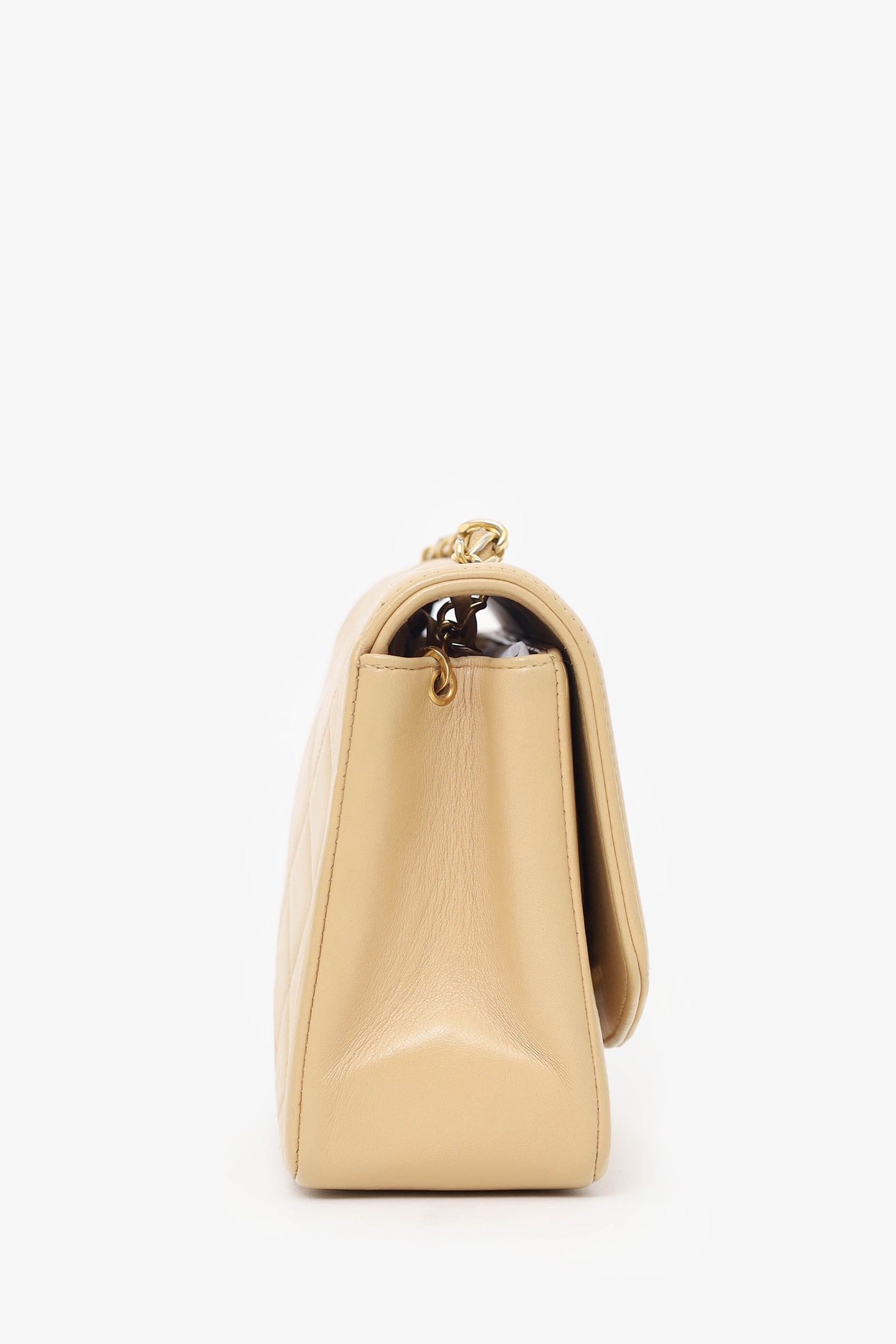 Pre-Loved Chanel™ Beige Lambskin Small Diana Flap Bag. Front fold-over flap with turn-lock closure. Single chainlink shoulder strap. Quilted exterior. Leather-lined interior. 2 Interior pockets; 1 slip and 1 zip. Gold-tone hardware. Tonal stitching.