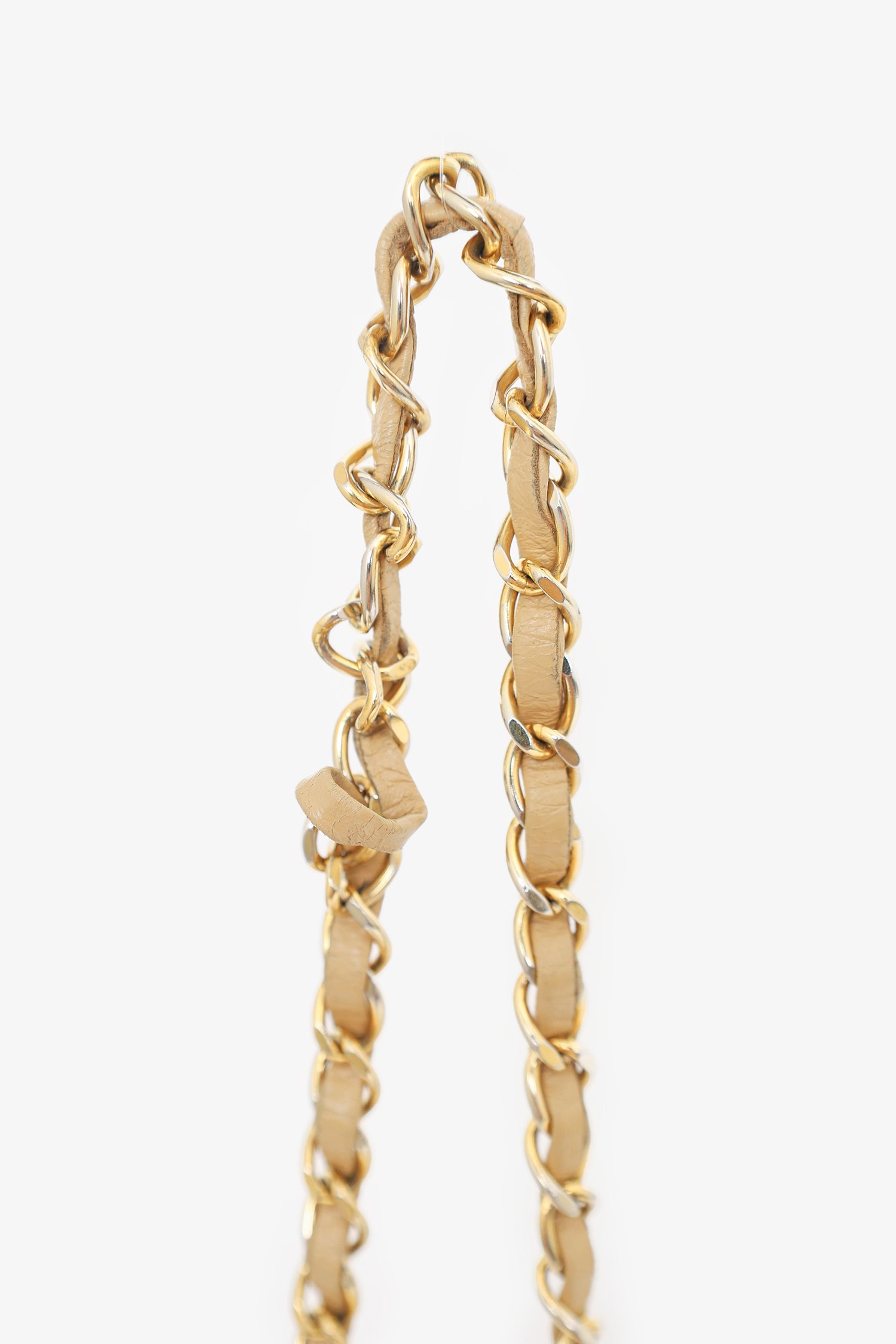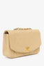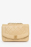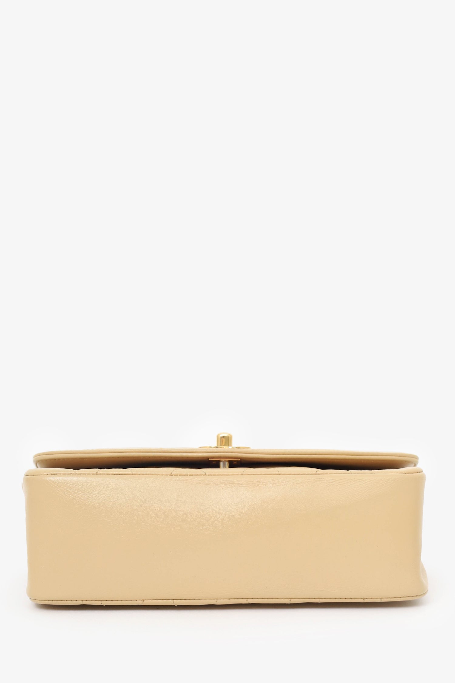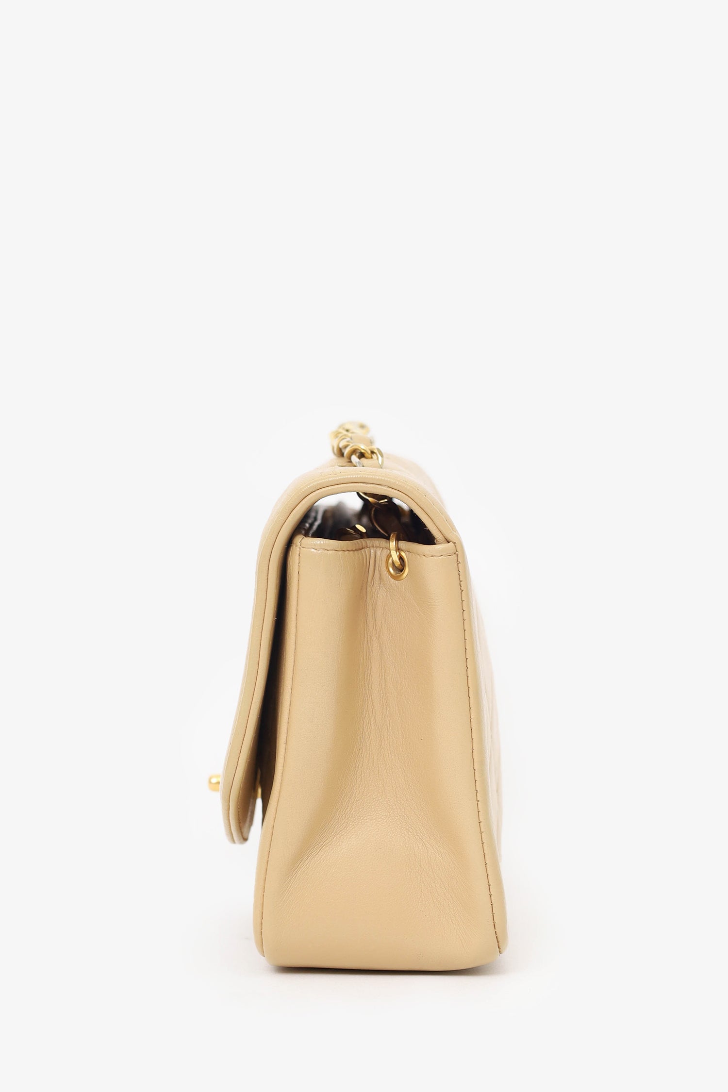 Pre-Loved Chanel™ Beige Lambskin Small Diana Flap Bag. Front fold-over flap with turn-lock closure. Single chainlink shoulder strap. Quilted exterior. Leather-lined interior. 2 Interior pockets; 1 slip and 1 zip. Gold-tone hardware. Tonal stitching.