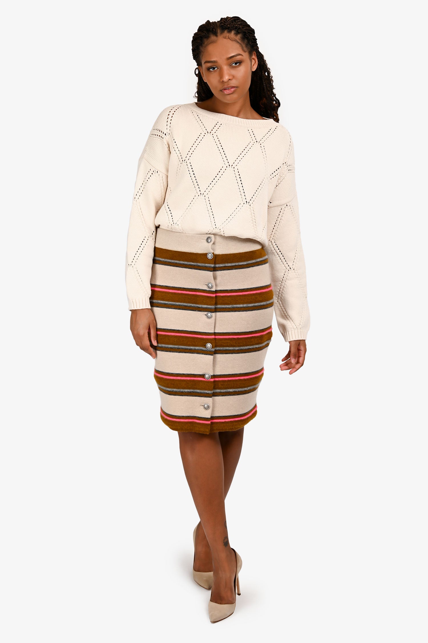 Refresh availabilityPre-Loved Chanel™ Beige/Multi Striped Knit Skirt. Cashmere. Front antiqued silver-tone button closure. Pink, beige, blue, and grey-tone stripes. Tonal stitching.