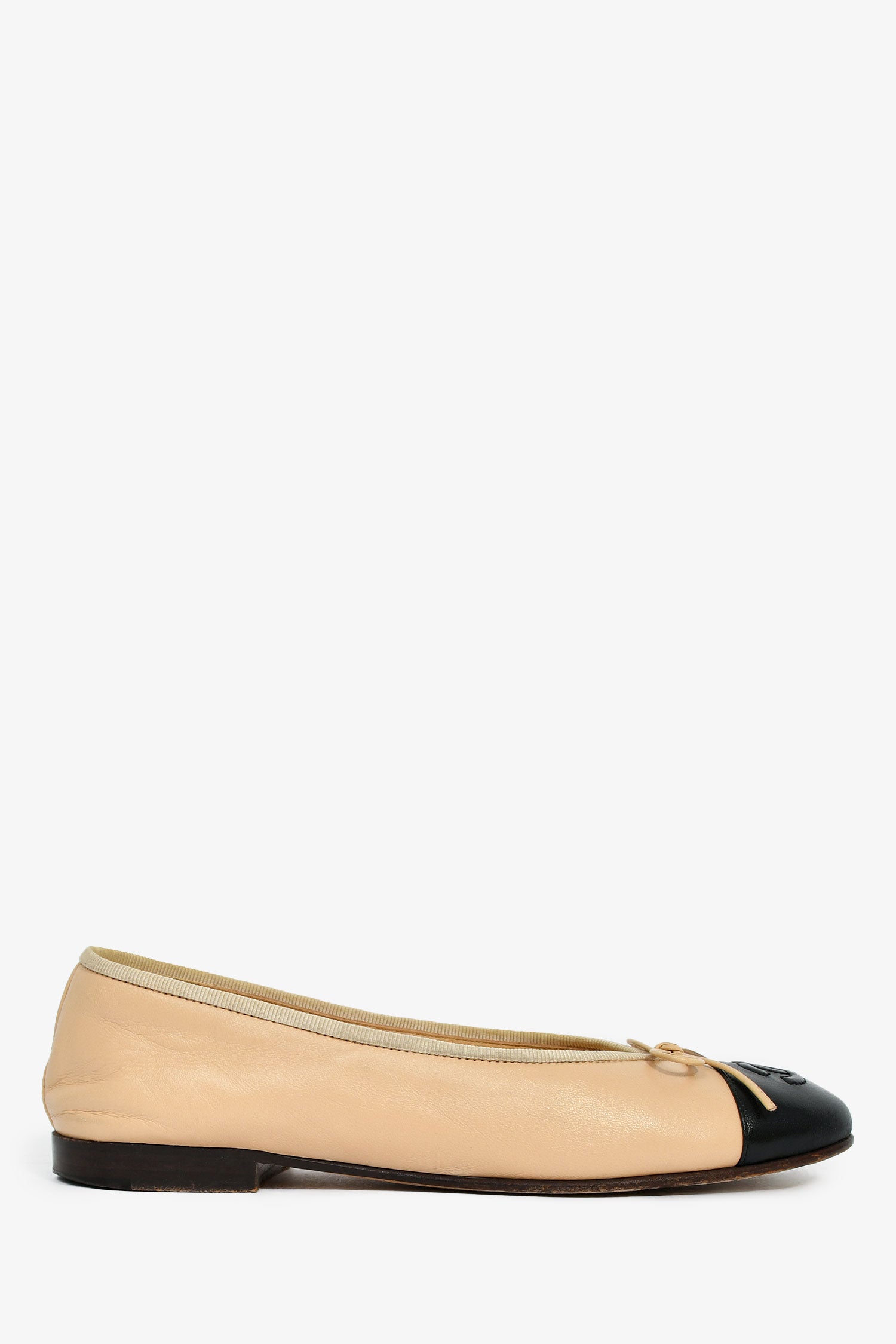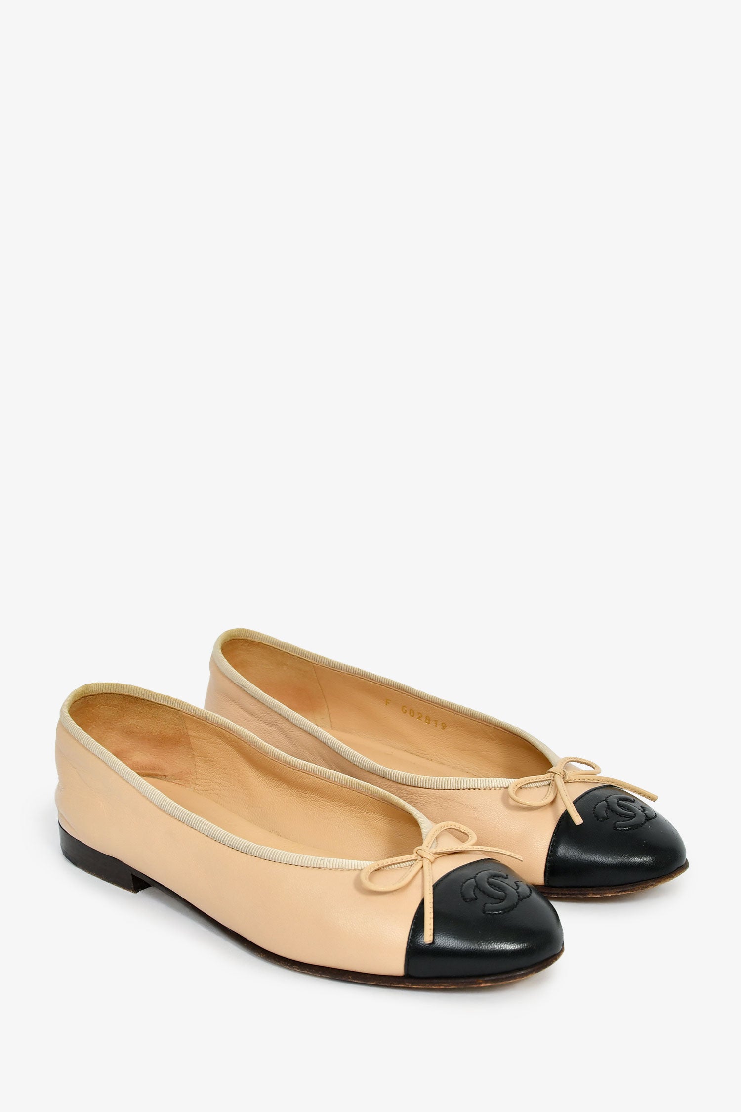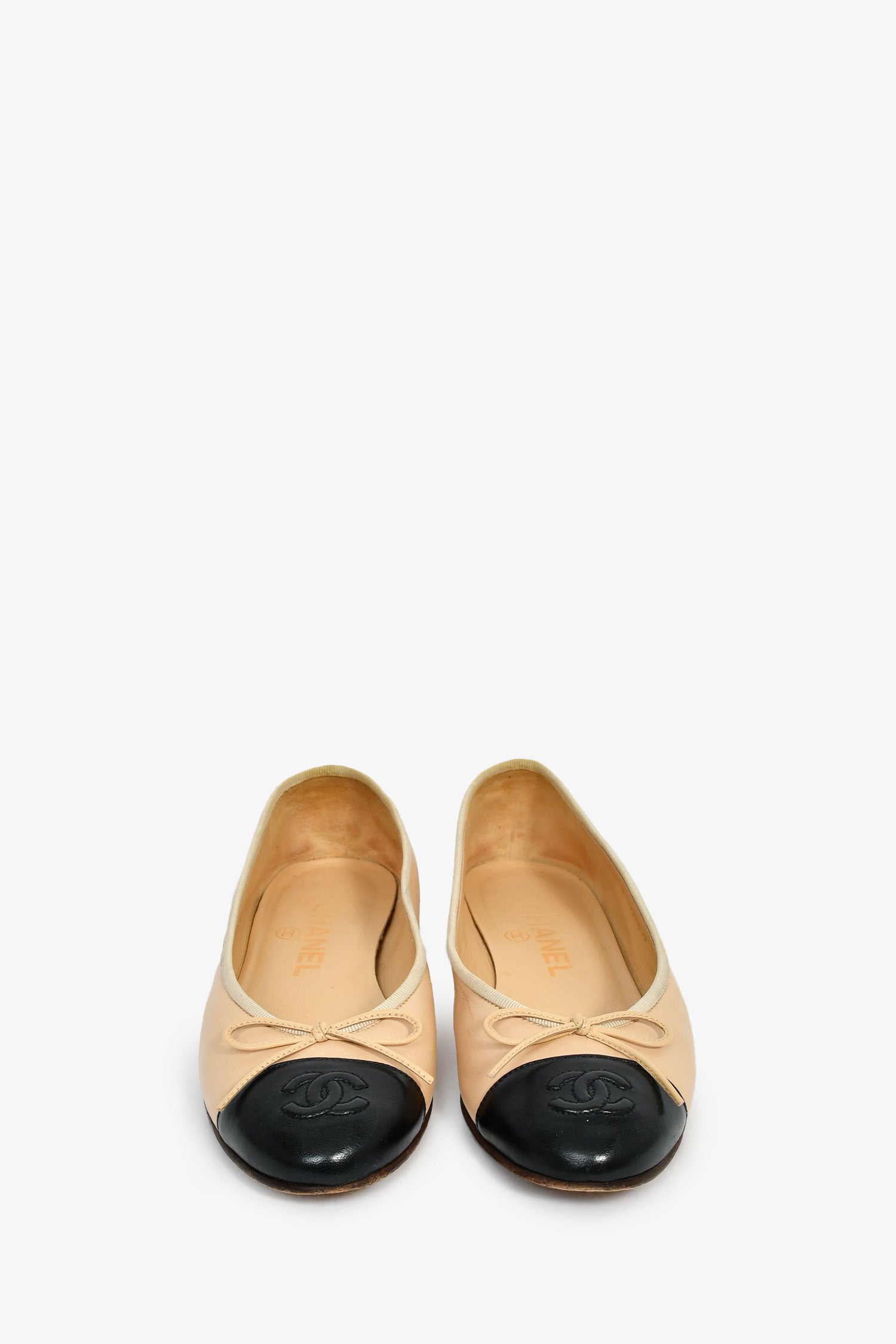 Refresh availabilityPre-Loved Chanel™ Beige/Black Leather CC Ballet Flats. Slip-on. Almond toe. Tonal stitching.