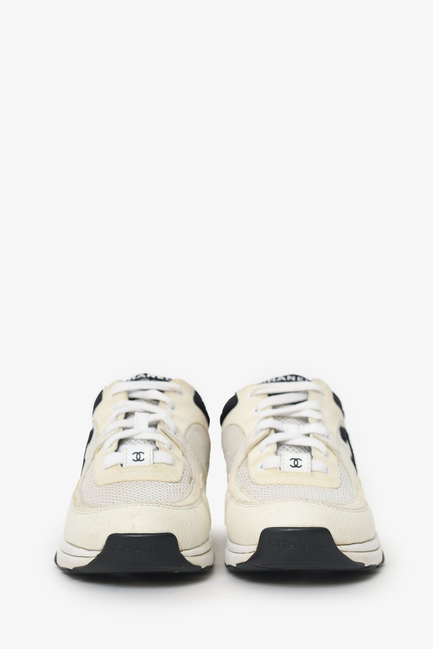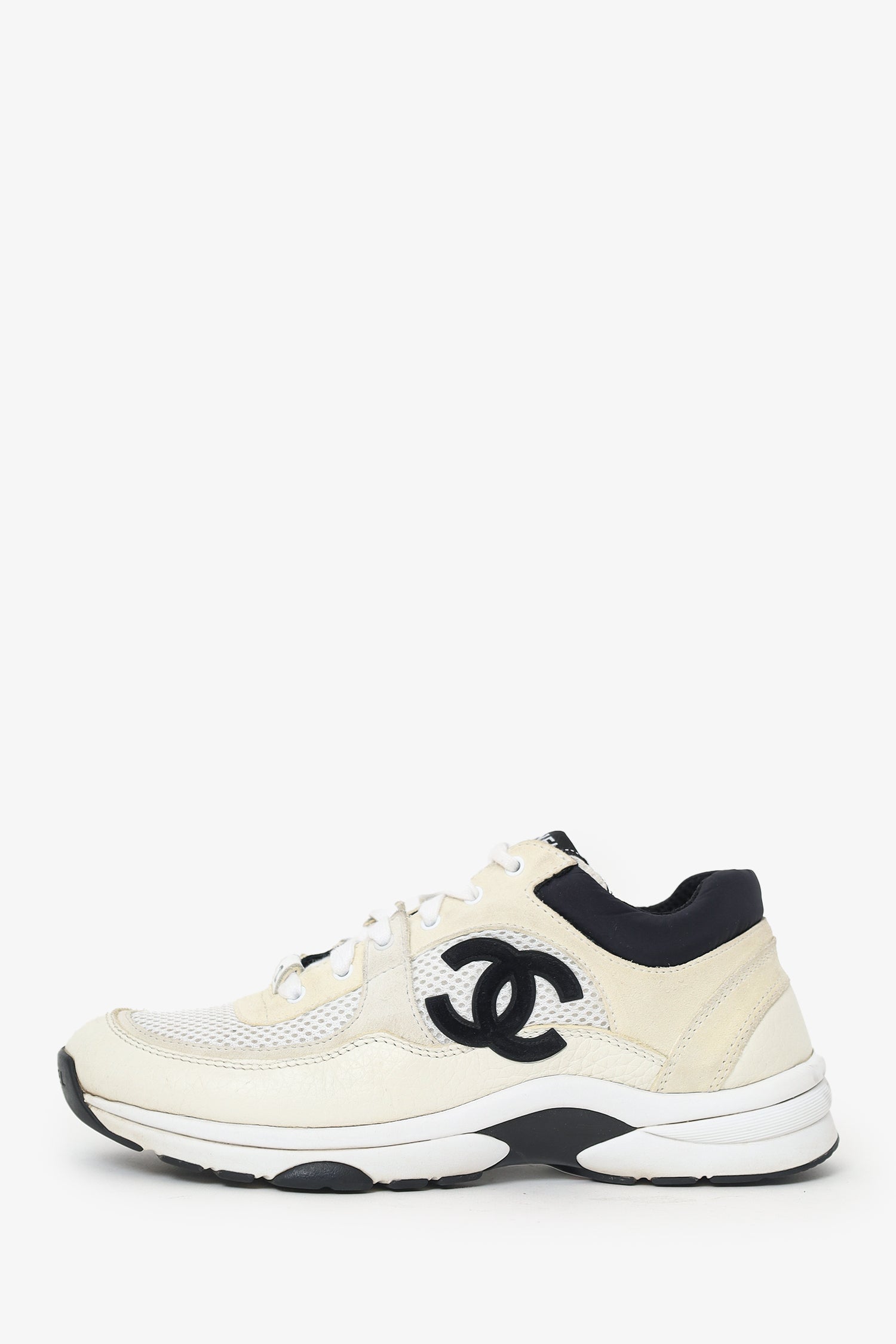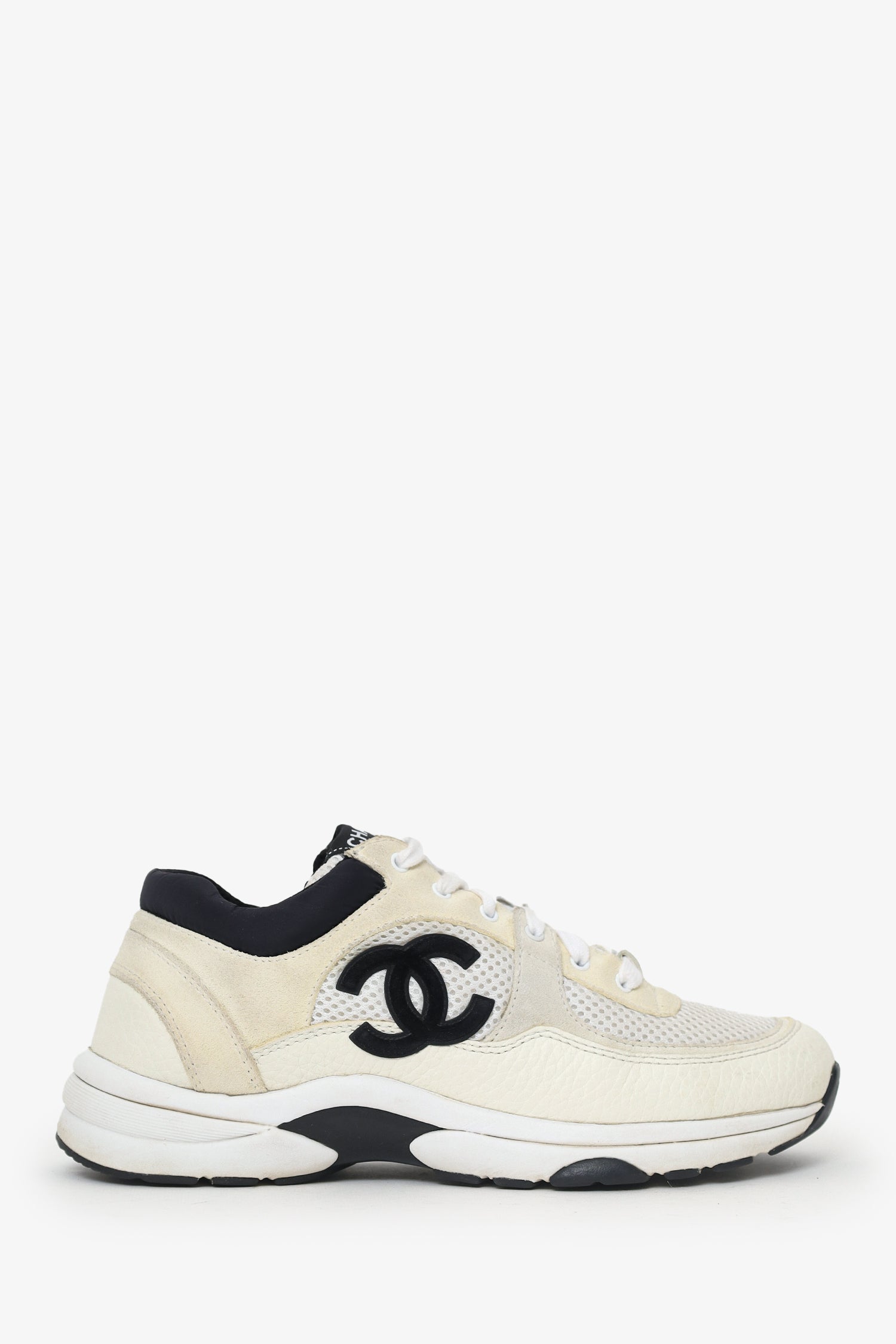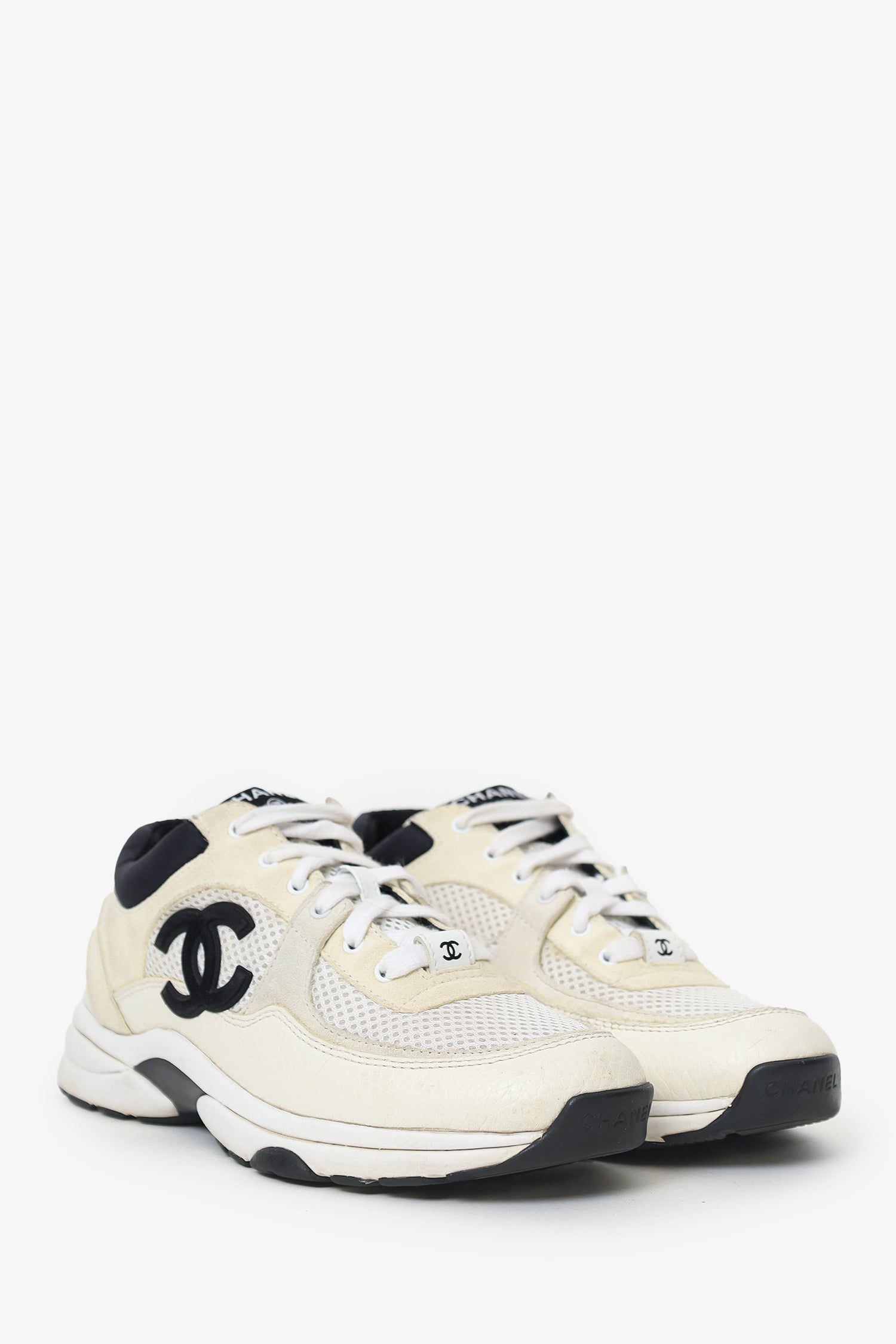Refresh availabilityPre-Loved Chanel™ Beige/Black Leather/Suede CC Chunky Sneaker. Slip-on. Round toe. Front lace-up closure. Tonal stitching.
